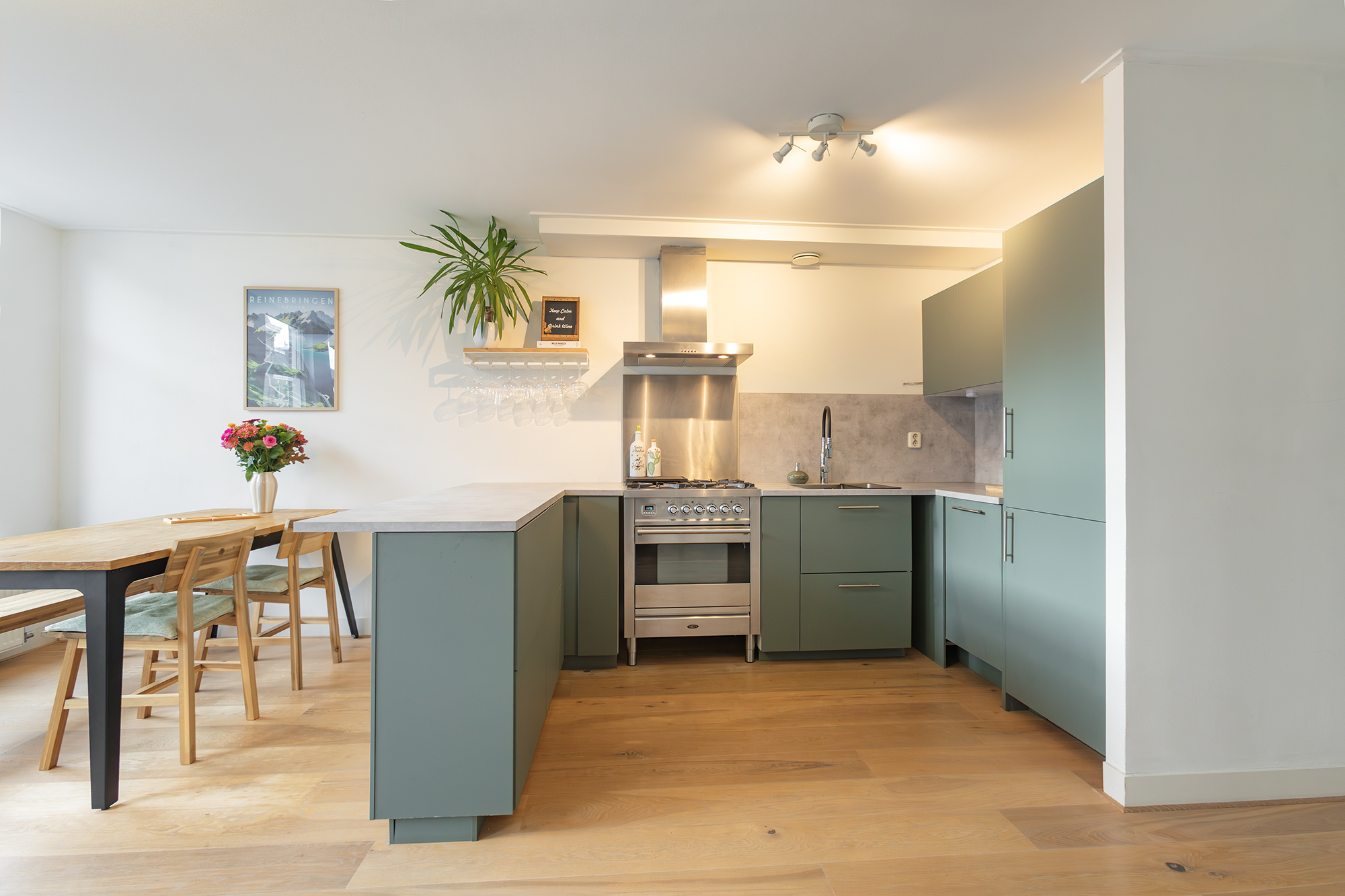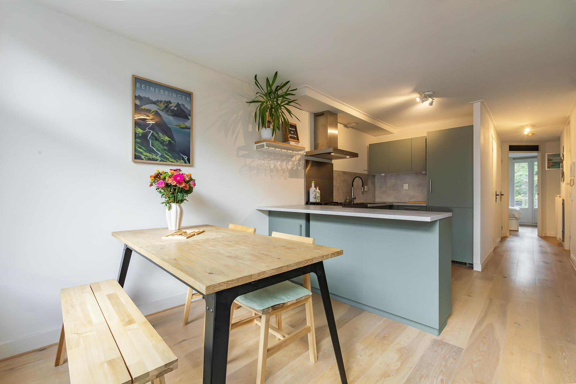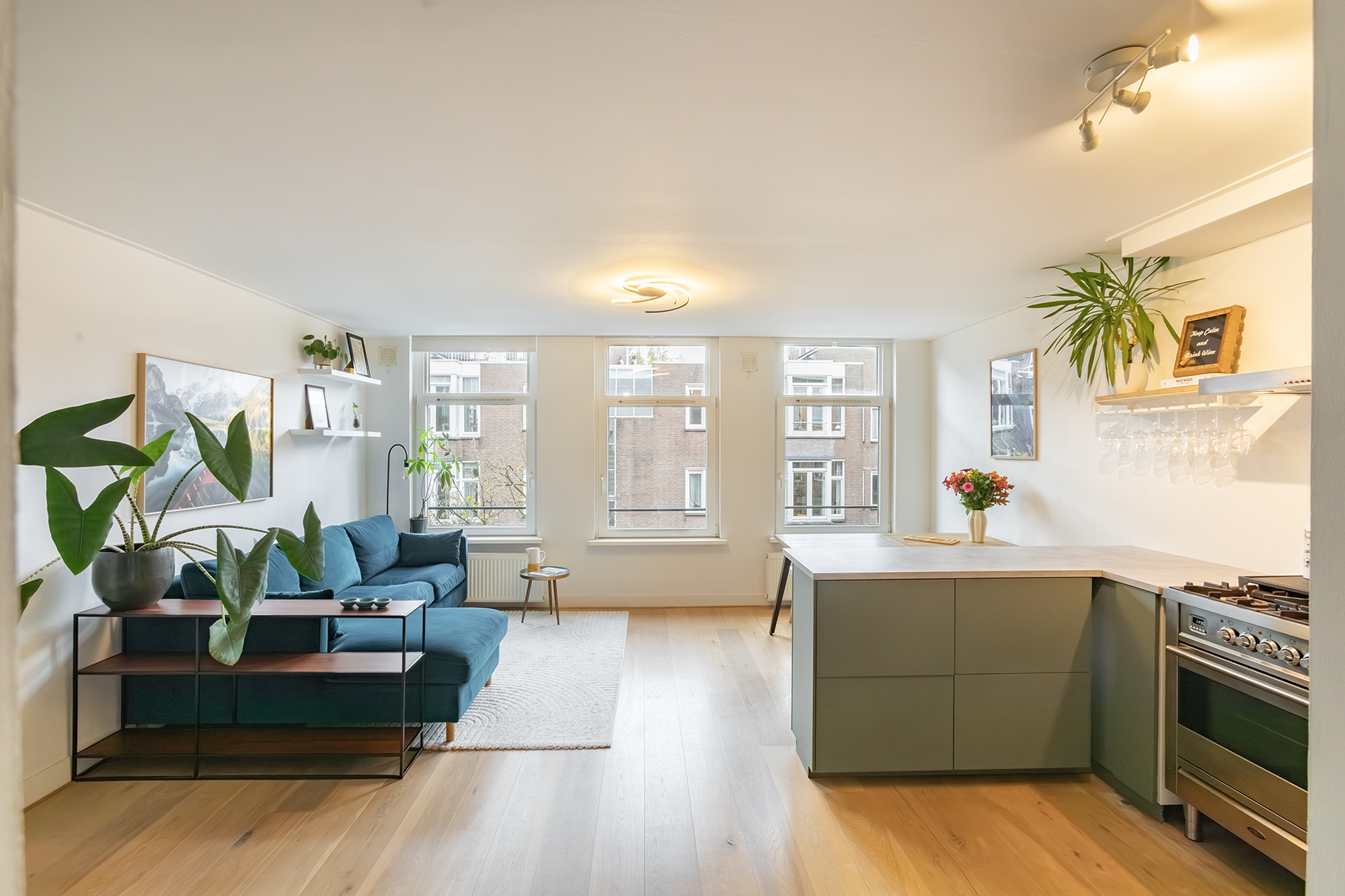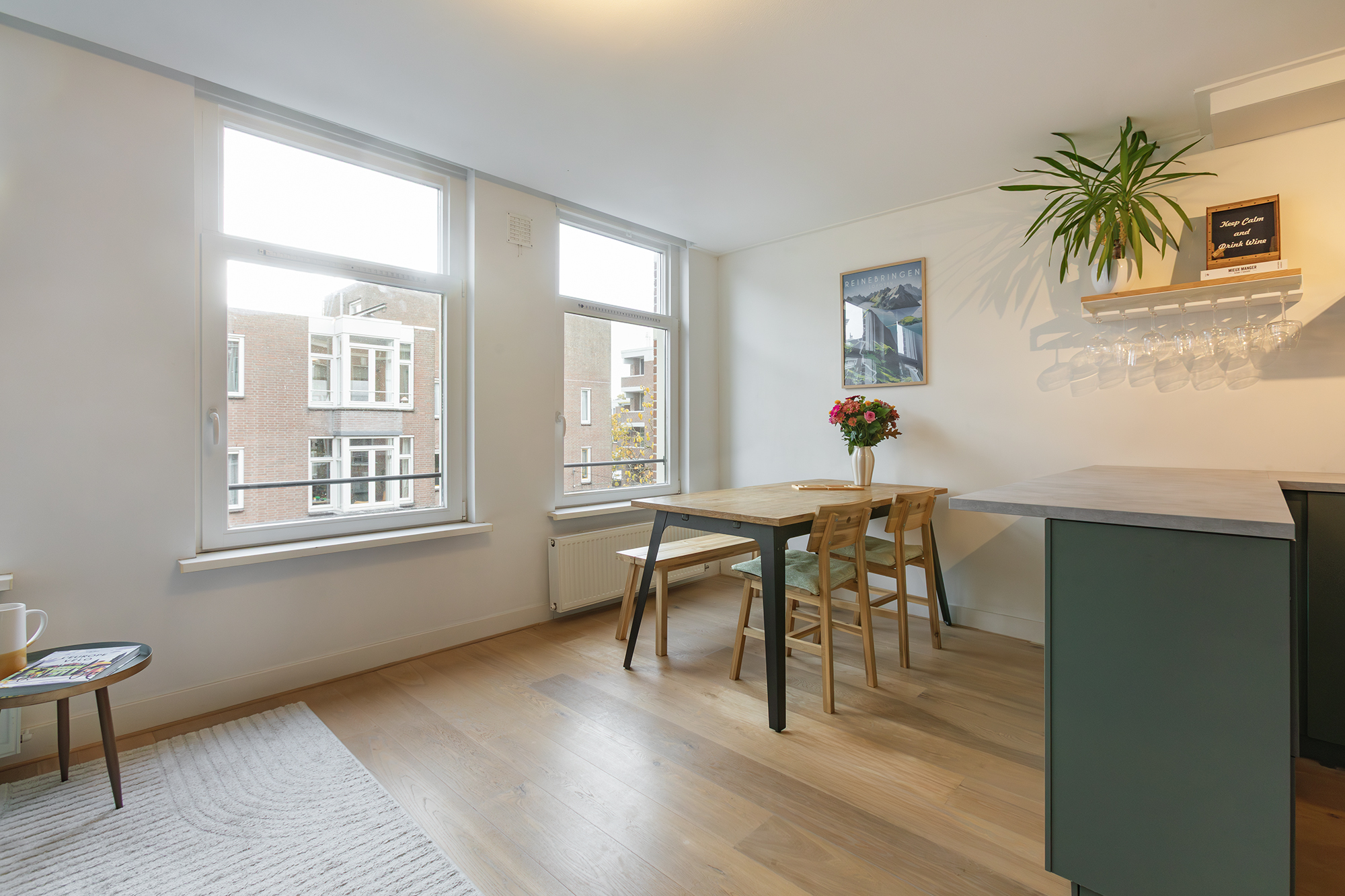 De lichte woonkamer ligt aan de voorzijde en heeft een moderne open keuken (2021) voorzien van inbouwapparatuur. De ruimte is smaakvol afgewerkt met een fraaie lamelparketvloer en een prettige lichtinval dankzij de grote raampartijen.