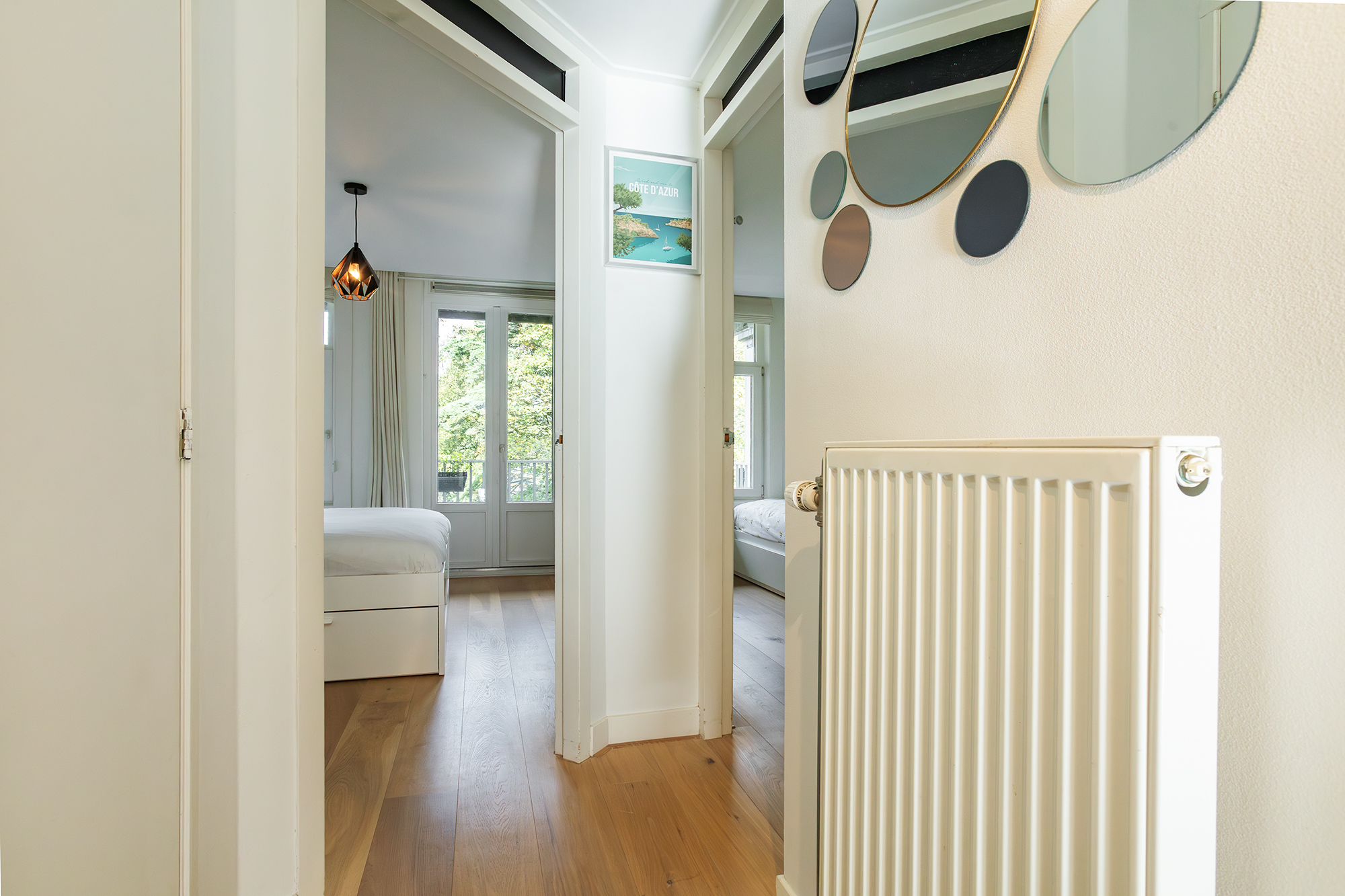 Aan de achterzijde bevinden zich twee ruime slaapkamers, waarvan één toegang biedt tot het balkon met uitzicht op het groen richting de Houtrijkstraat.