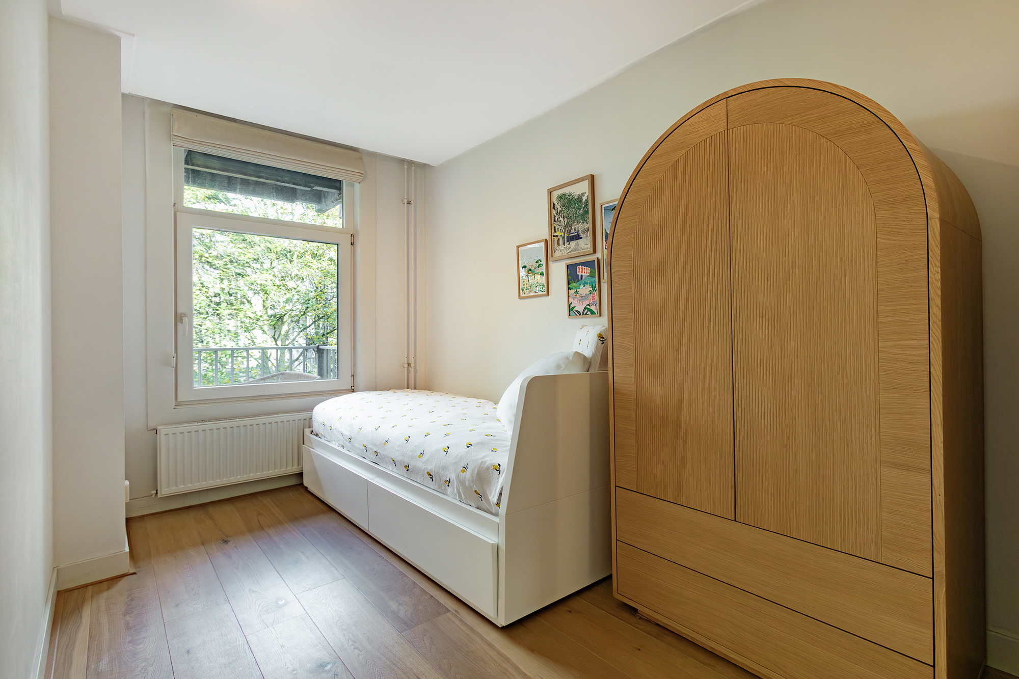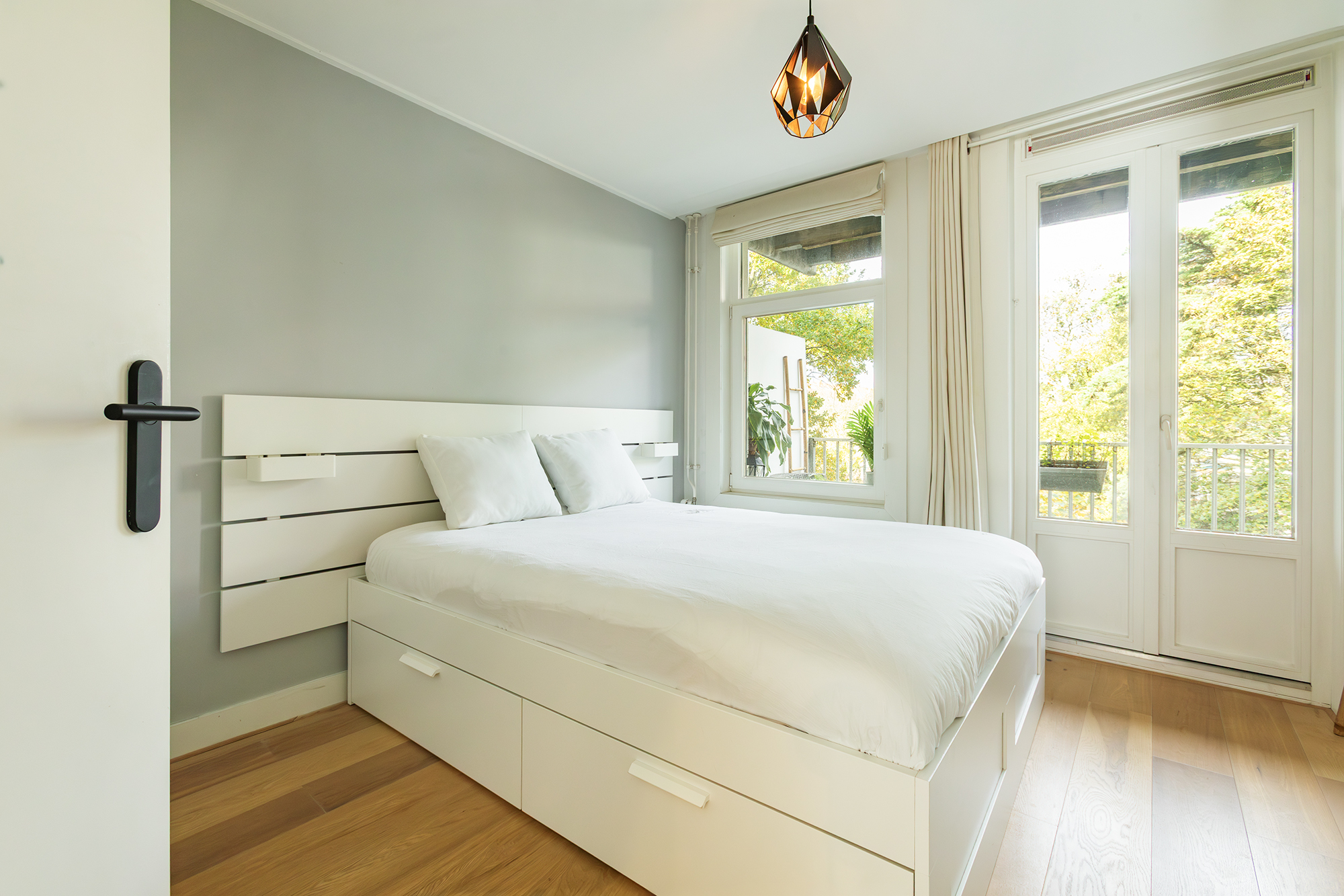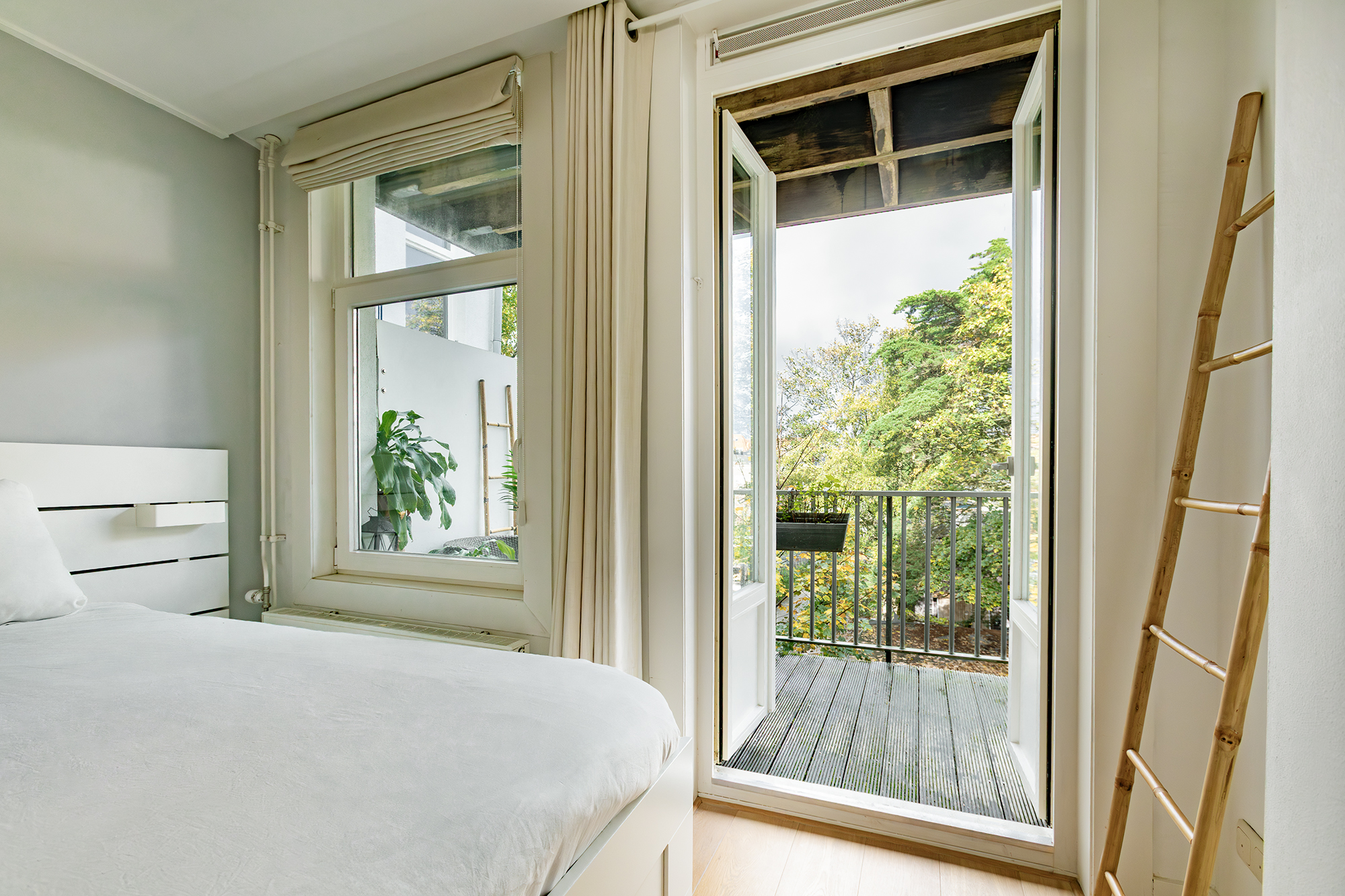 The deep balcony (8 m2) at the quiet rear overlooks lush greenery, a delightful spot for your morning coffee or an evening drink in peace.