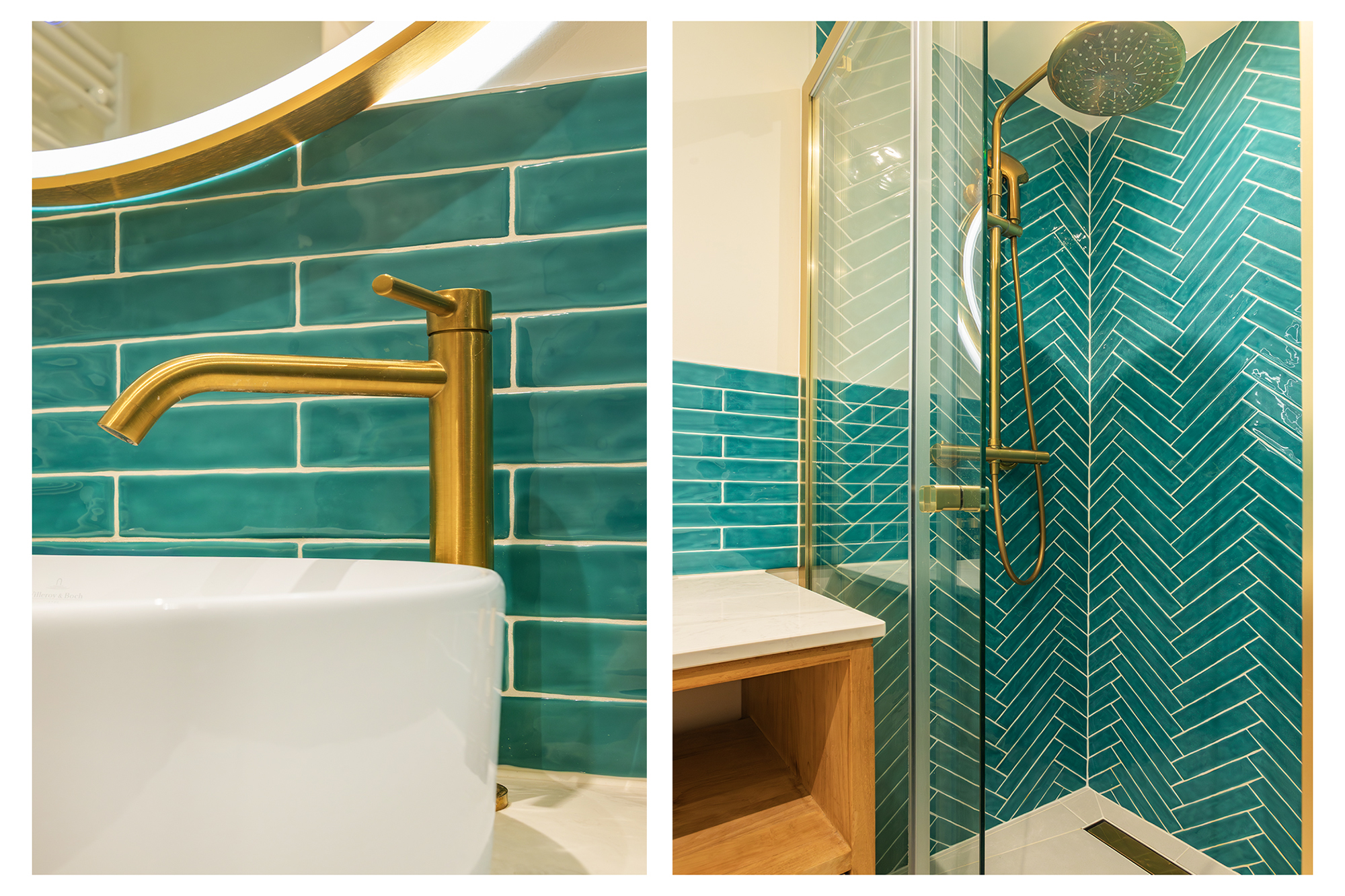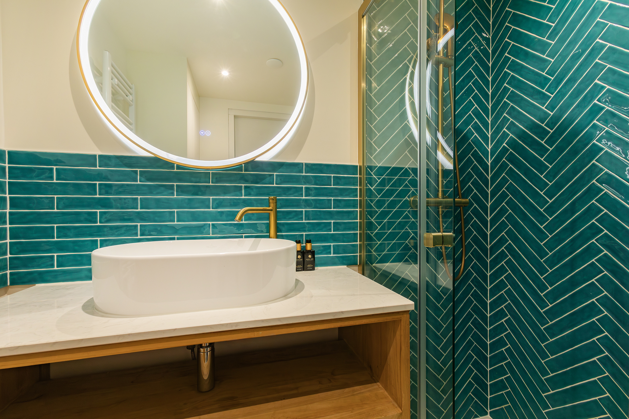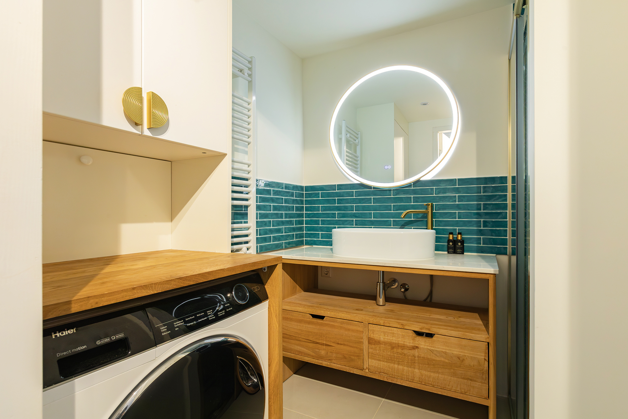 The modern bathroom includes a shower, washbasin unit and connection for a washing machine. There is also a separate toilet with a small sink and a built-in cupboard housing the central heating system. The current owner has combined colour and design beautifully, resulting in a warm and inviting interior.