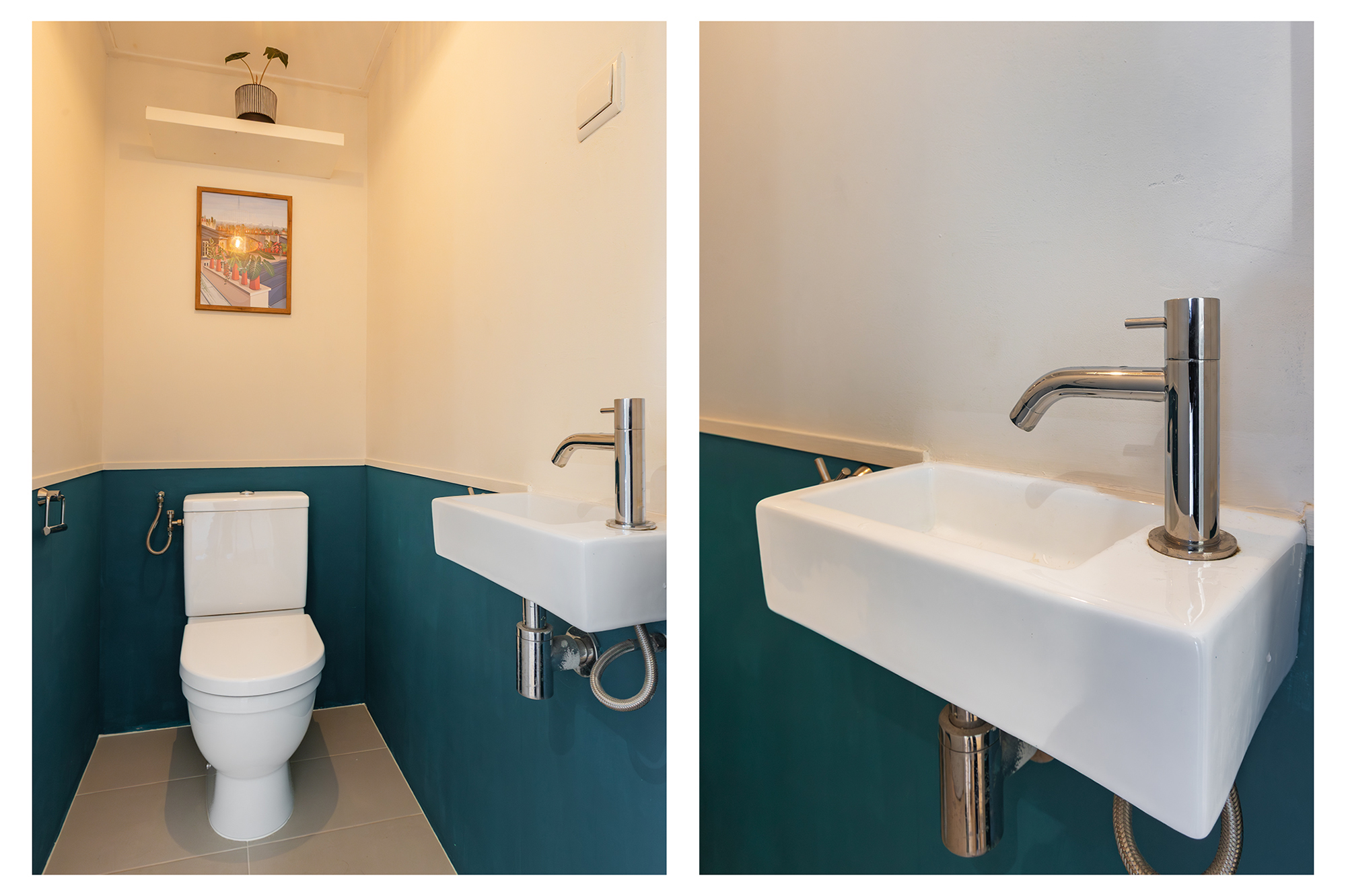 De trendy badkamer is voorzien van een douche, wastafelmeubel en aansluiting voor de wasmachine. Daarnaast is er een separaat toilet met fonteintje en een kast met de cv-installatie. Verkoper heeft dit met kleur en smaak weten te combineren tot een mooi modern en warm geheel.