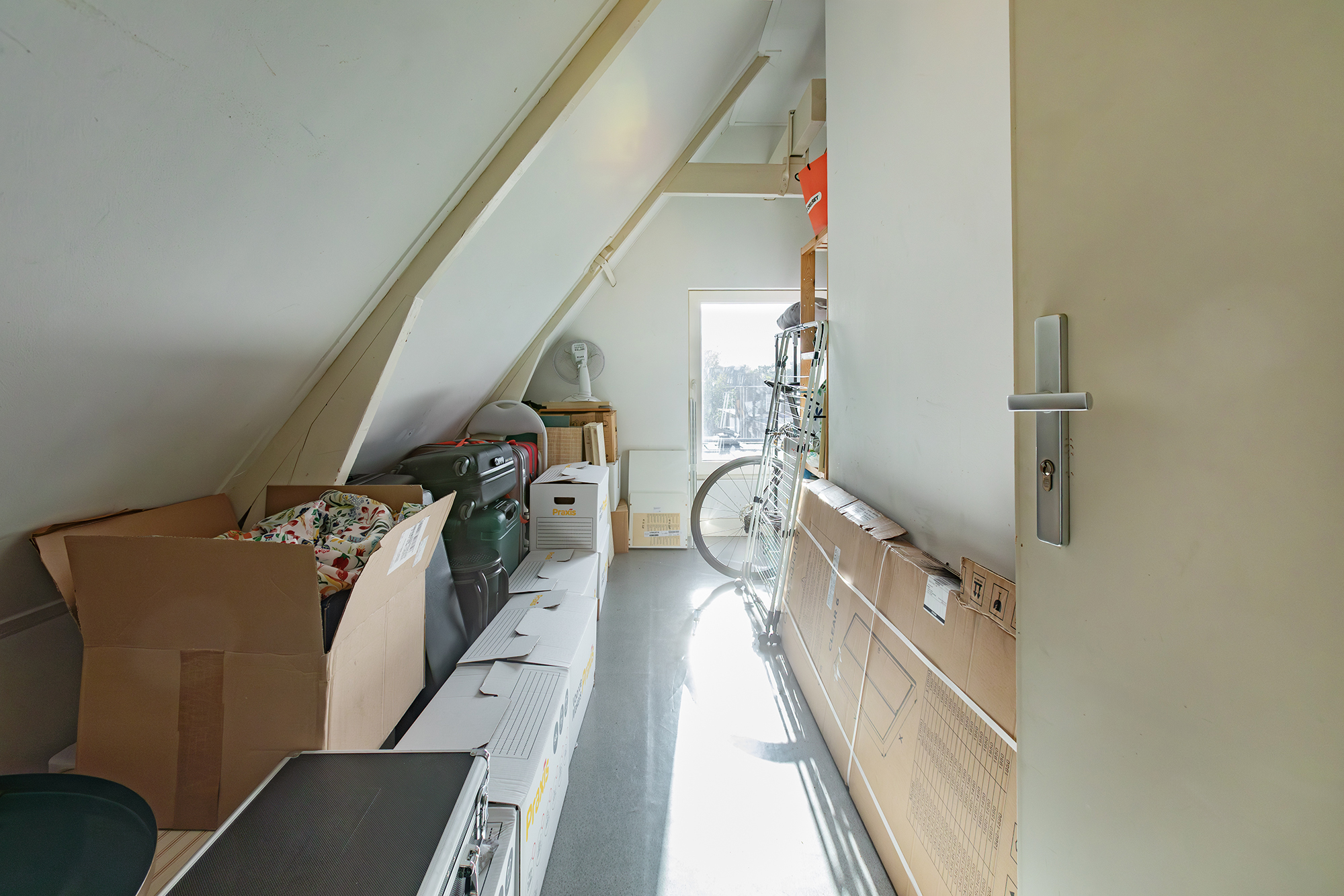 Op de vierde verdieping (zolder) bevindt zich een ruime zolderberging met raam, ideaal voor fietsen, koffers of seizoensspullen.