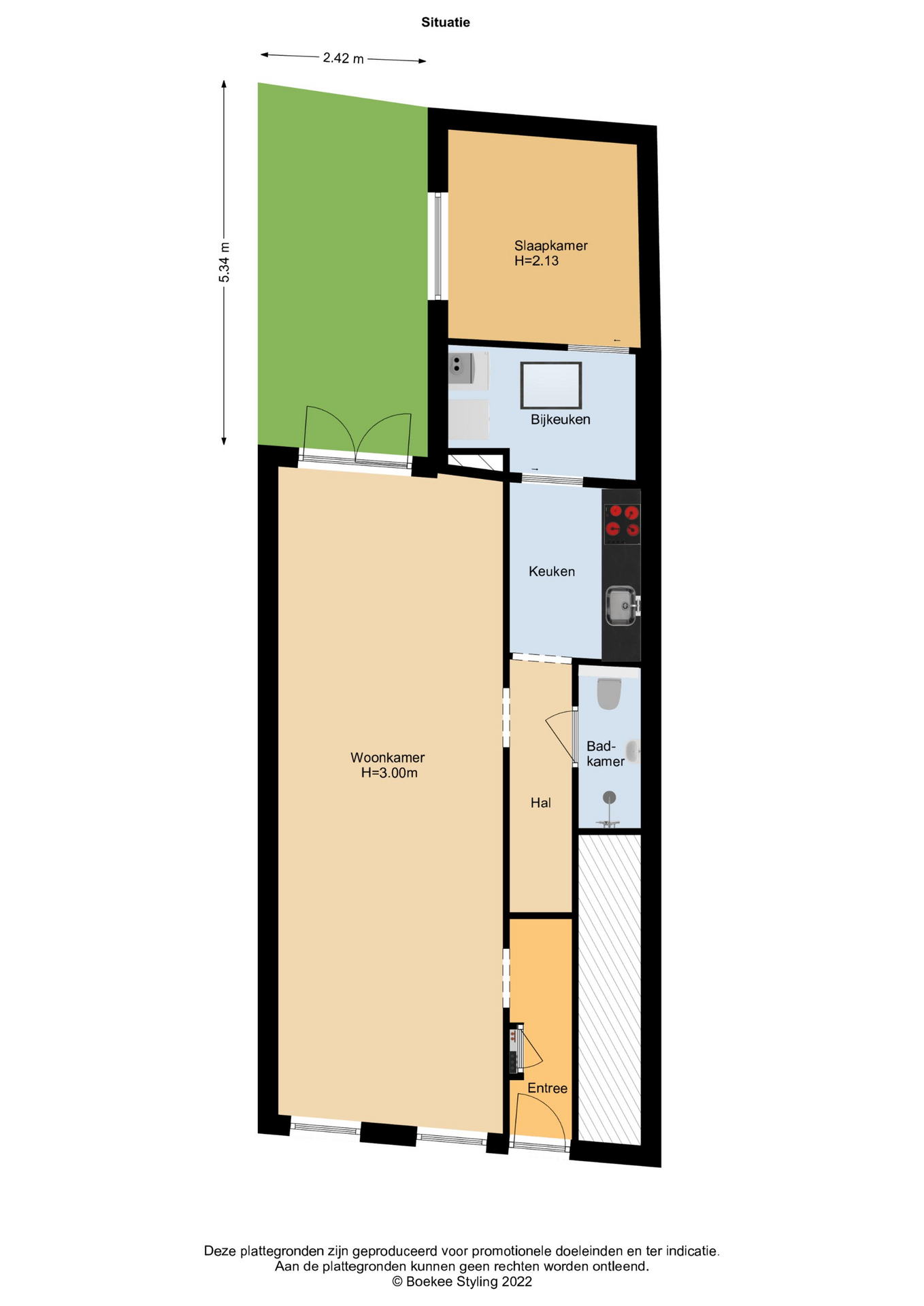 Het woonoppervlak bedraagt circa 60 m², exclusief de patio. Meetrapport conform NEN2580 is beschikbaar.