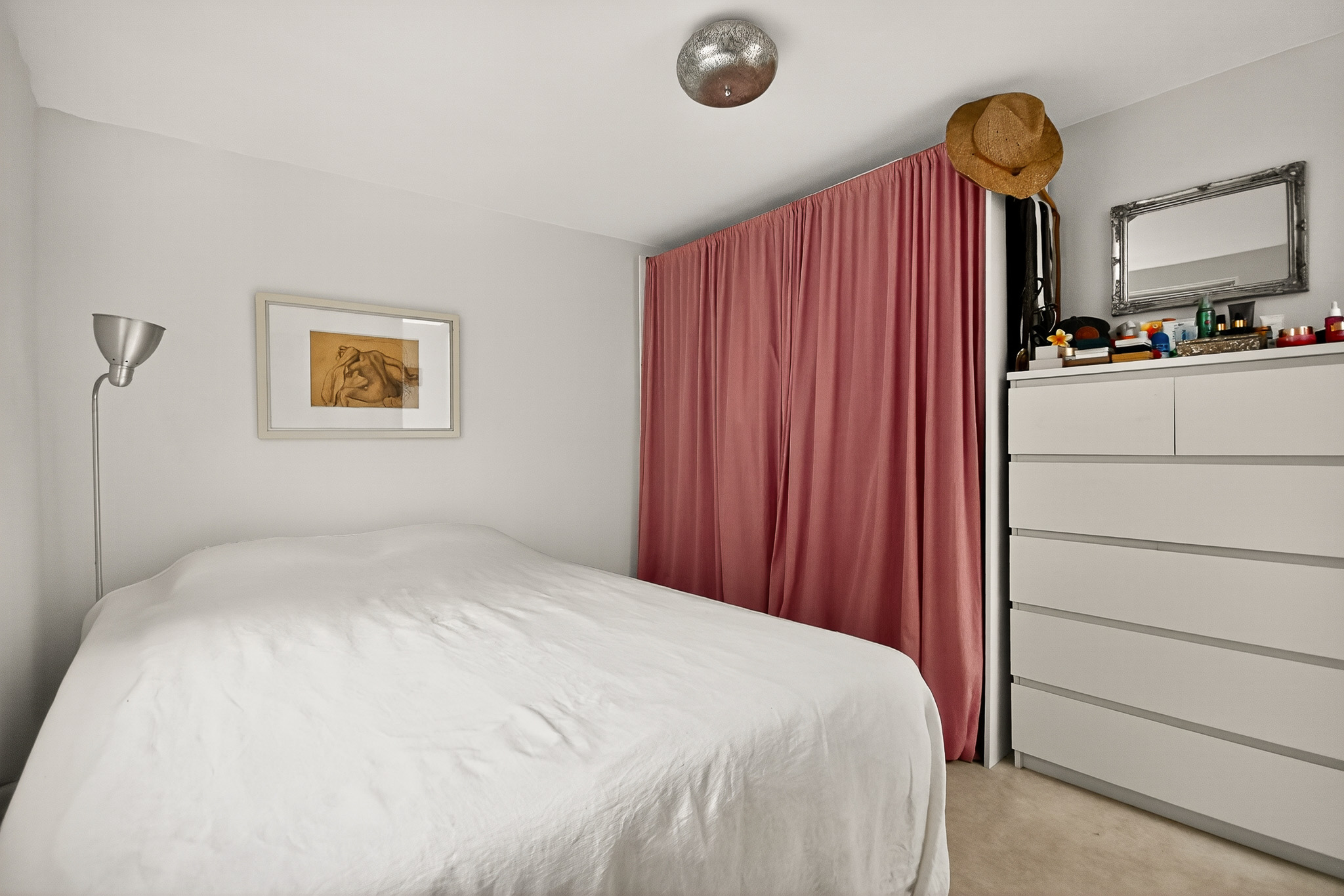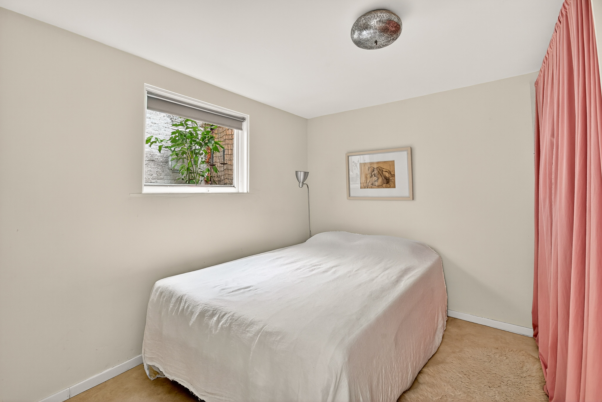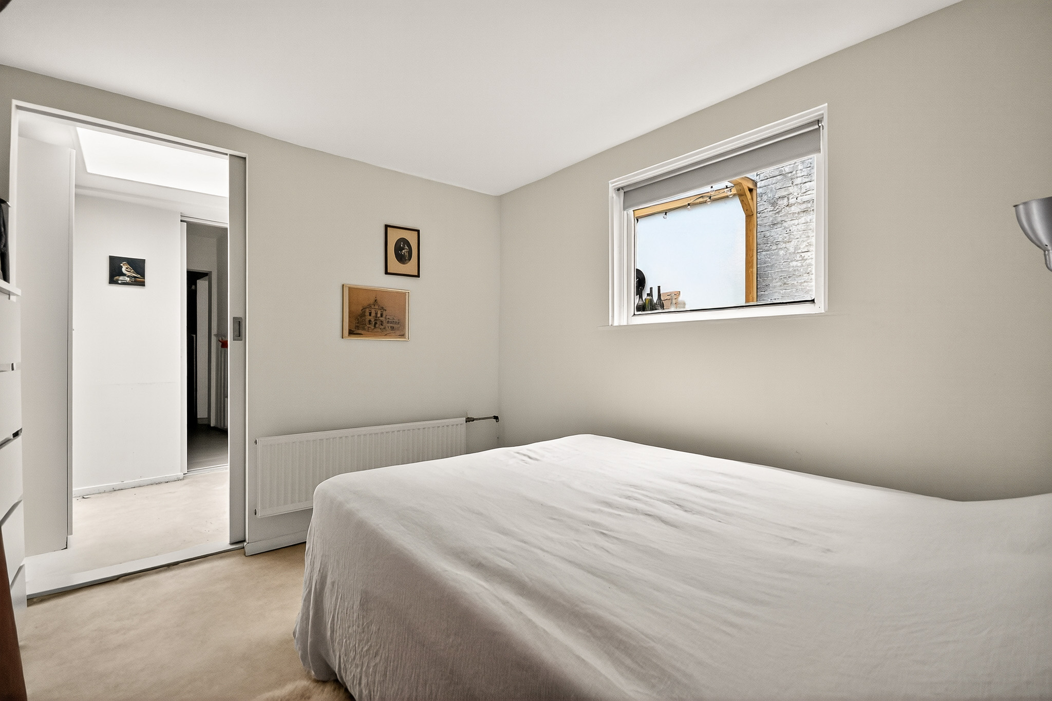 Aan de rustige achterzijde ligt de slaapkamer met uitzicht op de patio.