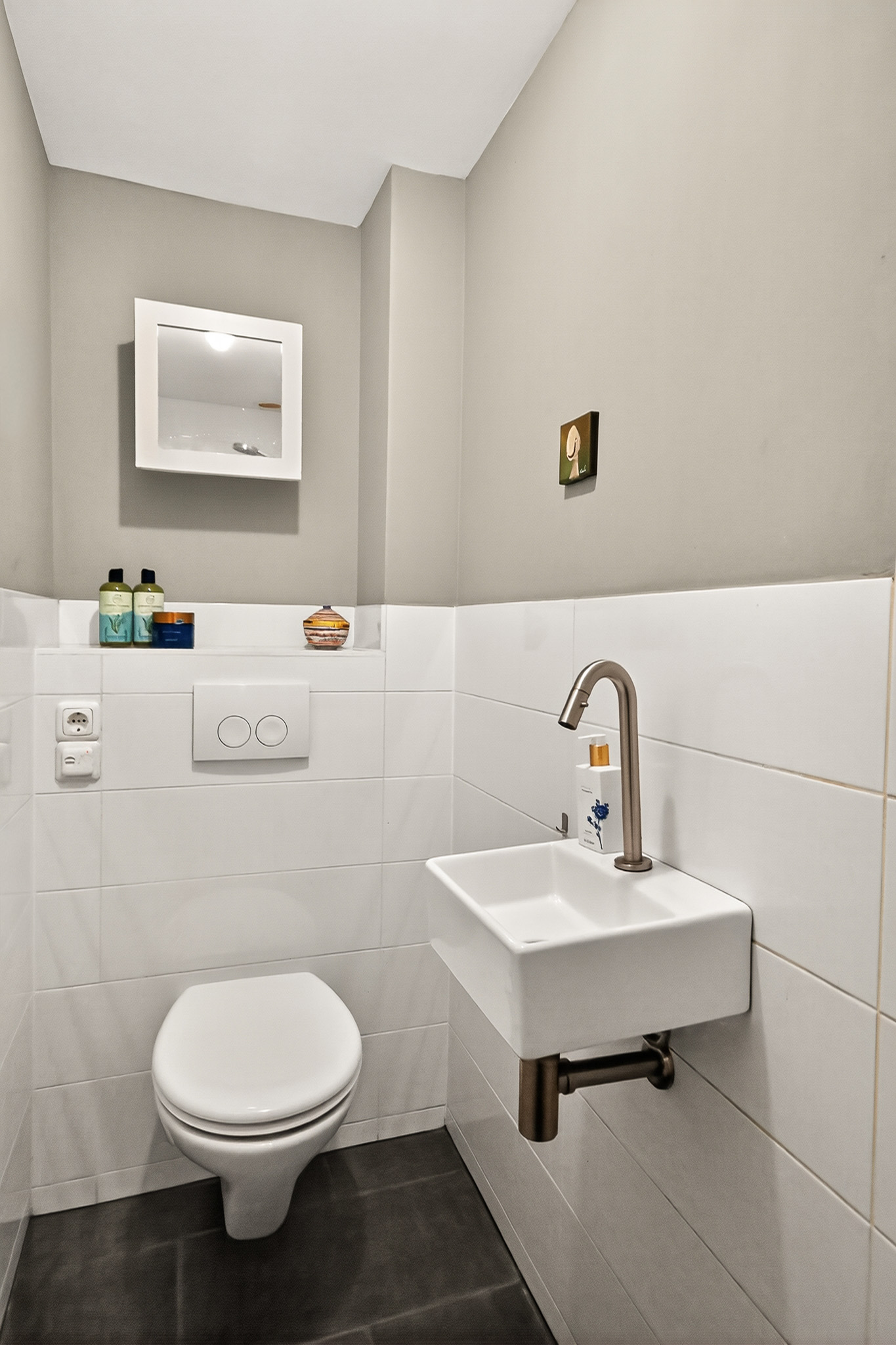 De badkamer is compact maar functioneel, voorzien van een douche, toilet, wastafel en vloerverwarming.