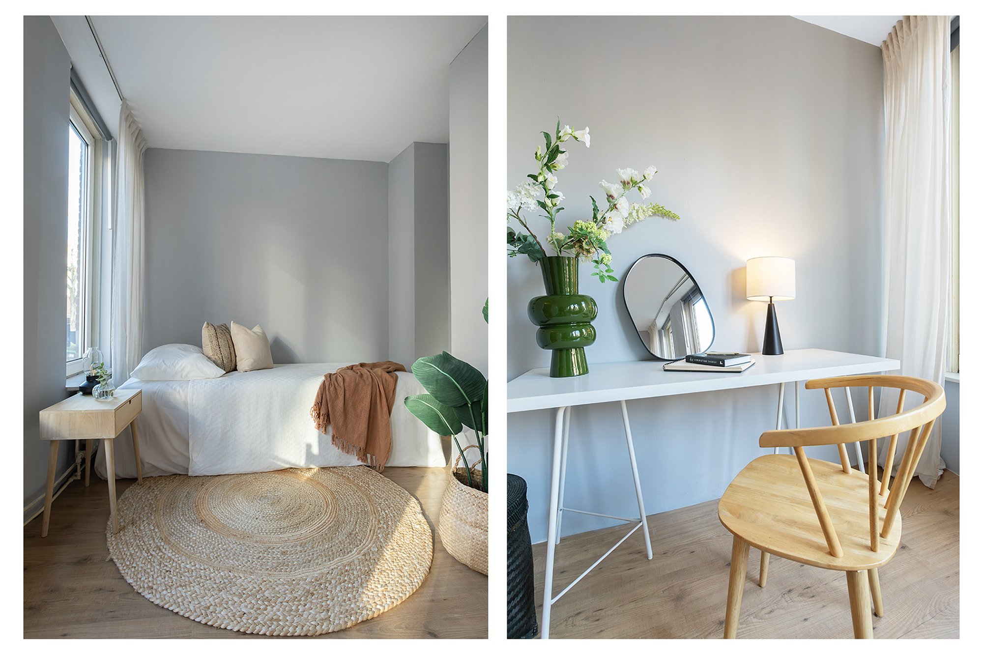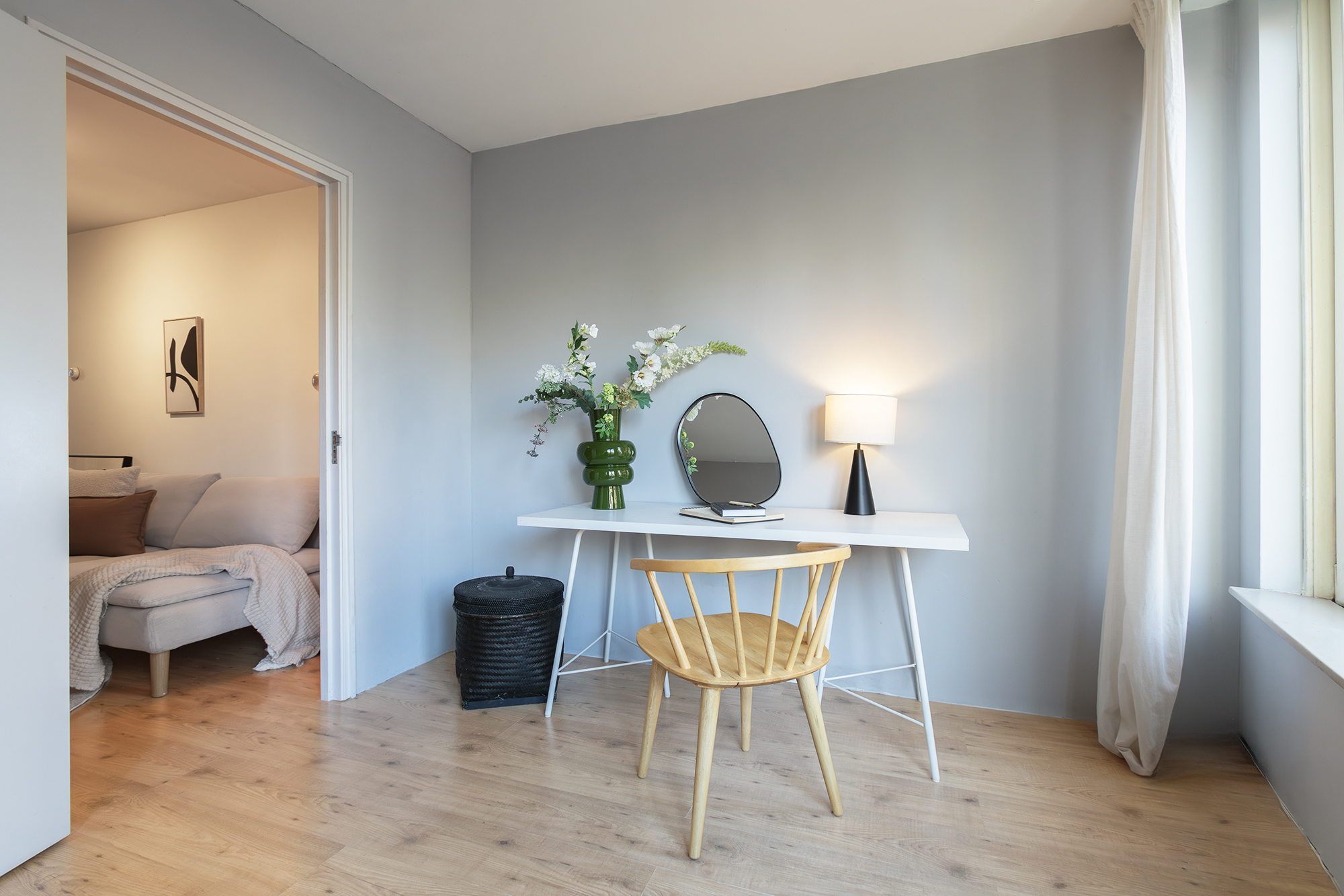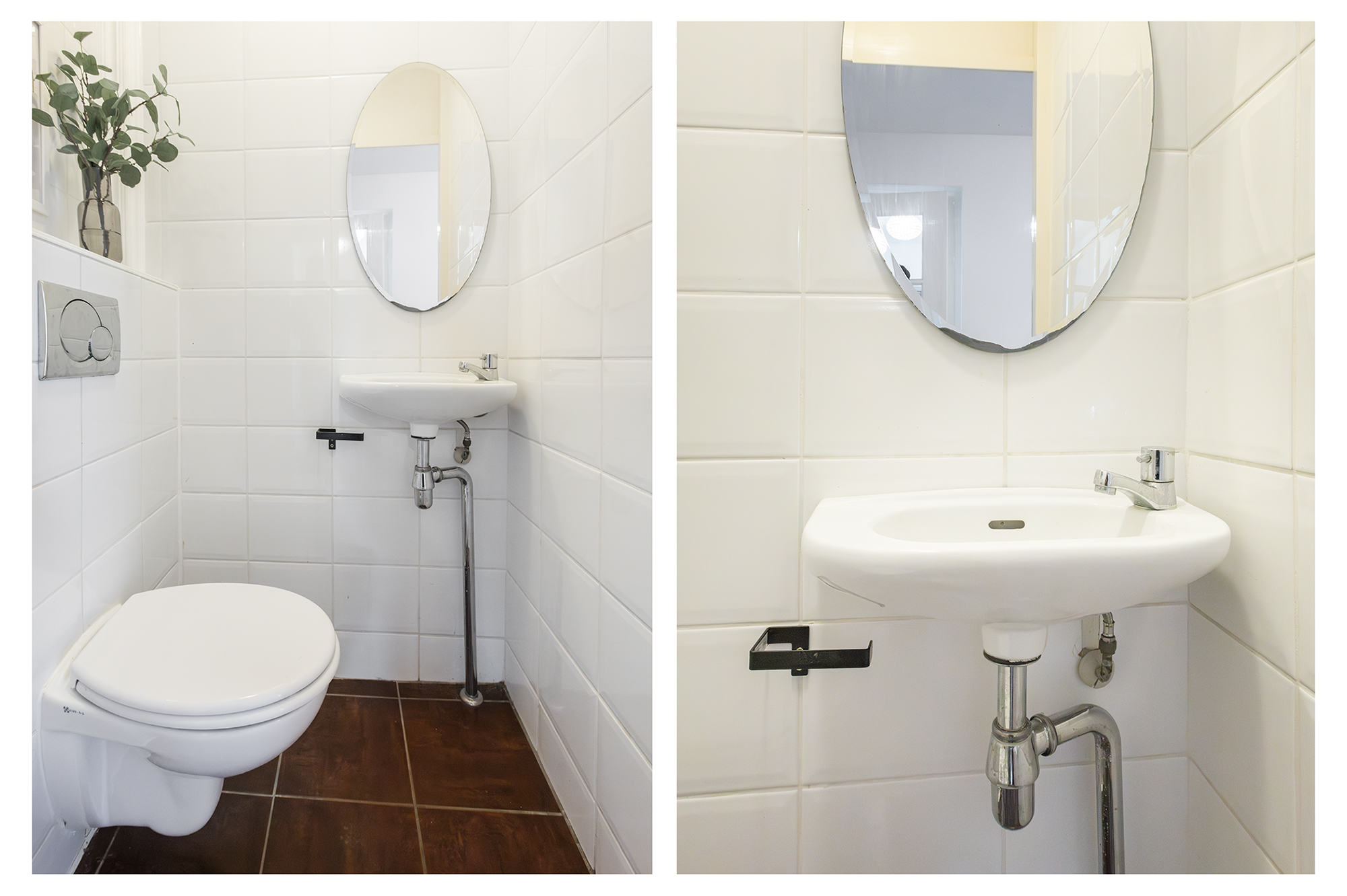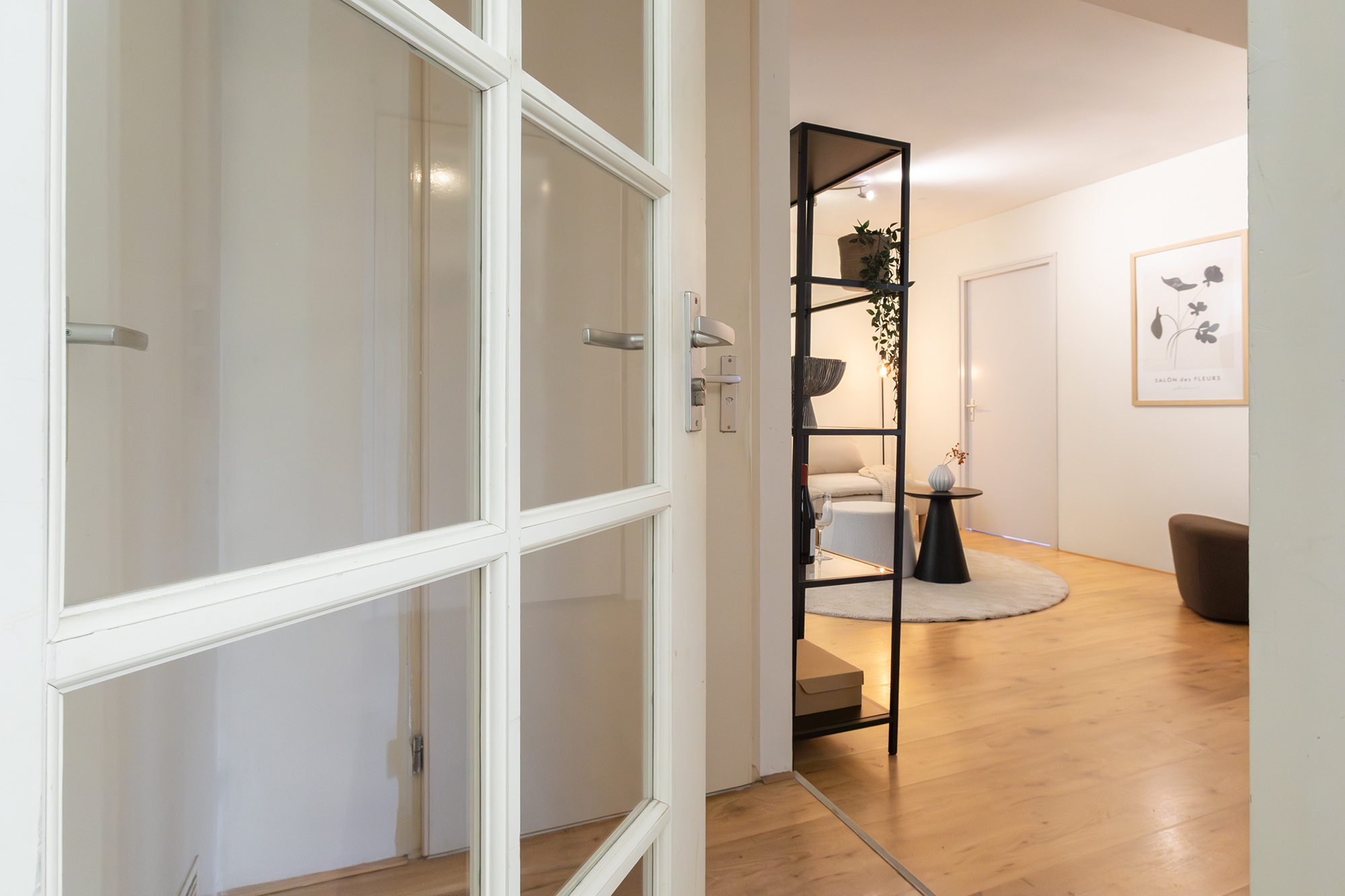 The apartment has three bedrooms, divided between the front and rear of the home. The two largest bedrooms are located at the front, overlooking Boeroestraat. The smaller bedroom, still large enough to fit a double bed, is situated quietly at the back. Ideal as a child’s room, workspace or guest room — especially when using the second bathroom. The main bathroom is centrally located and equipped with a shower, sink and potential connections for the washing machine and dryer. There is also a separate toilet in the hall. In the hall you’ll also find an extra cupboard with space for the washing machine and a dryer.