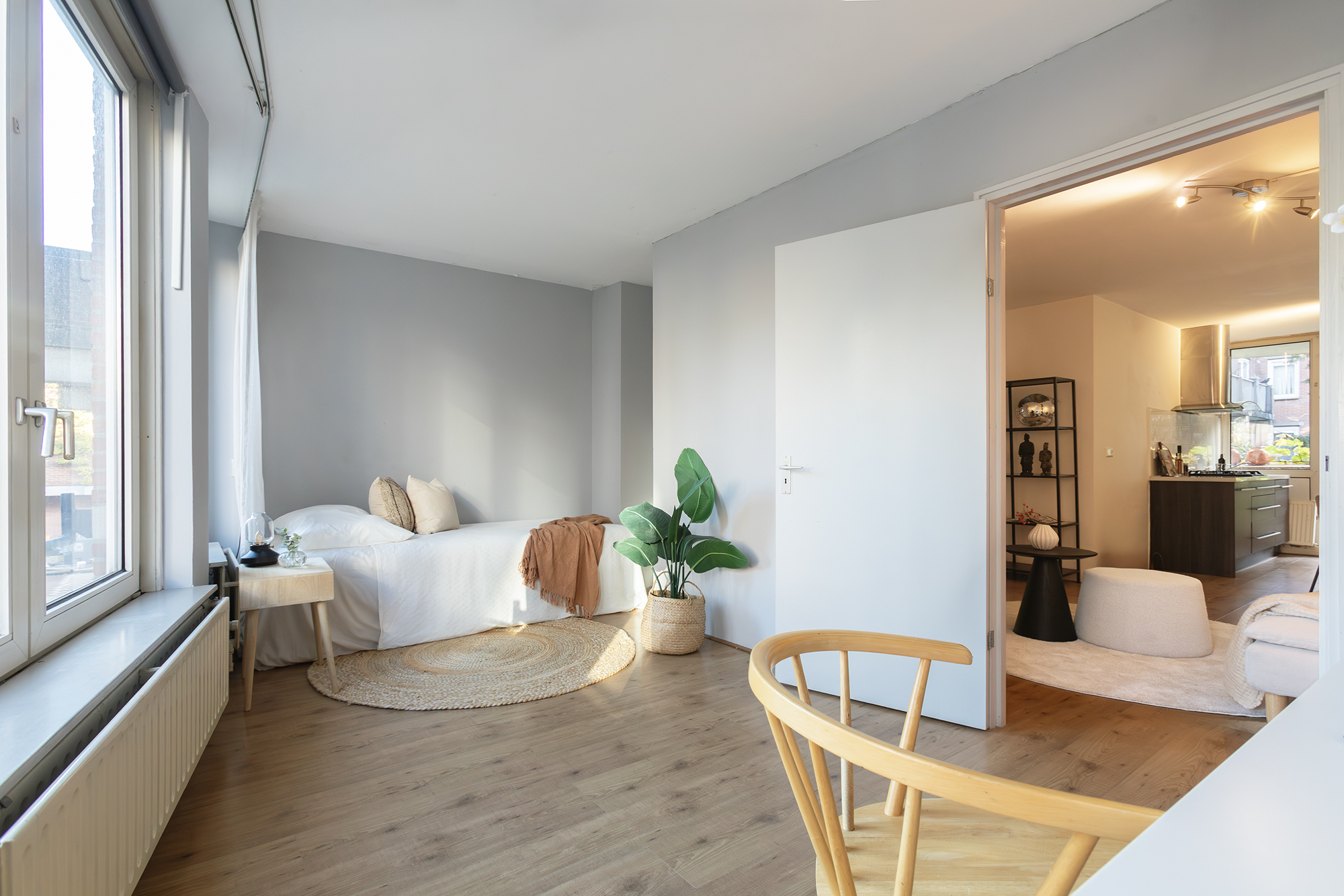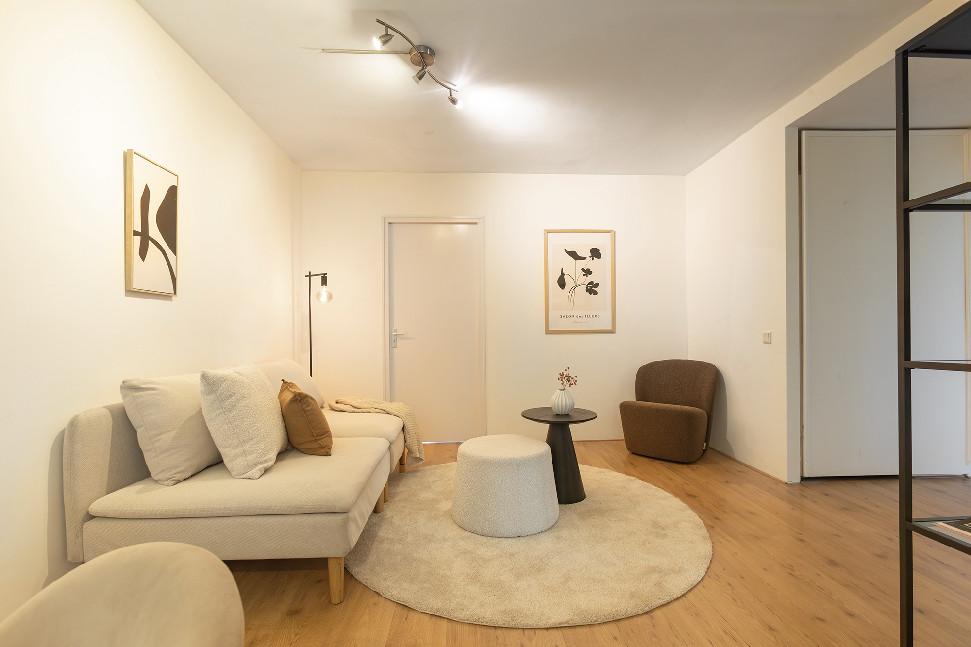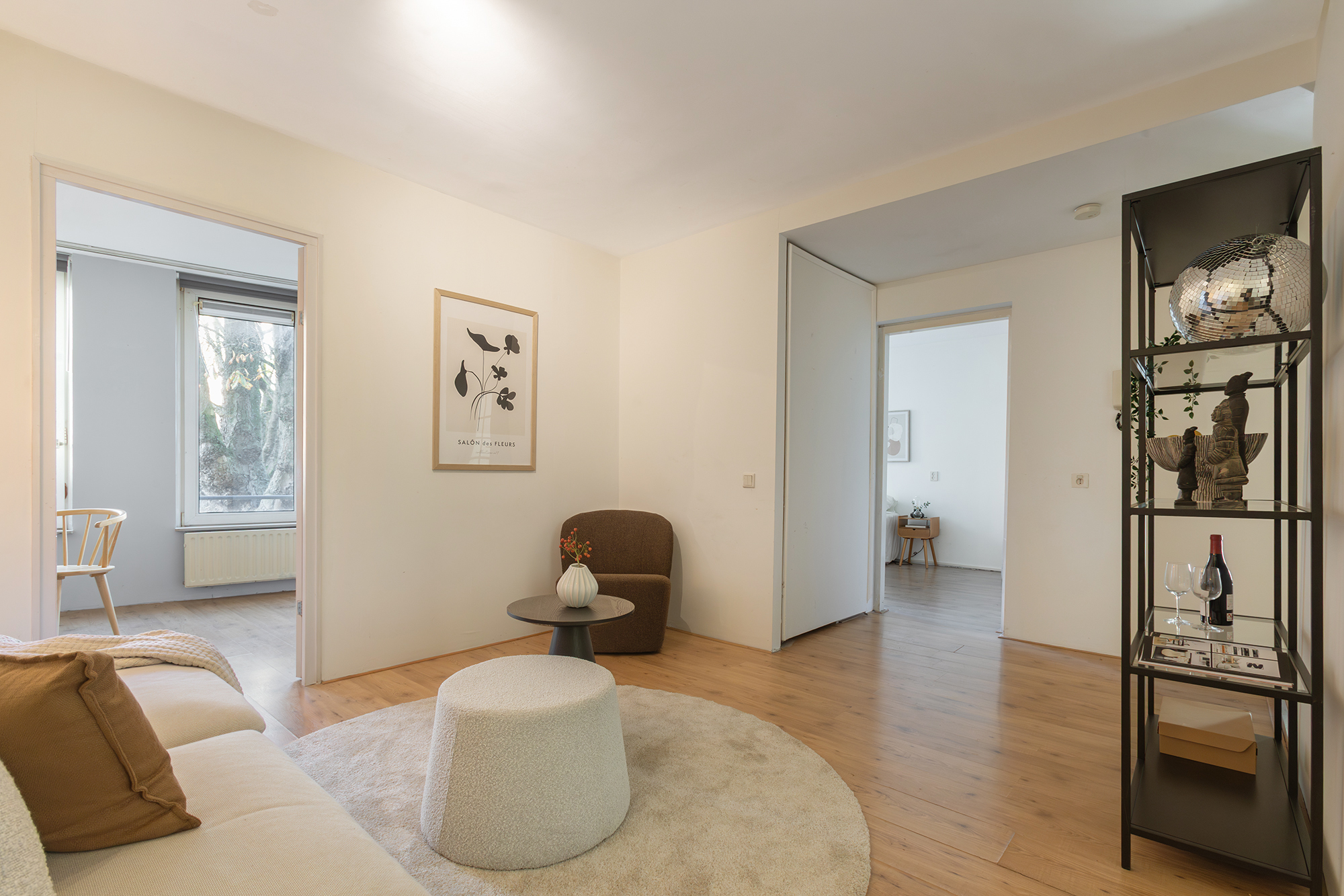 De woonkamer ligt in het midden van de woning en kijkt via de keuken uit op het balkon en het rustige binnenterrein. De ruimte is groot genoeg voor zowel een comfortabele zithoek als een eettafel. De indeling is praktisch: vanuit de centrale hal zijn alle ruimtes goed bereikbaar en voelt het geheel open en ruimtelijk aan.