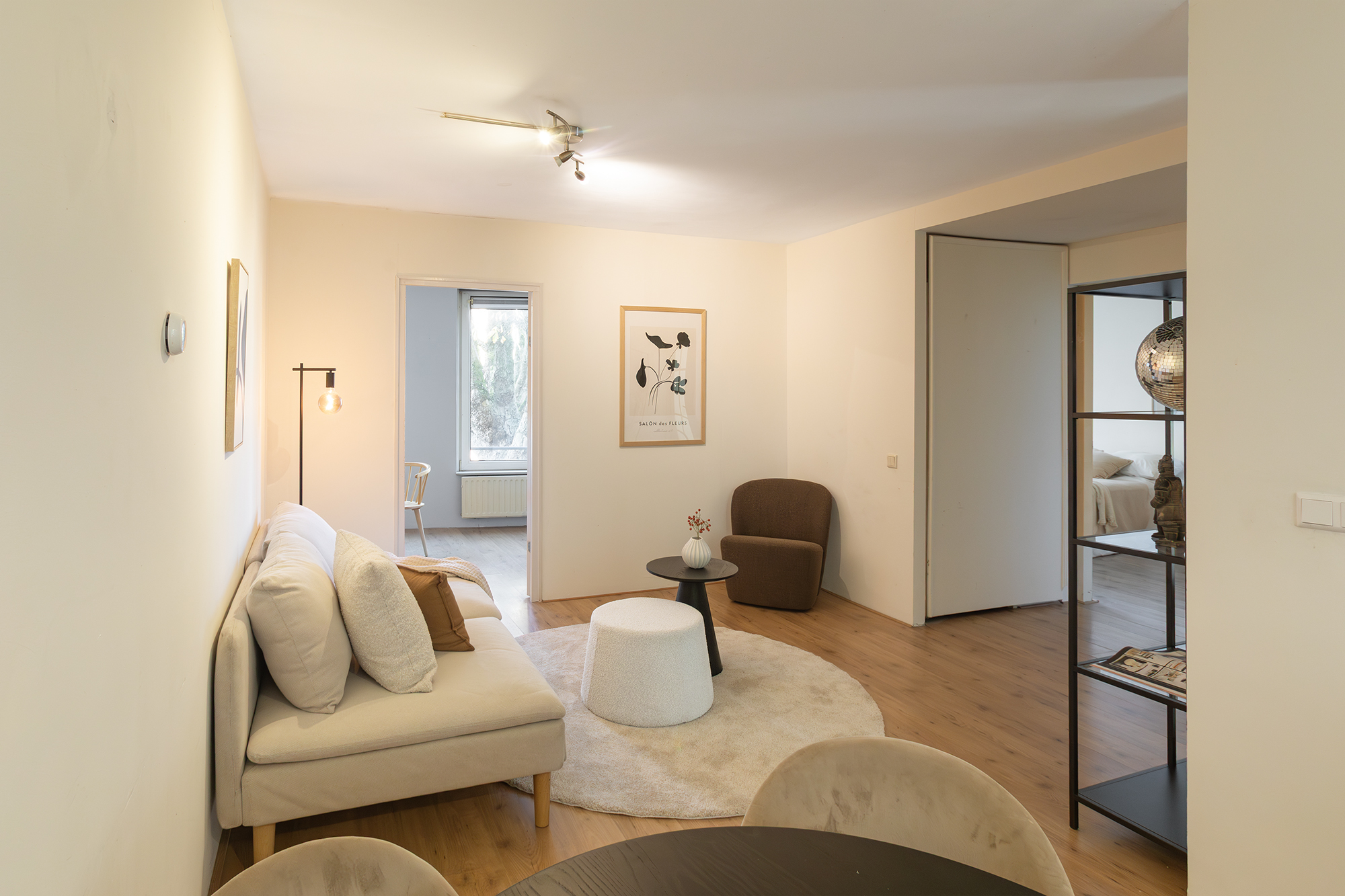 The living room is located in the centre of the property and overlooks the balcony and the quiet courtyard through the kitchen. The space is large enough for both a comfortable seating area and a dining table. The layout is practical: all rooms are easily accessible from the central hall, making the entire home feel open and spacious.