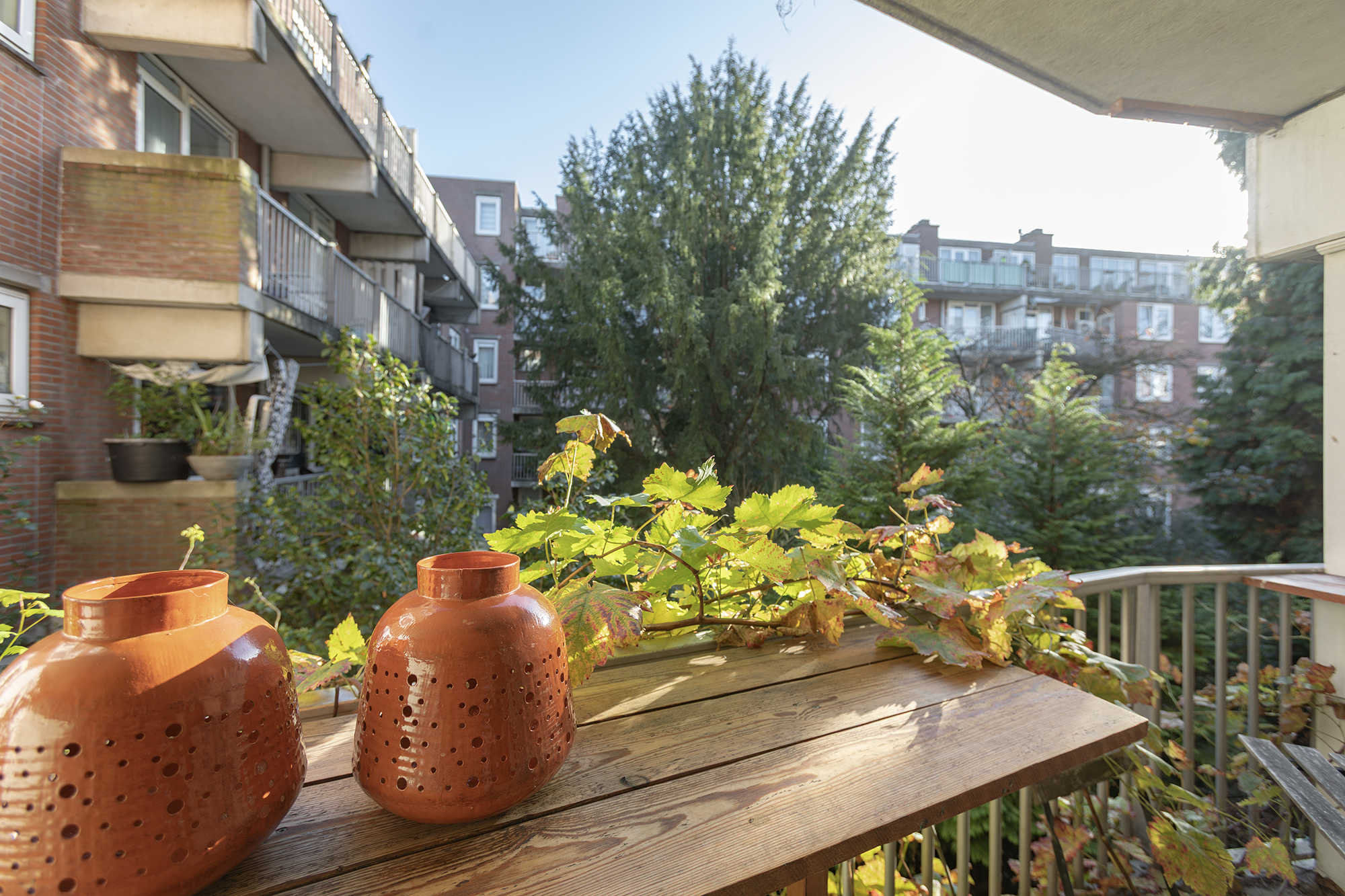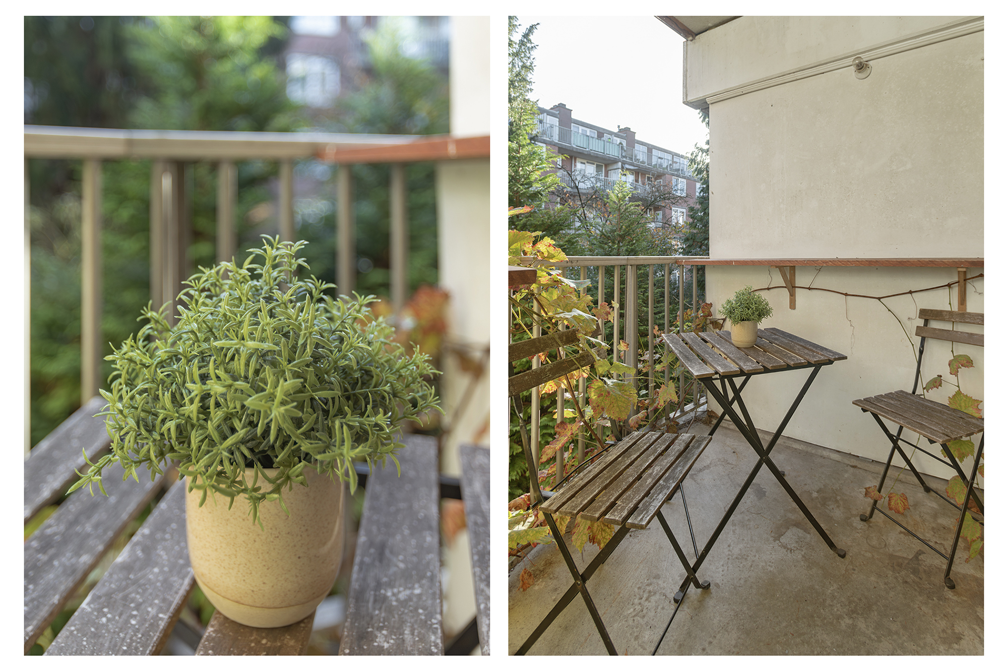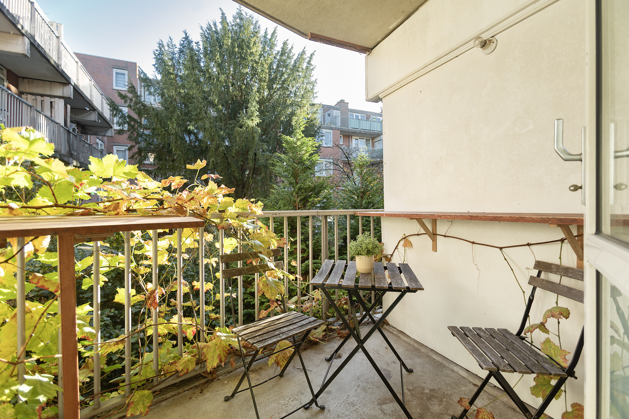Aan de achterzijde ligt een fijn balkon van ruim 8 m² op het zuidoosten. Hier zit je heerlijk in de ochtendzon, met uitzicht op de binnentuin. Een rustige plek om buiten te eten of een kop koffie te drinken.