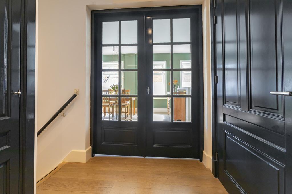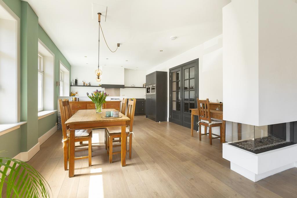 Wat je meteen voelt als je binnenstapt? Licht, rust en ruimte. De woning ligt op de hoek, waardoor het daglicht van meerdere kanten binnenvalt. De woonkamer is groot en sfeervol, met een open haard voor lange winteravonden, hoge plafonds van 2,86 meter en een leeshoek én tv-hoek in één ruimte. De openslaande ramen, het eikenhouten visgraatparket en de zachte kleuren zorgen voor een warme sfeer. Aan de woonkamer grenst de open keuken: het hart van het huis.