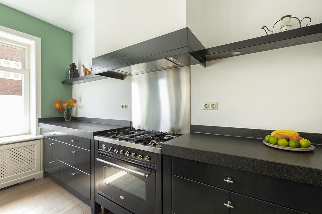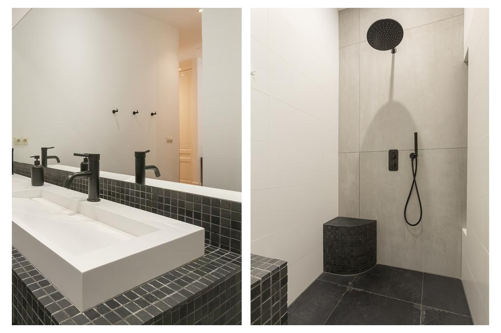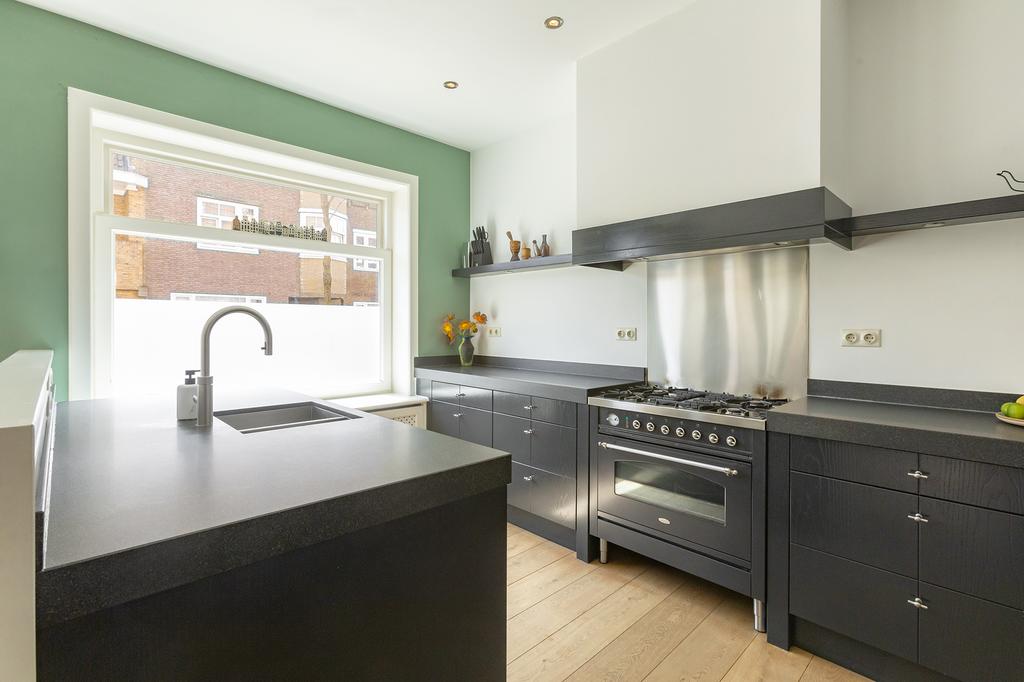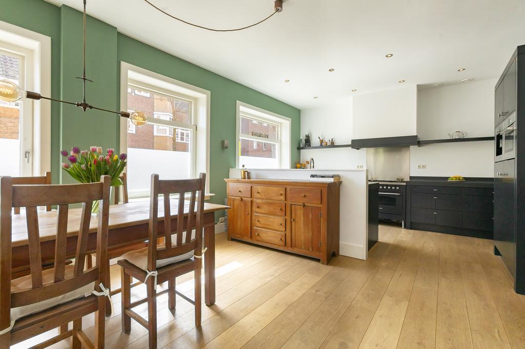 The kitchen is sleek, modern, and fully equipped with every appliance imaginable: a Boretti gas stove with oven, a Quooker, a dishwasher, a microwave, and a built-in coffee machine. Everything is in excellent condition and neatly integrated into the custom black cabinetry—a striking contrast to the white plastered walls and wooden flooring. Thanks to the corner location and open layout, you’ll always cook in natural daylight.