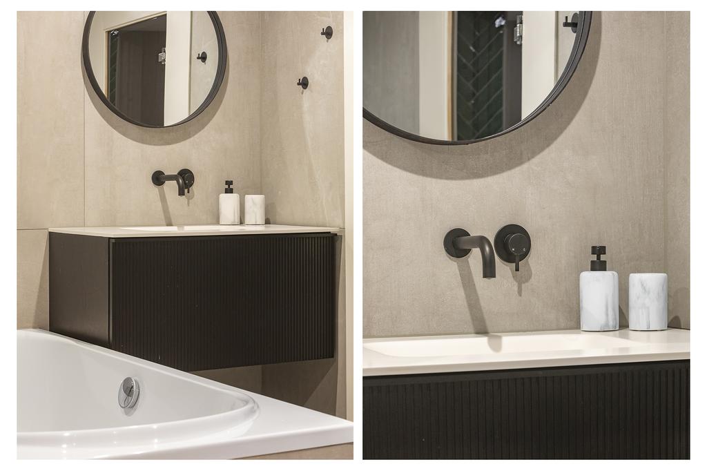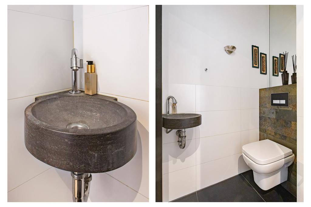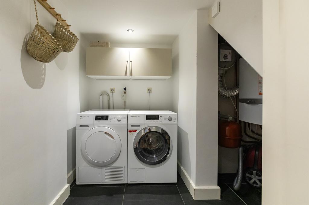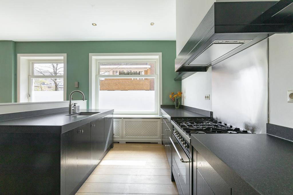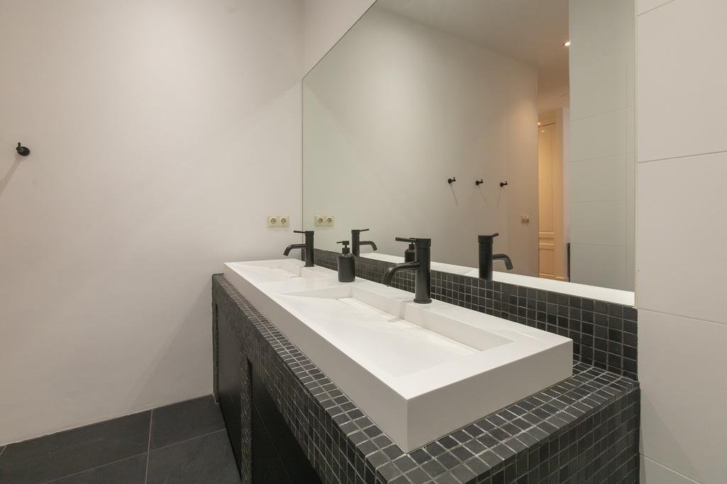 The kitchen is sleek, modern, and fully equipped with every appliance imaginable: a Boretti gas stove with oven, a Quooker, a dishwasher, a microwave, and a built-in coffee machine. Everything is in excellent condition and neatly integrated into the custom black cabinetry—a striking contrast to the white plastered walls and wooden flooring. Thanks to the corner location and open layout, you’ll always cook in natural daylight.