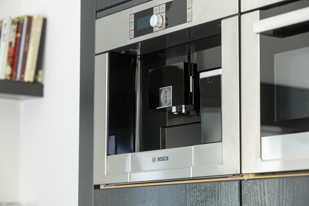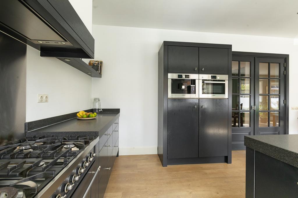 De keuken is strak, modern en voorzien van alle denkbare apparatuur: een Boretti gasfornuis met oven, een Quooker, vaatwasser, magnetron en ingebouwde koffiemachine. Alles is goed onderhouden en keurig ingebouwd in het zwarte maatwerk – een mooi contrast met het witte stucwerk en de houten vloer. Dankzij de hoekligging en open indeling kook je hier altijd met daglicht.