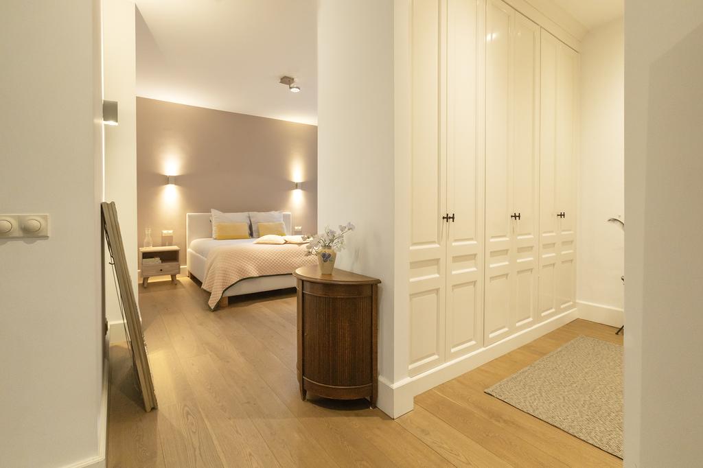 What’s the first thing you notice when stepping inside? Light, tranquility, and space. The apartment is located on a corner, allowing daylight to flood in from multiple directions. The living room is large and atmospheric, featuring a fireplace for long winter evenings, high ceilings of 2.86 meters, and a reading corner plus a TV area in a single open space. The French doors, oak herringbone parquet floor, and soft color palette create a warm ambiance. The open kitchen is directly connected to the living room and forms the heart of the home.