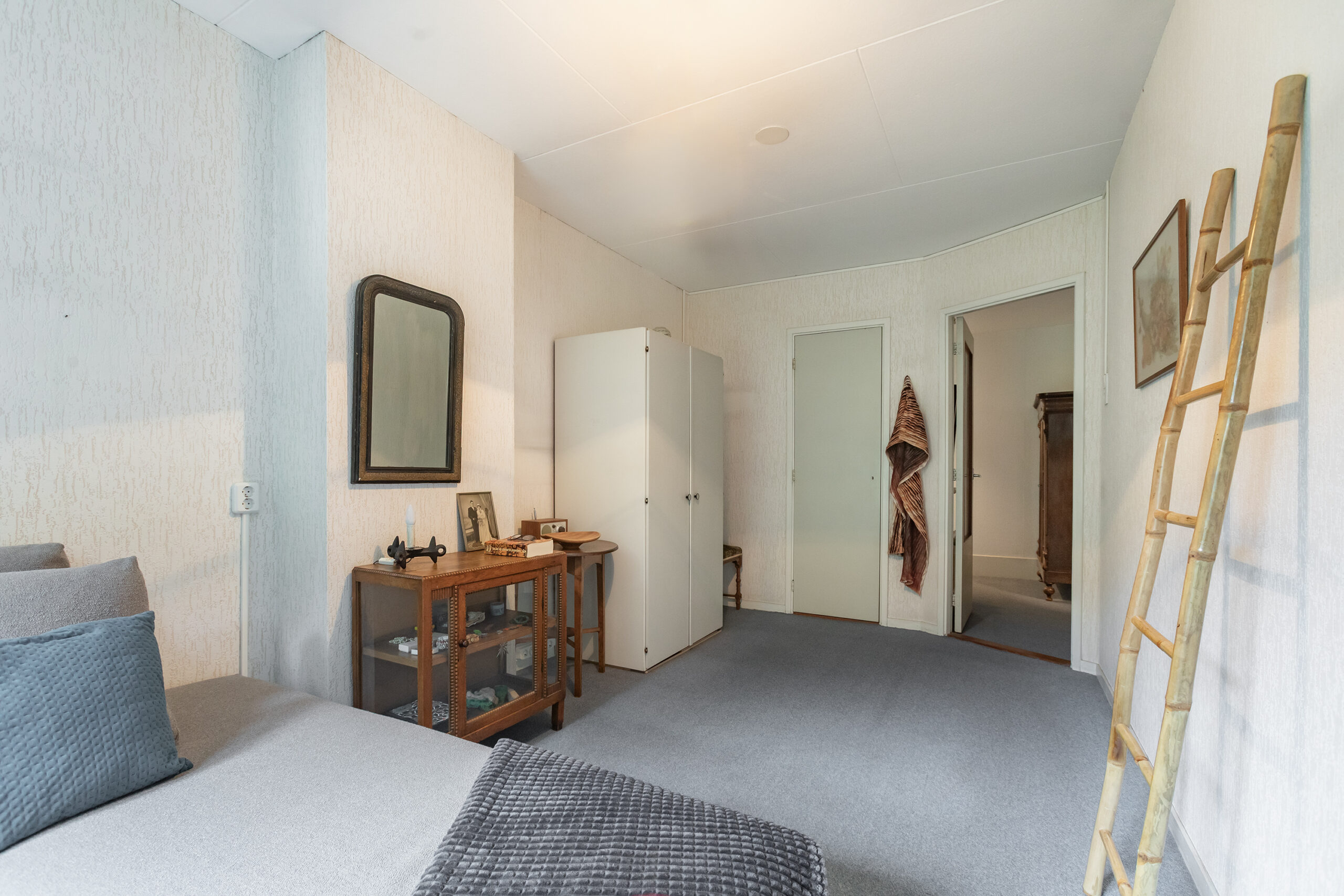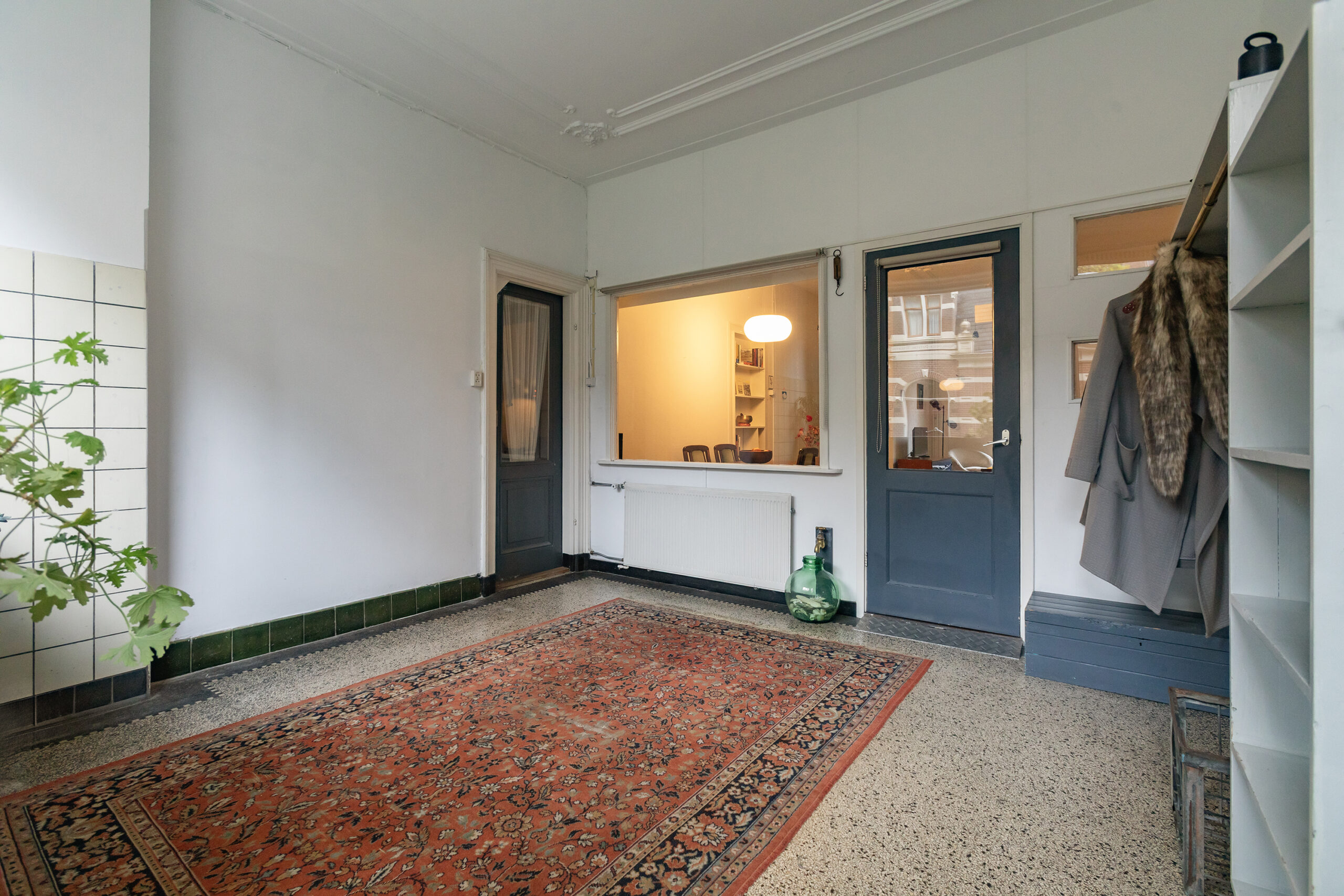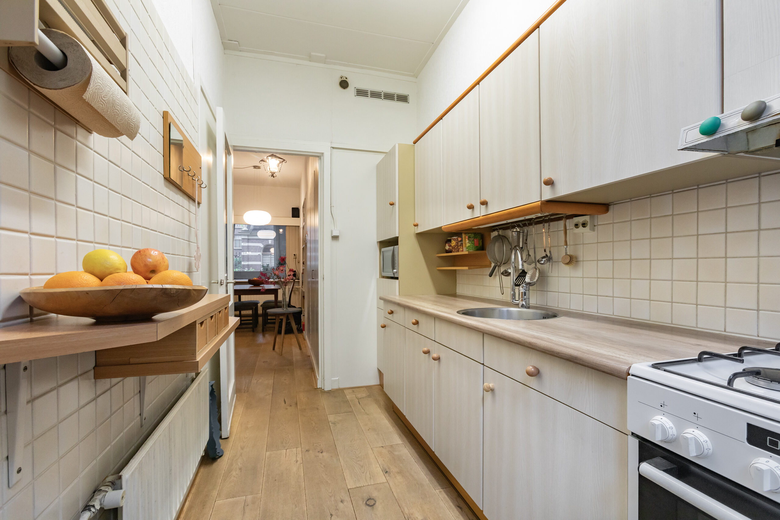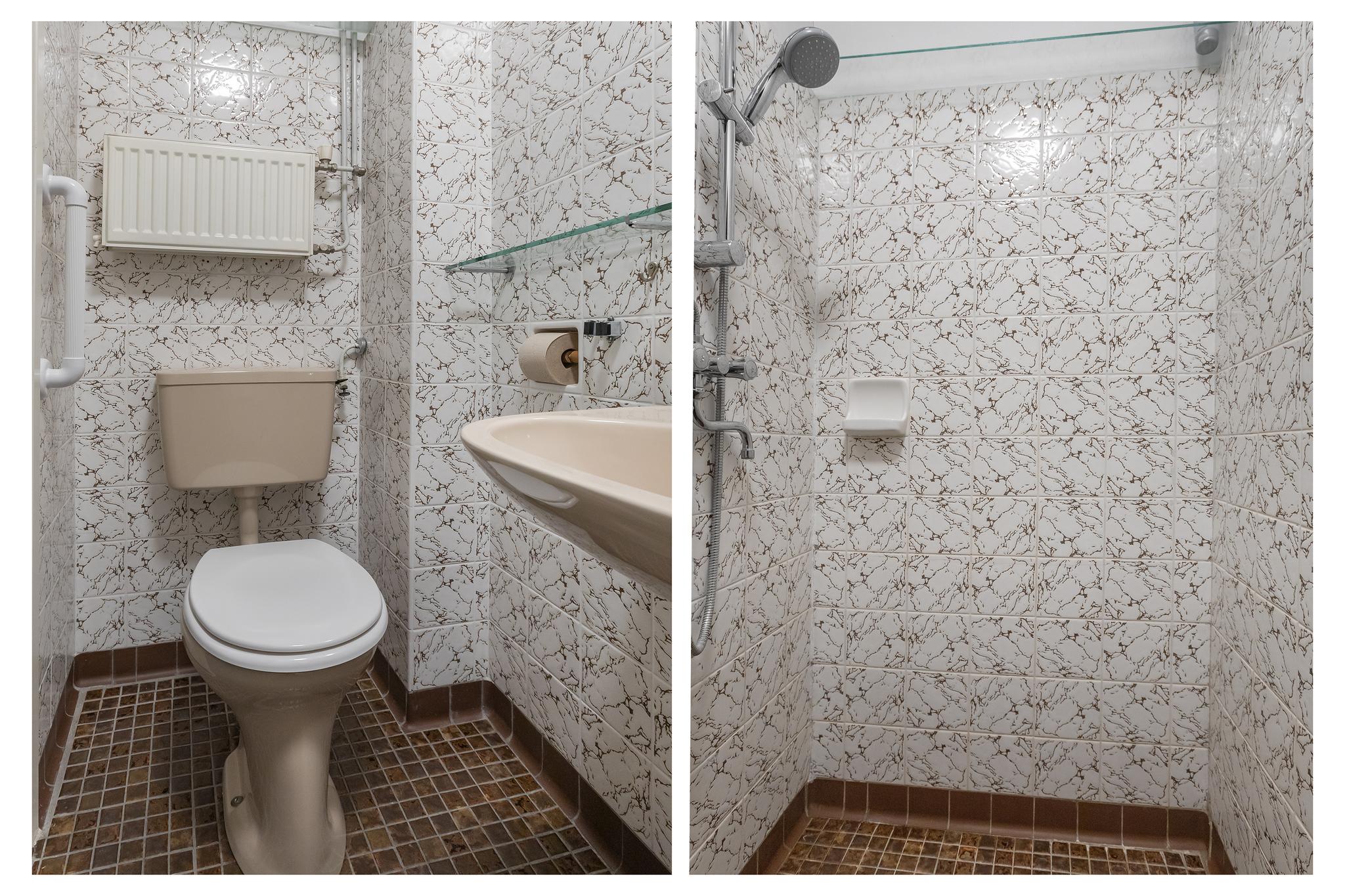 The ground floor consists of a private entrance with access to the milk shop, which is currently used as a cloakroom/hall. You then walk through to the living room with a partially open kitchen, toilet, built-in storage cupboard and access to the 20-metre deep garden. In the garden there is a very spacious shed on a concrete foundation. There is an internal staircase to the first floor, which consists of three bedrooms and a simple bathroom.
