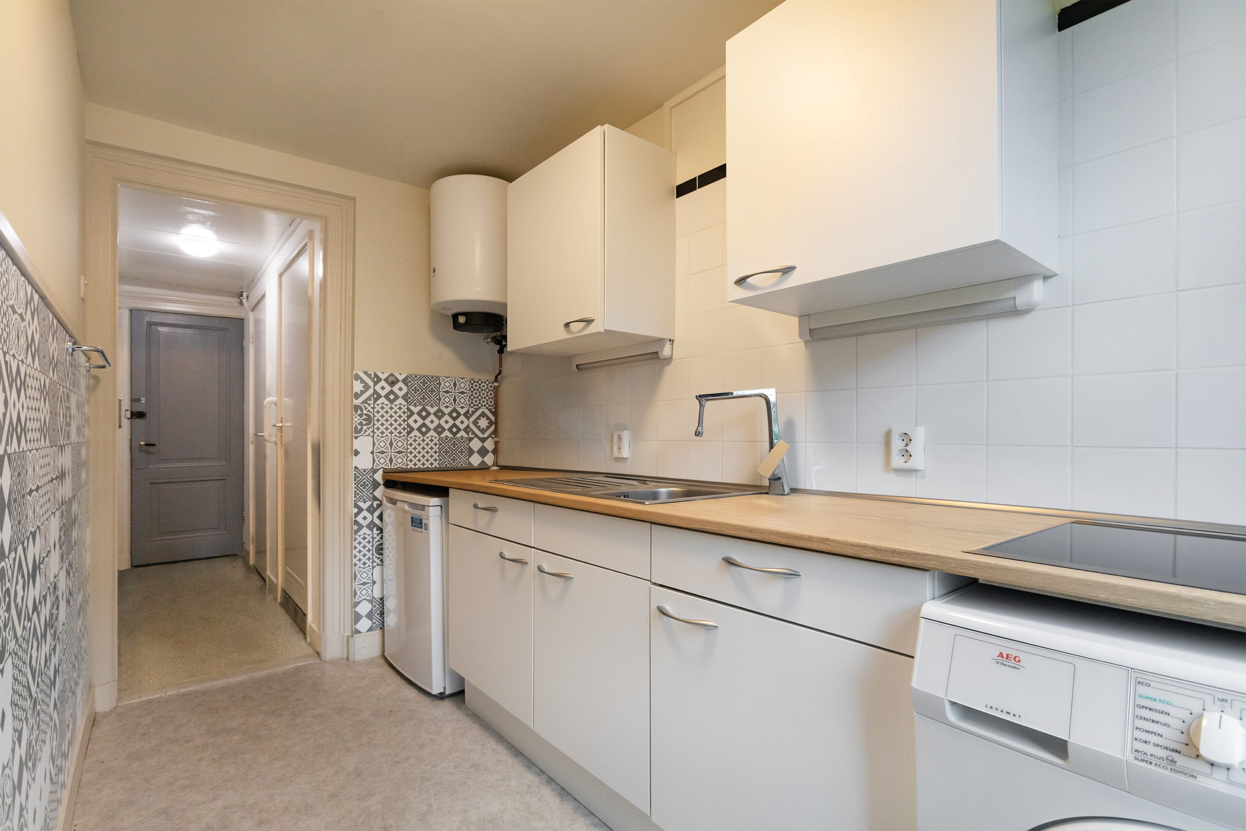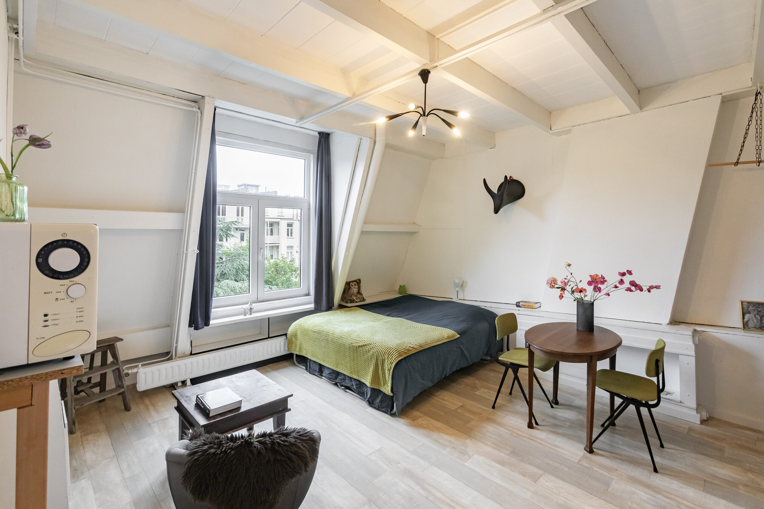 Studio op de 4e etage bestaande uit een woon- slaapkamer met open keukenblok en toilet en douche op de overloop.