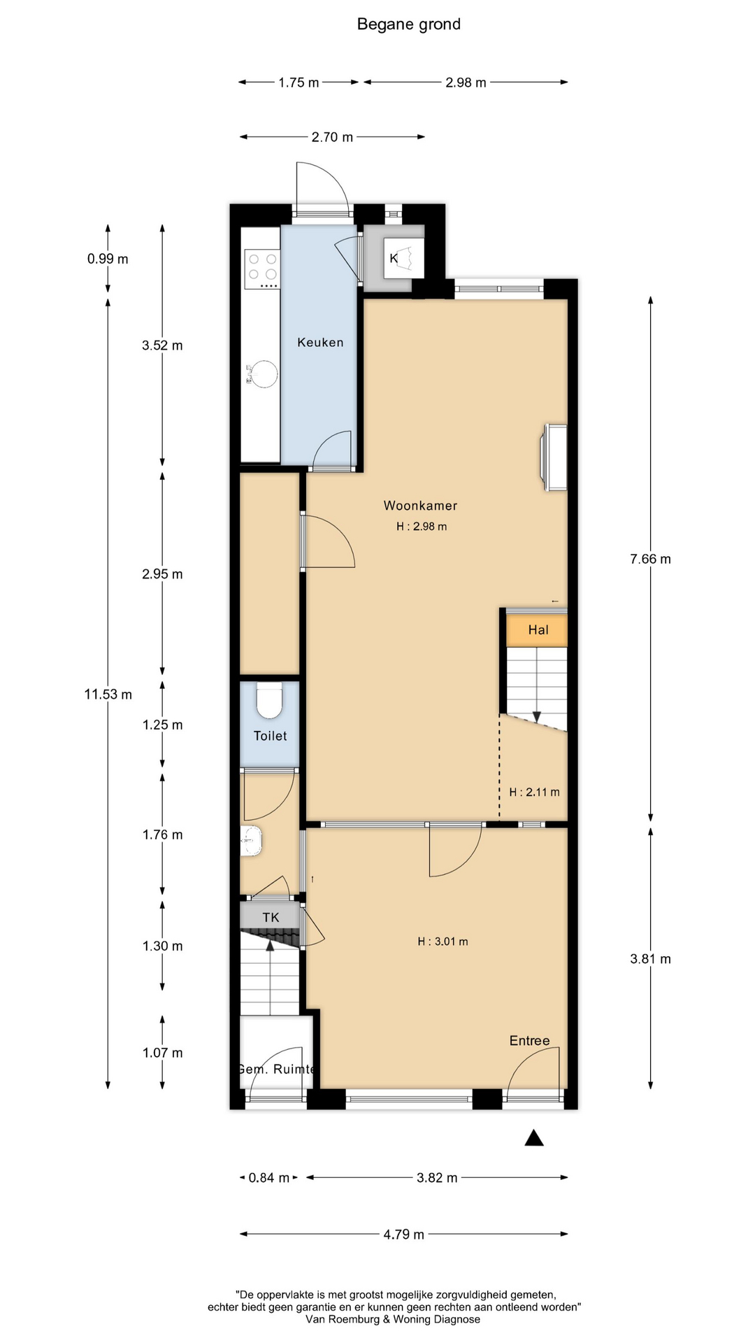 Begane grond bestaat uit een eigen entree met toegang tot de melkwinkel, deze wordt momenteel als garderobe/hal gebruikt. Vervolgens loop je door naar de woonkamer met een gedeeltelijke open keuken, toilet, inpandige bergkast en toegang naar de 20 meter diepe tuin. In de tuin bevindt zich een zeer ruime schuur op een betonnen fundering.