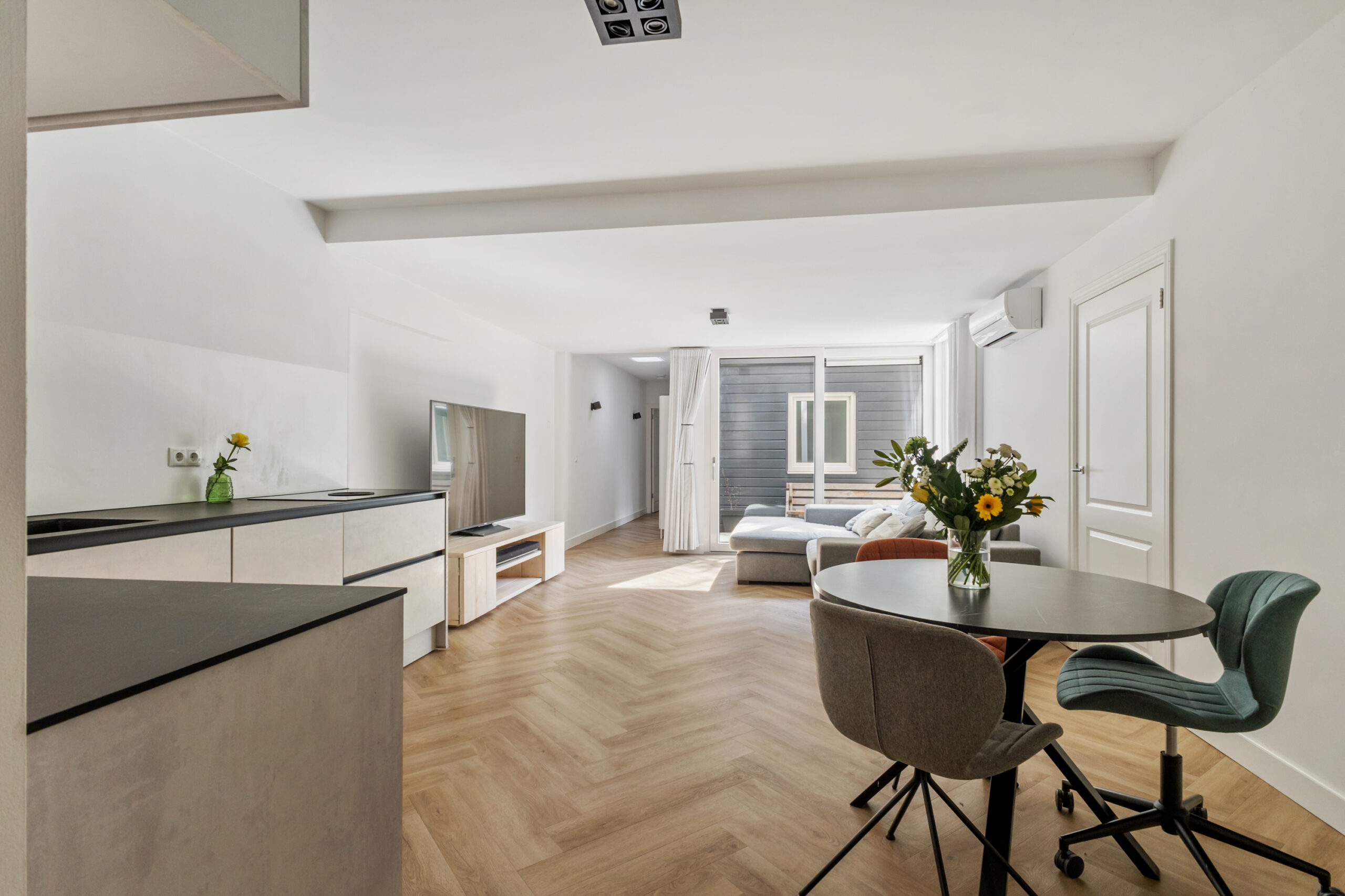 De woonkamer is ruim opgezet en biedt alle ruimte voor een royale zithoek en een grote eettafel. Dankzij de grote ramen en schuifpui komt er veel natuurlijk daglicht binnen, wat zorgt voor een open en warme uitstraling.