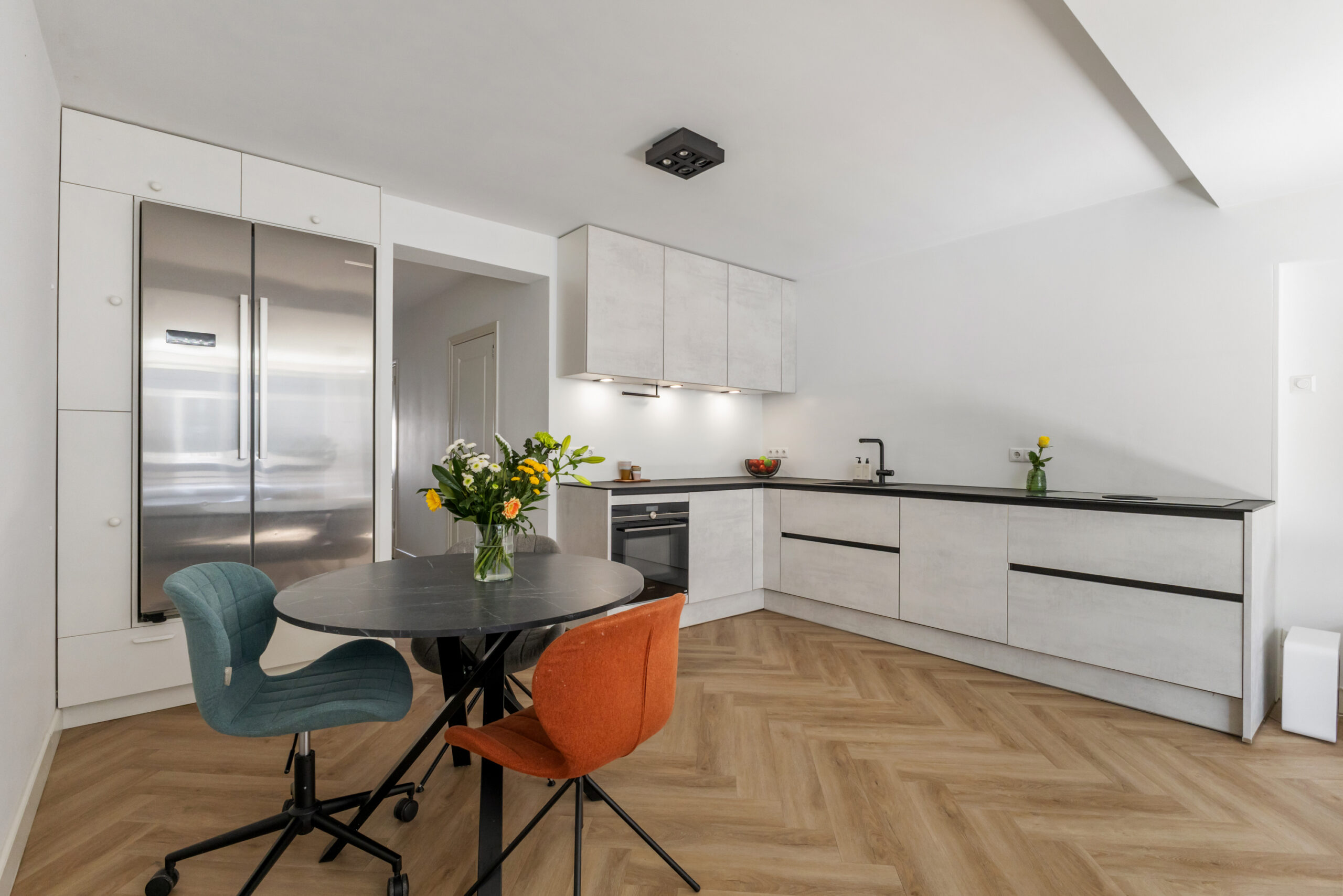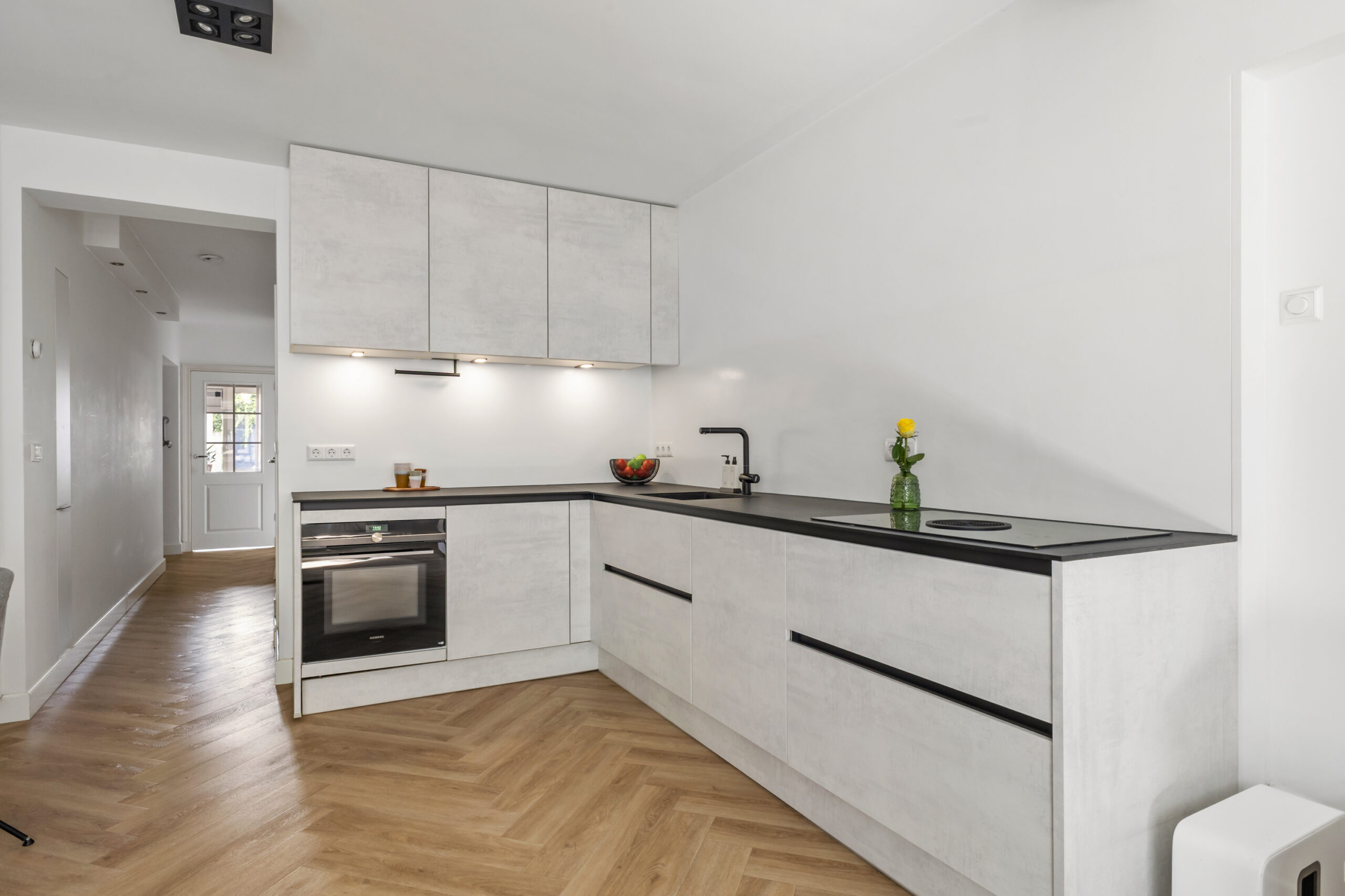 De keuken is in 2021 volledig vernieuwd en vormt een moderne en praktische leefruimte. De indeling is ruim en functioneel met voldoende werk- en kastruimte.