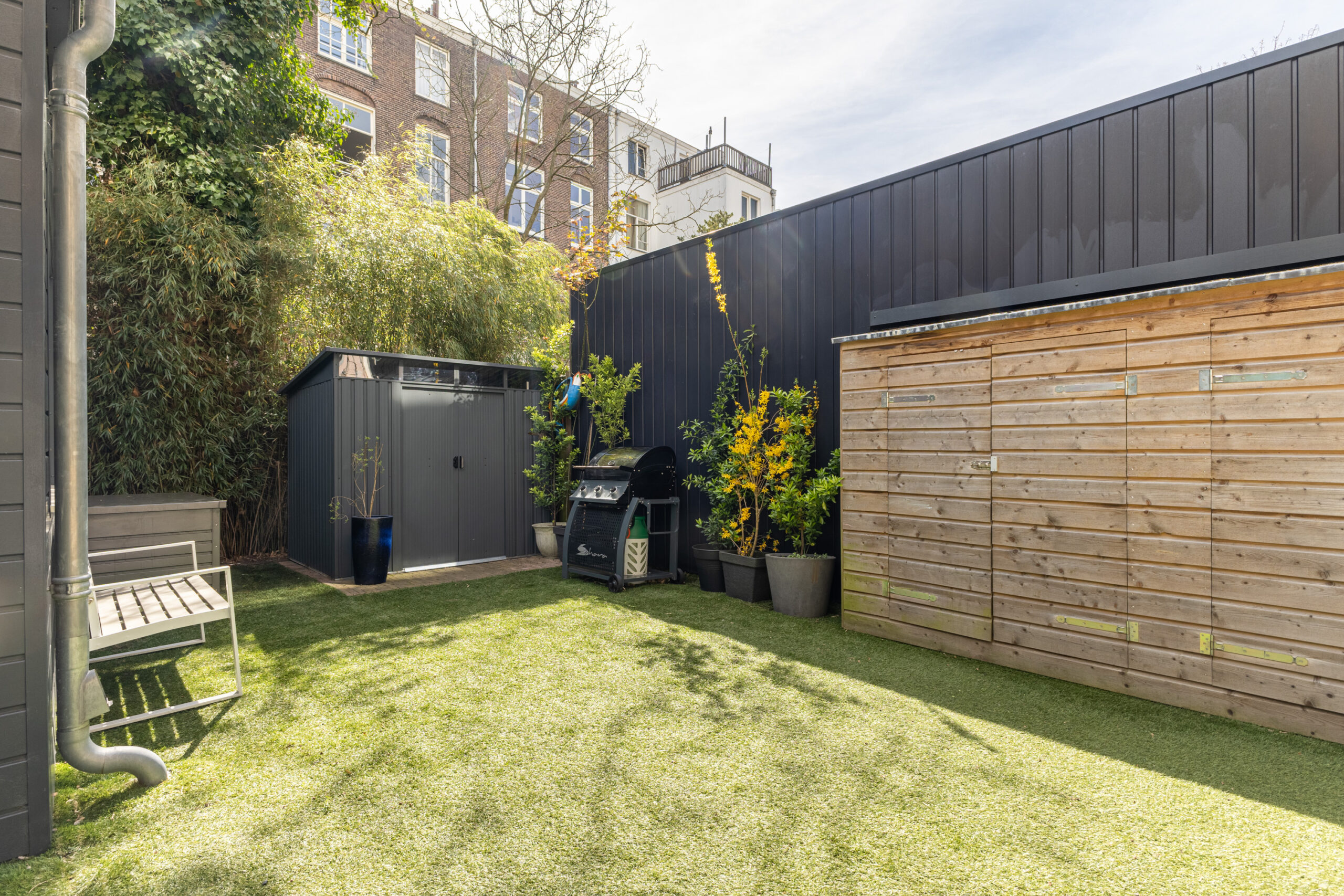 De tuin is voorzien van praktische voorzieningen zoals een buitenkraan en stroompunten. Daarnaast is er een schuur aanwezig. Uniek is de separate toegang tot de tuin, ideaal voor fietsen en tuinspullen zonder door het huis te hoeven.