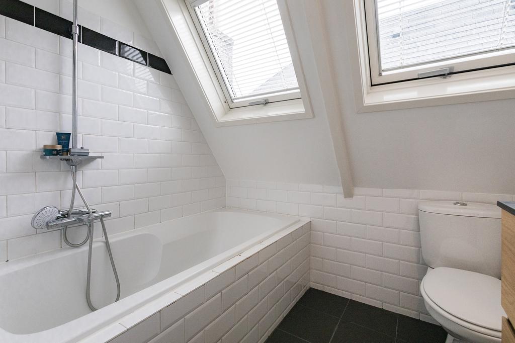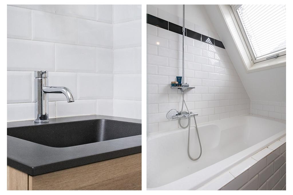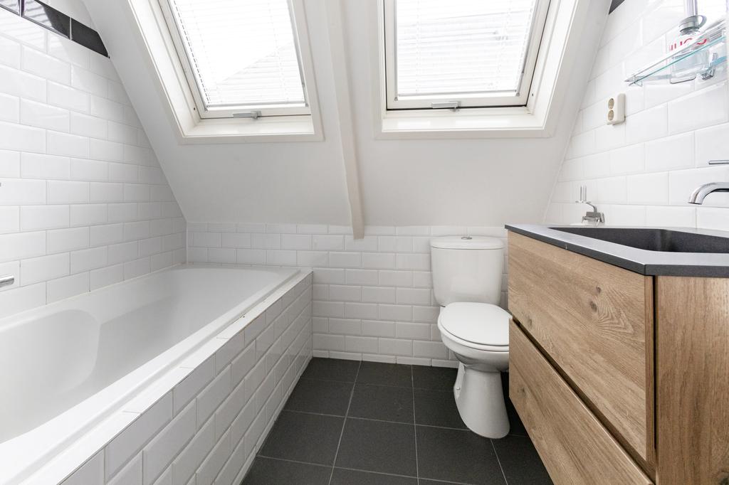 De badkamer heeft een ligbad, regendouche, wastafelmeubel en een vernieuwde vloer (2022). Daarnaast is er een apart toilet en een handige overloop met extra opbergruimte.