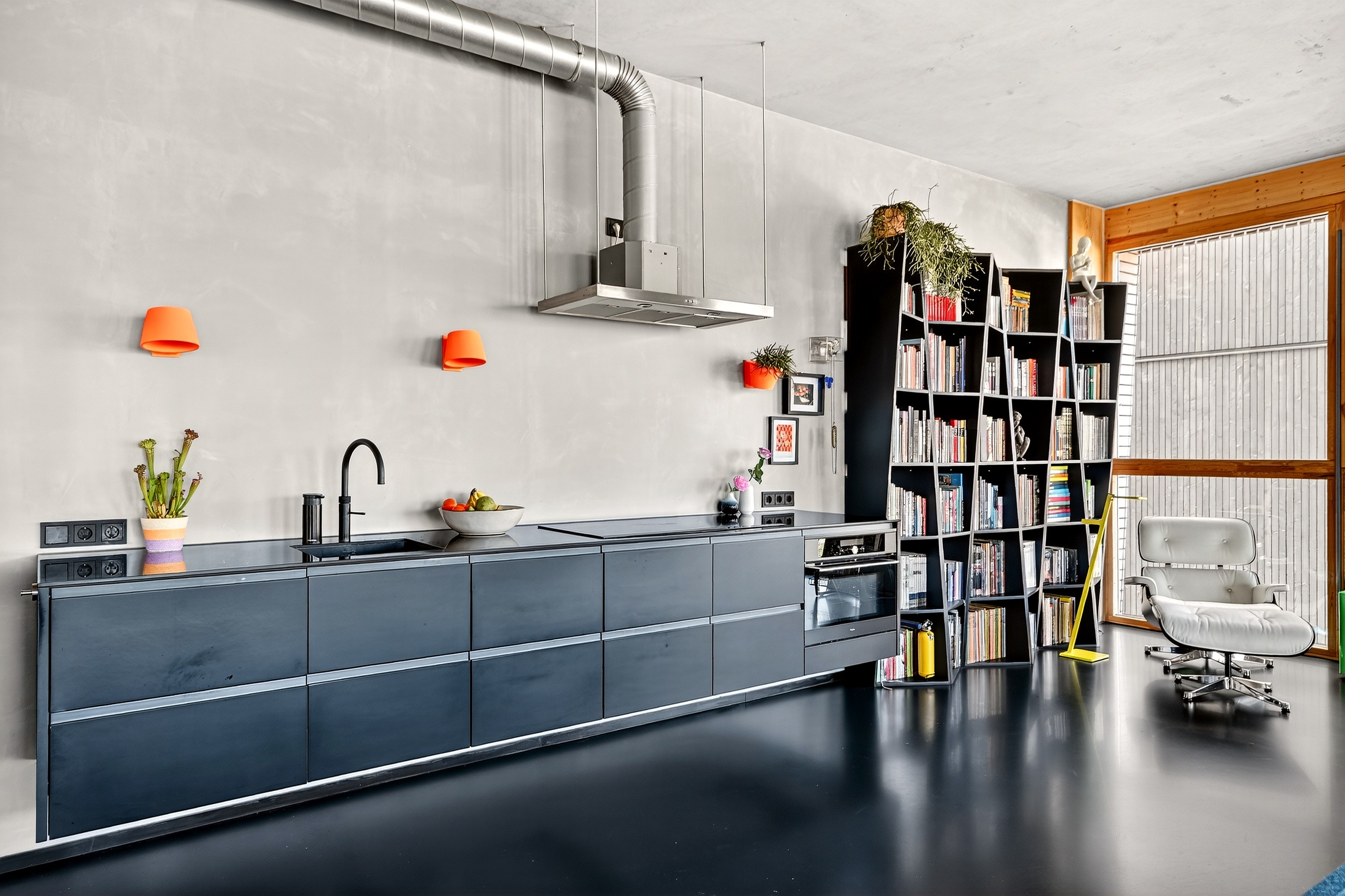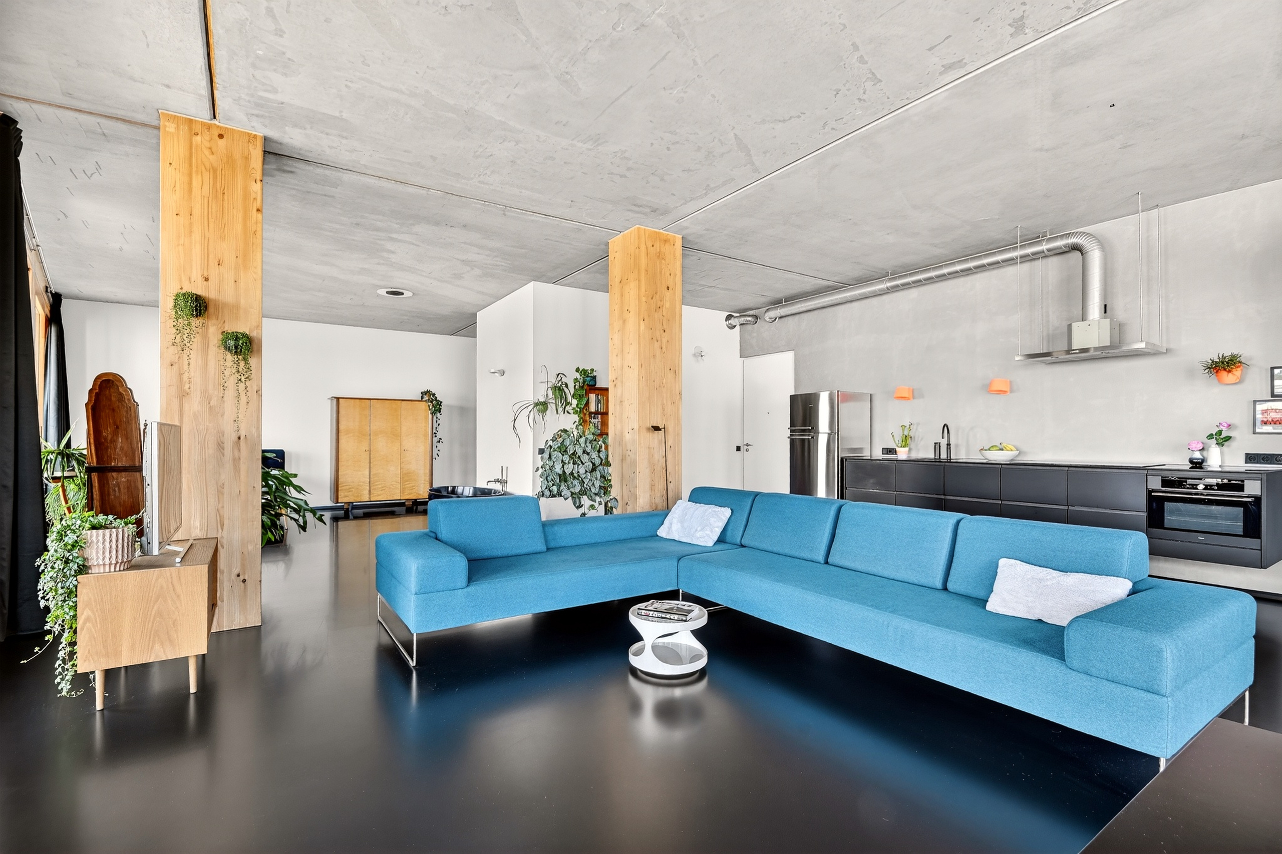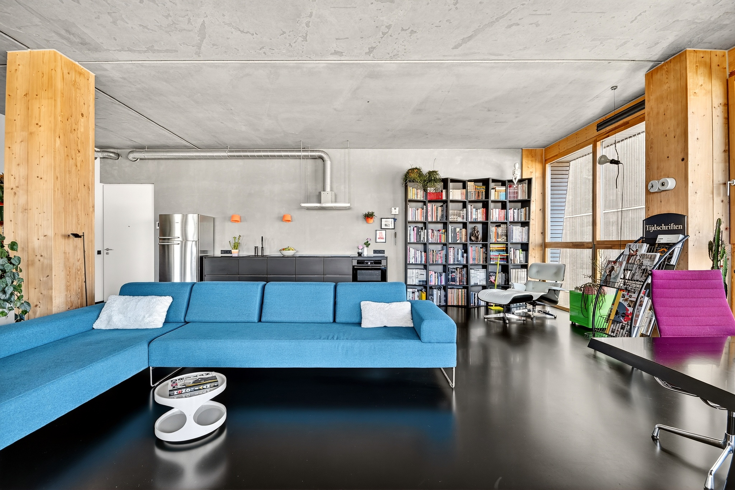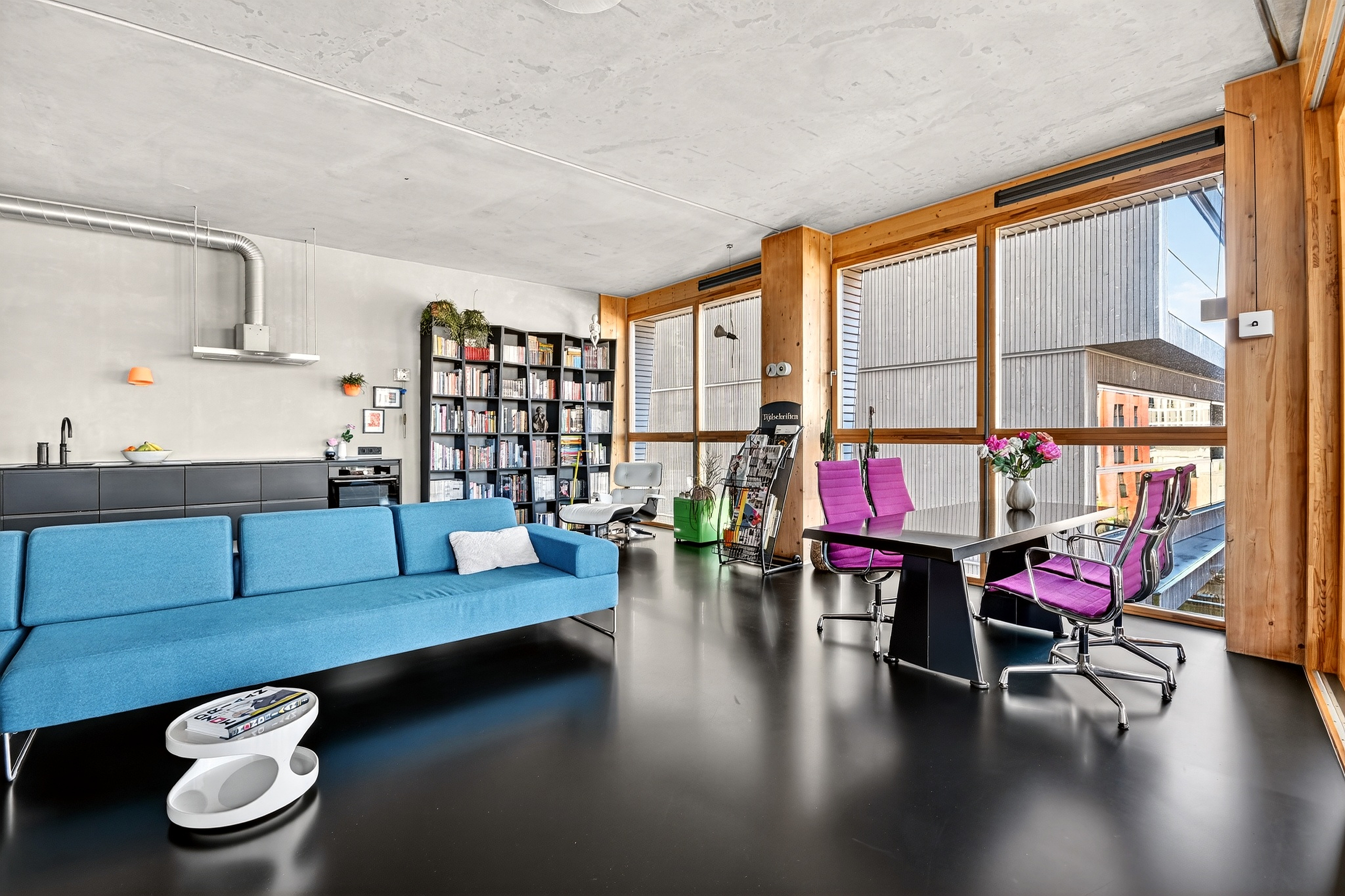 De loft is één open geheel, met hoge ramen van vloer tot plafond die zorgen voor een zee van daglicht. De huidige indeling combineert wonen, slapen en werken in één vloeiende ruimte, en biedt volop mogelijkheden om een eigen draai te geven.