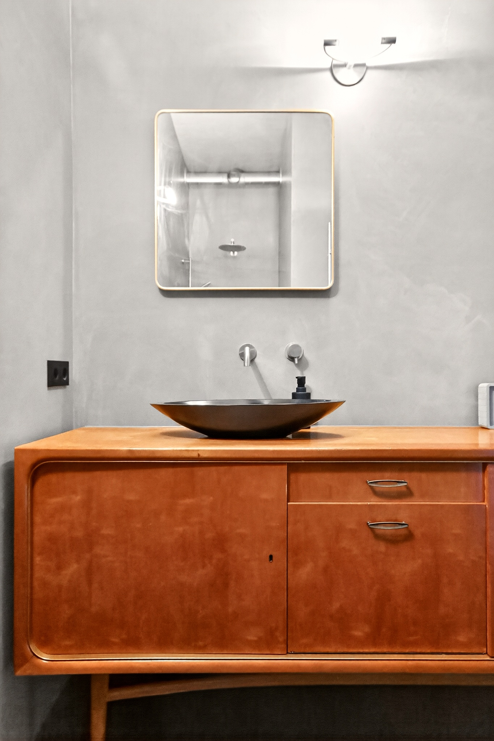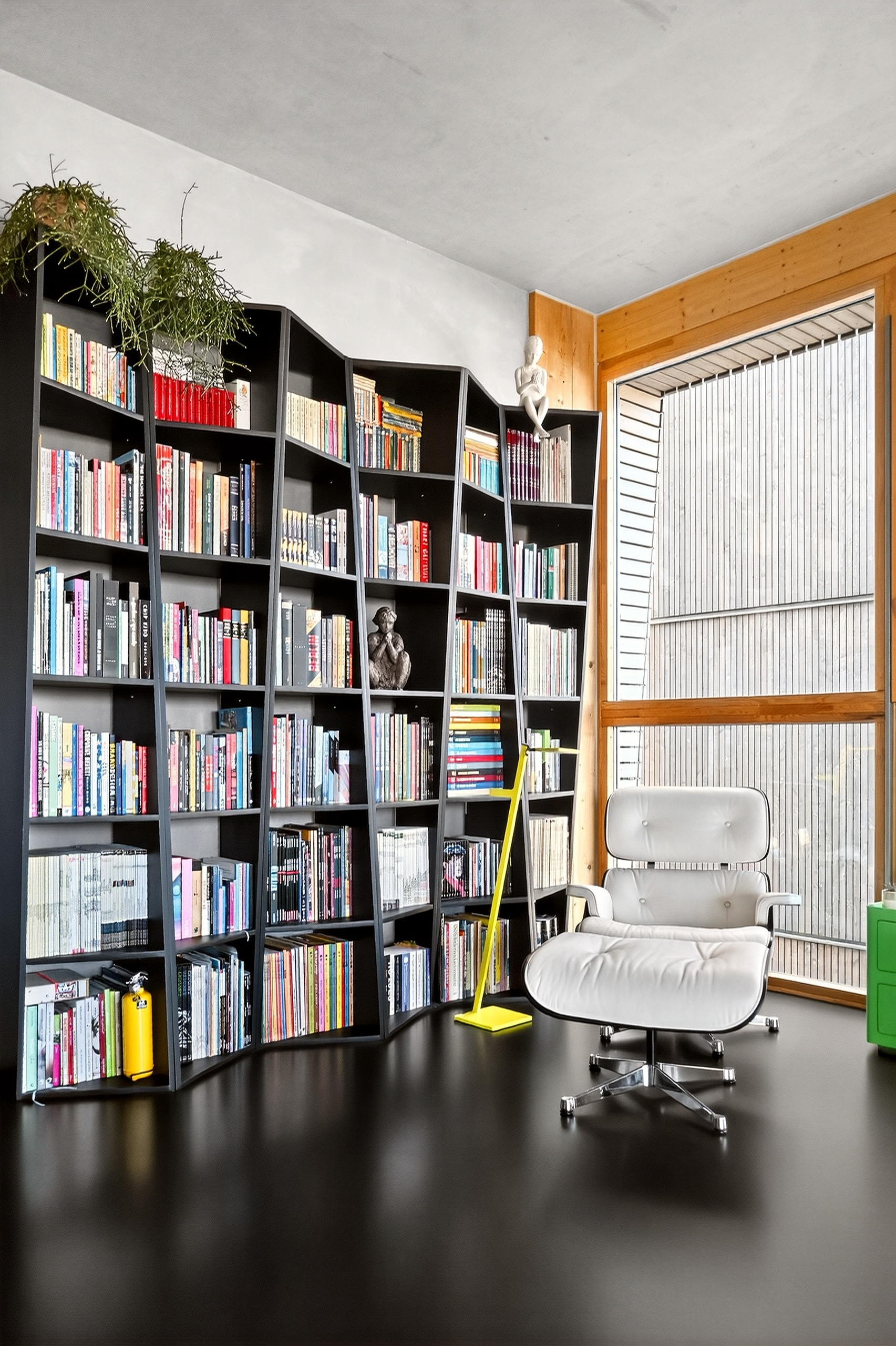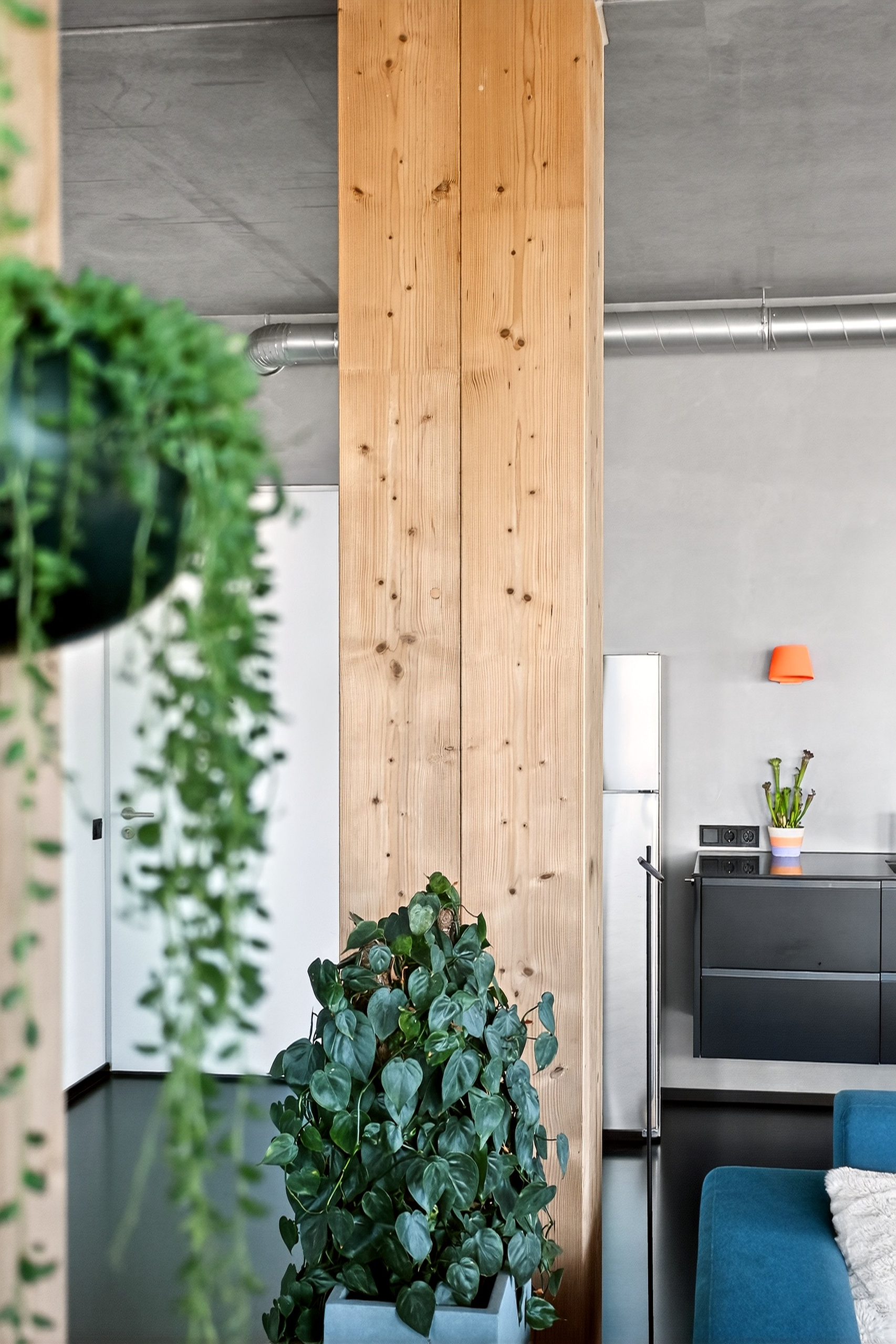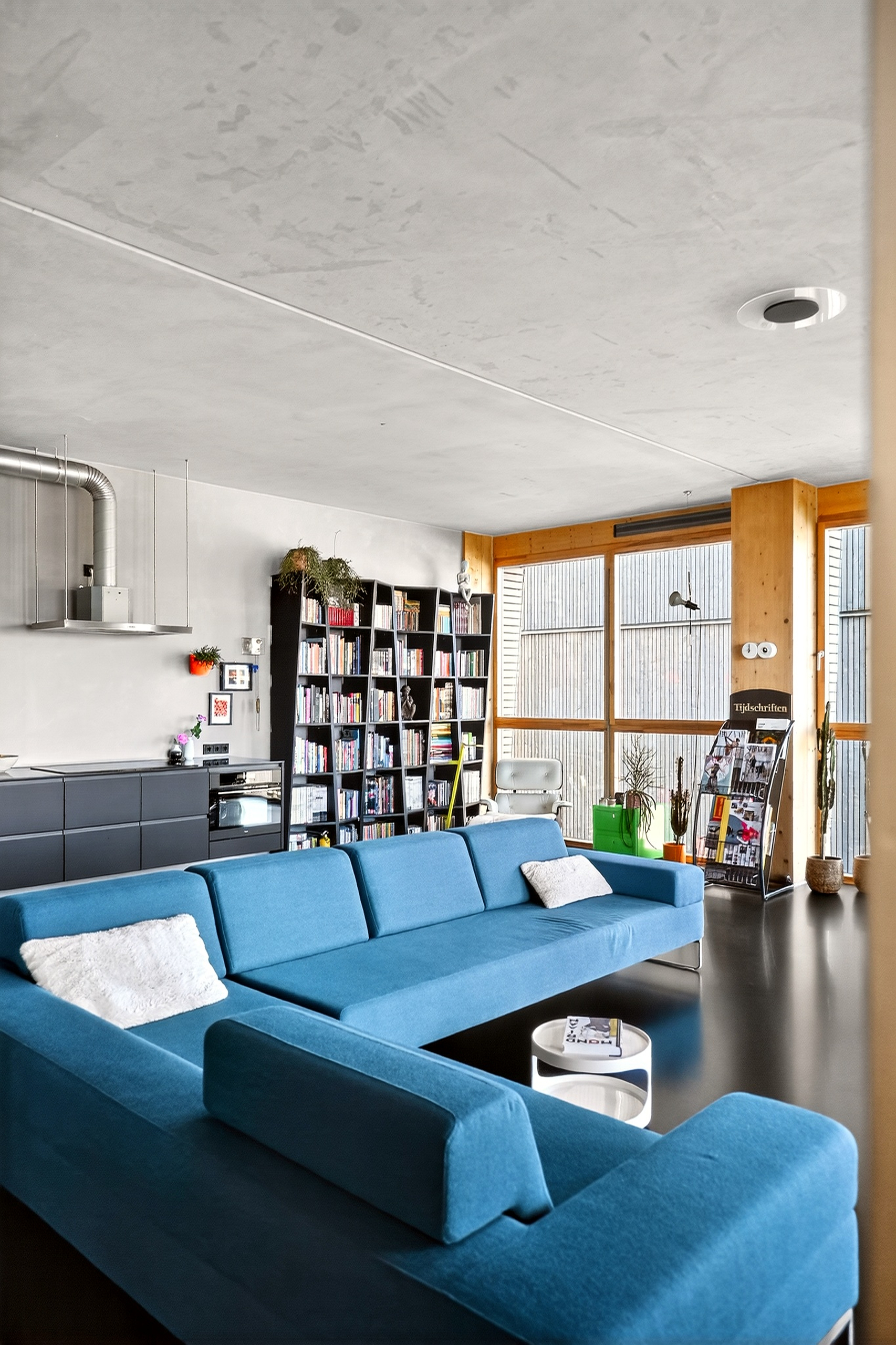 – Industrial details (concrete look and exposed concrete ceiling) combined with warm wooden window frames and pillars