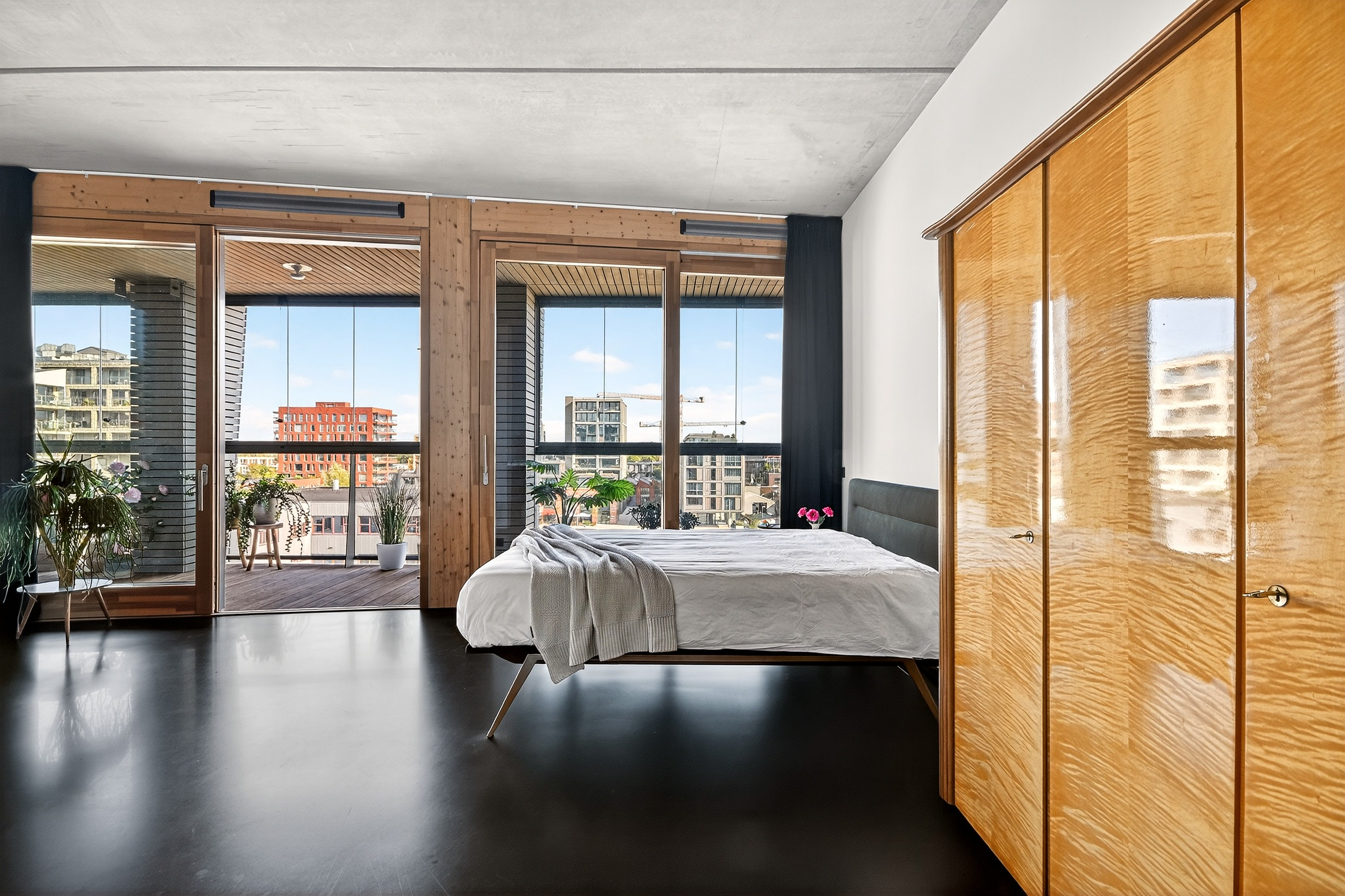 The loft is one open space, with floor-to-ceiling windows providing abundant daylight. The current layout combines living, sleeping, and working in one seamless flow, while offering plenty of opportunities to adapt it to your own style.