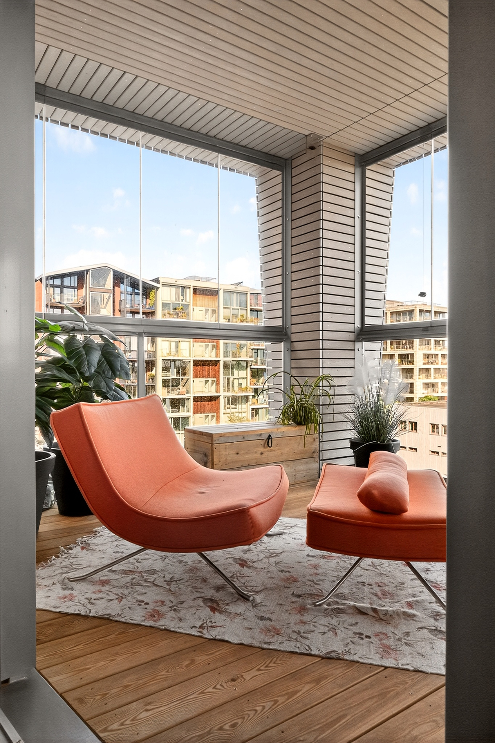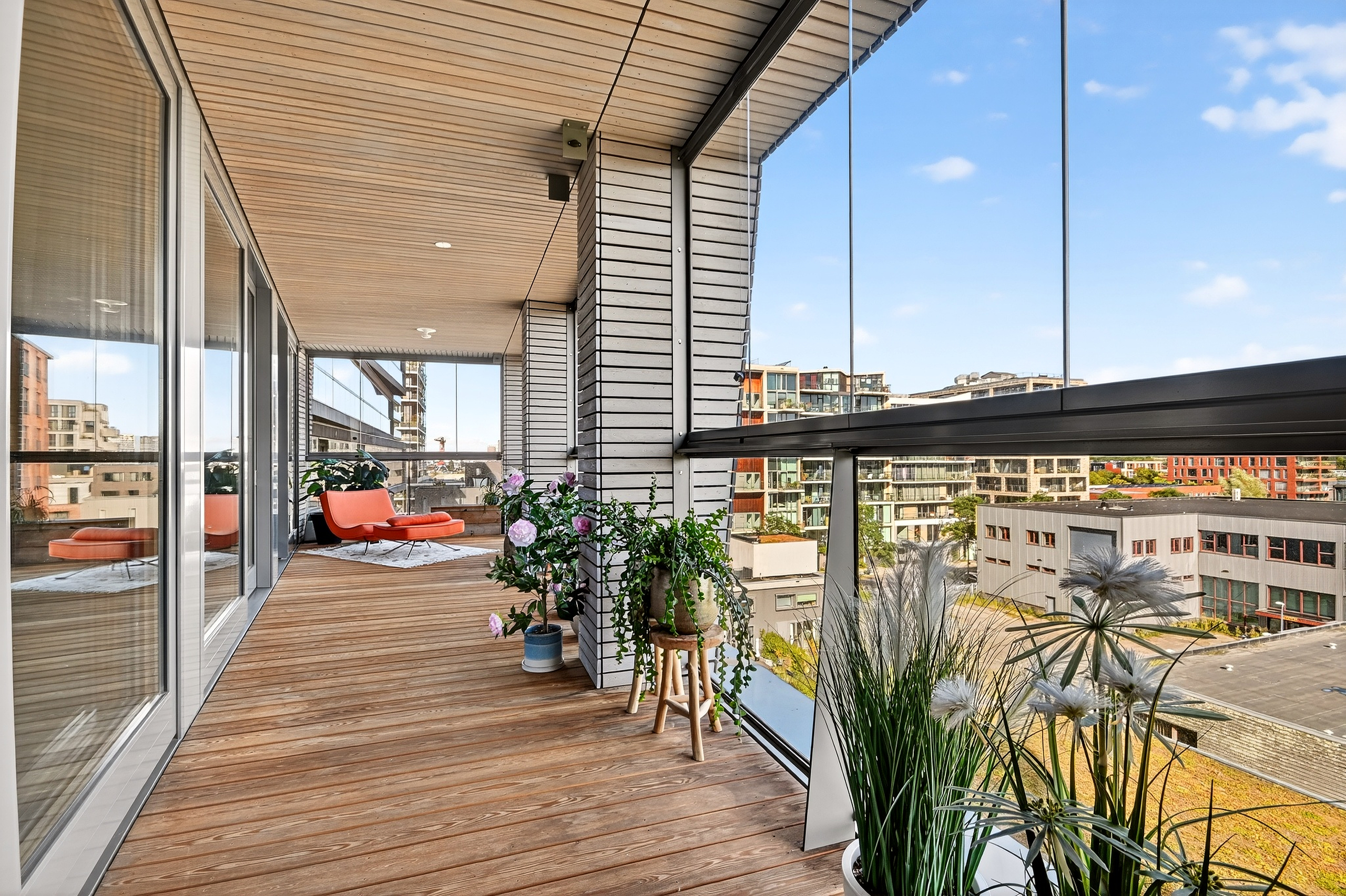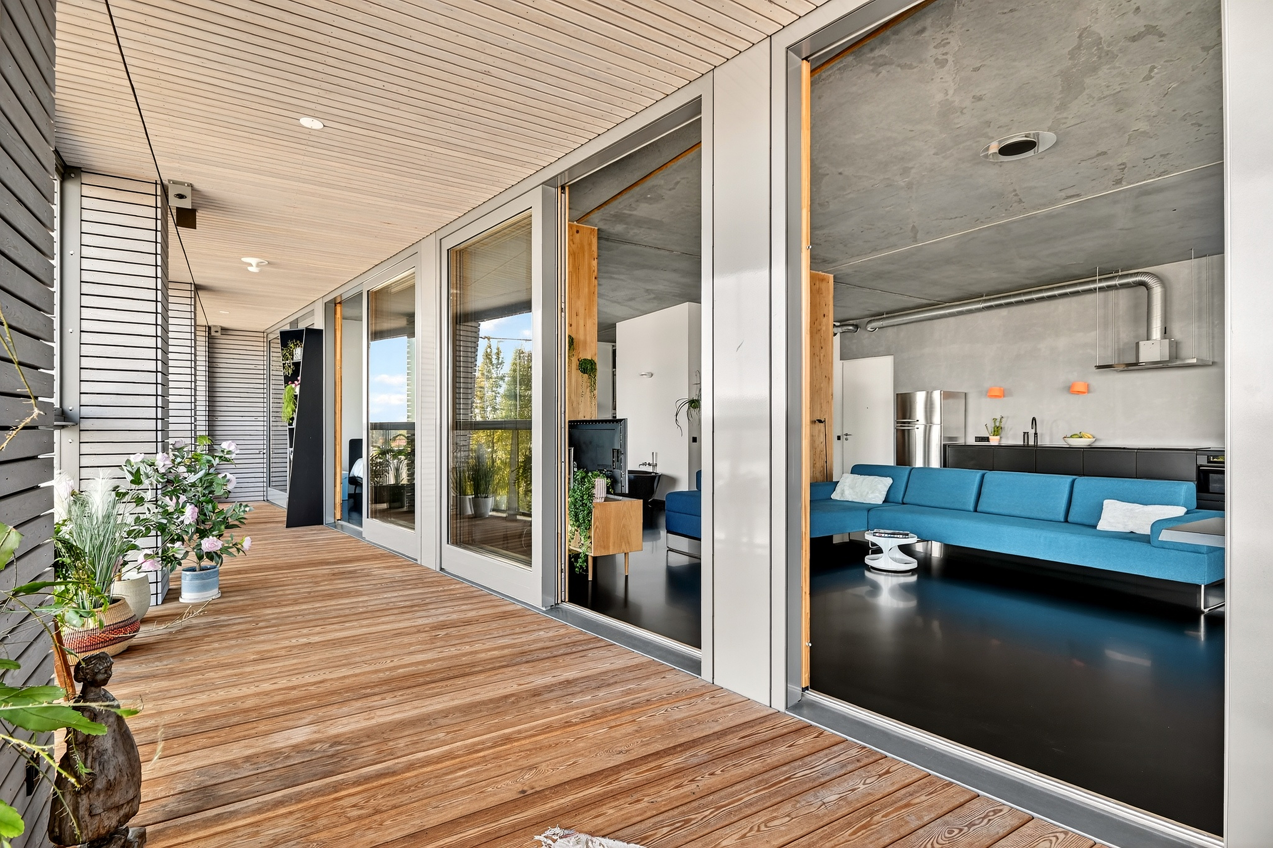 The 32 m² loggia feels like an extension of the living room. Thanks to the glass sliding walls, you decide how open or sheltered you want the space to be, making it comfortable to use from early spring to late autumn.