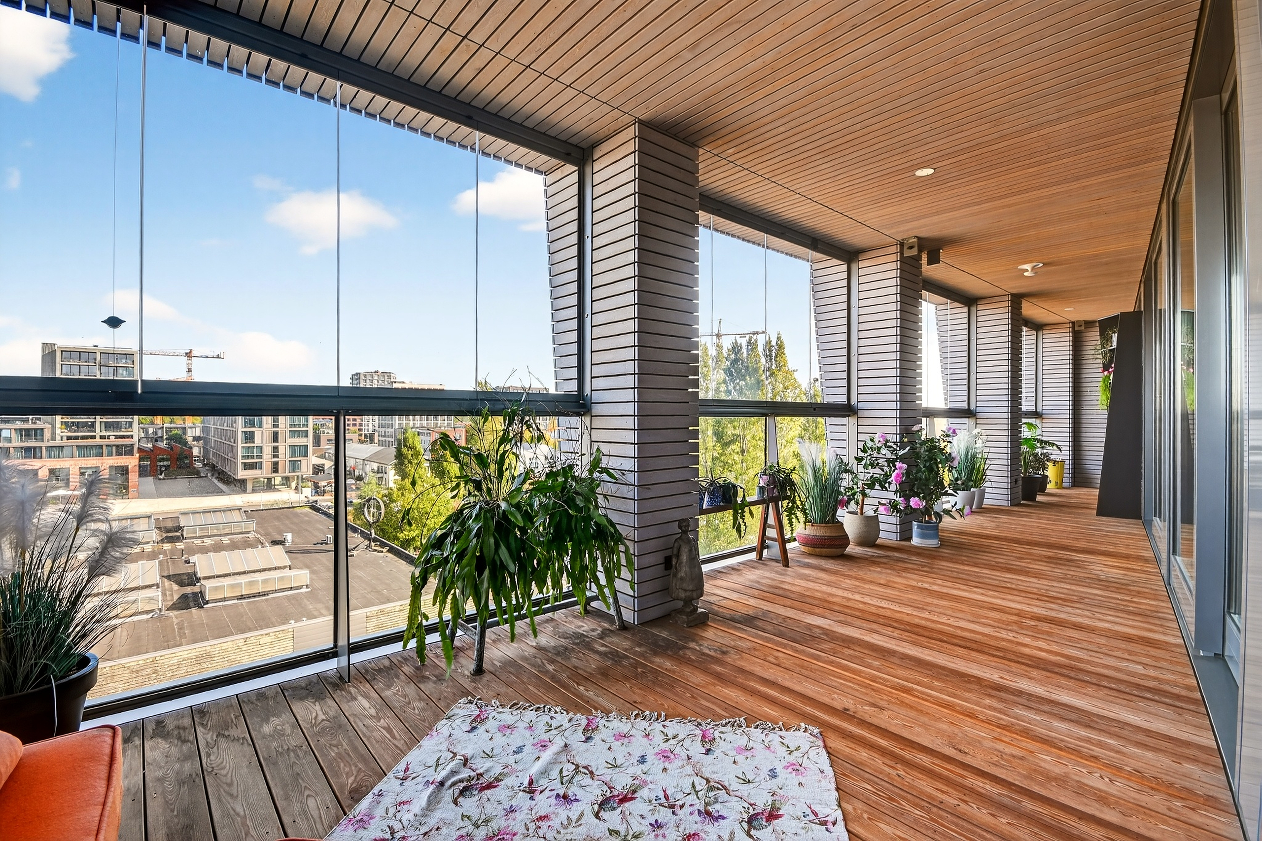 De loggia van 32 m² voelt als een verlengde van de woonkamer. Dankzij de glazen schuifwanden bepaal je zelf hoe open of beschut je de ruimte wilt gebruiken, waardoor je hier van vroeg in het voorjaar tot laat in de herfst comfortabel kunt zitten.
