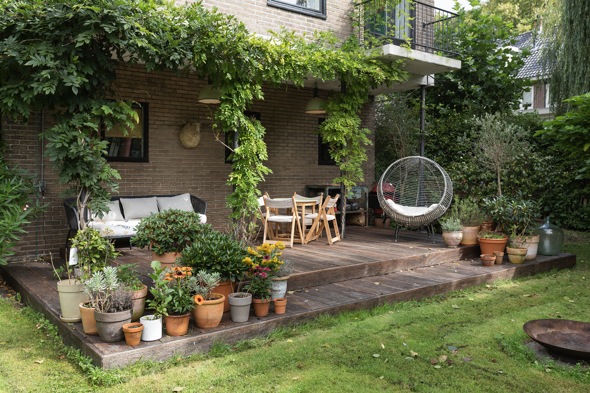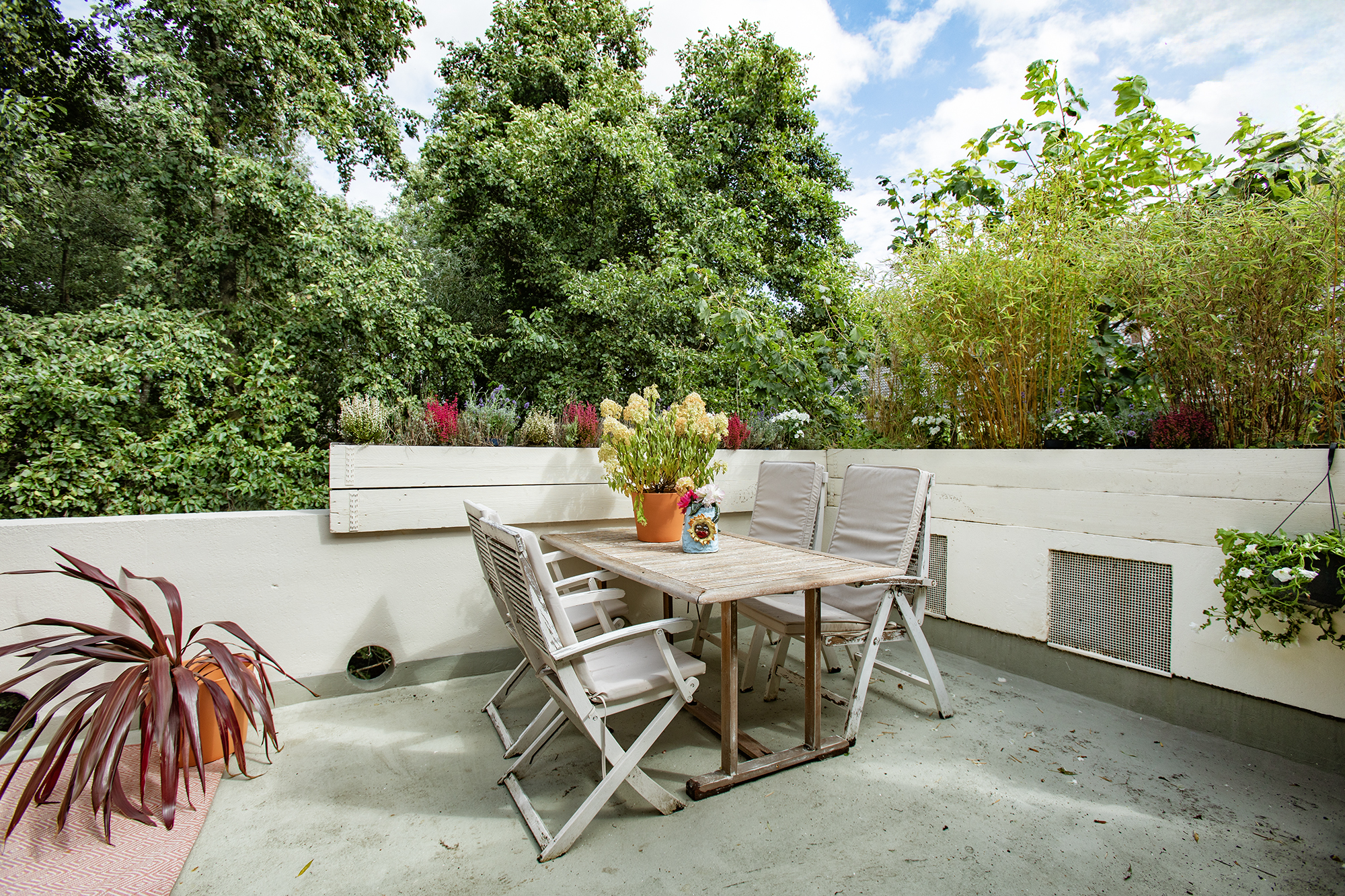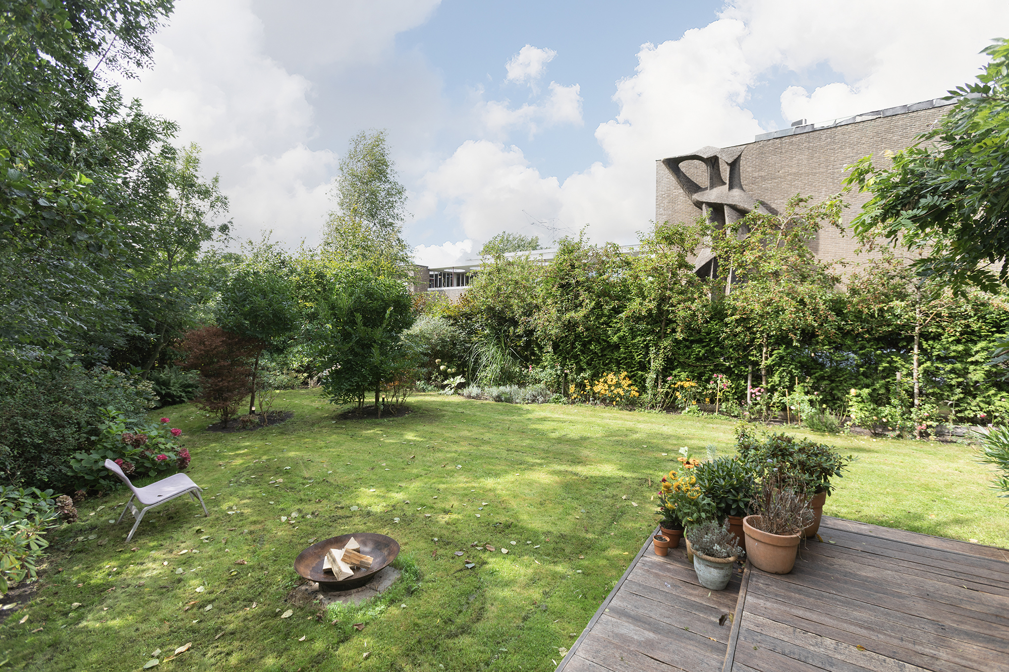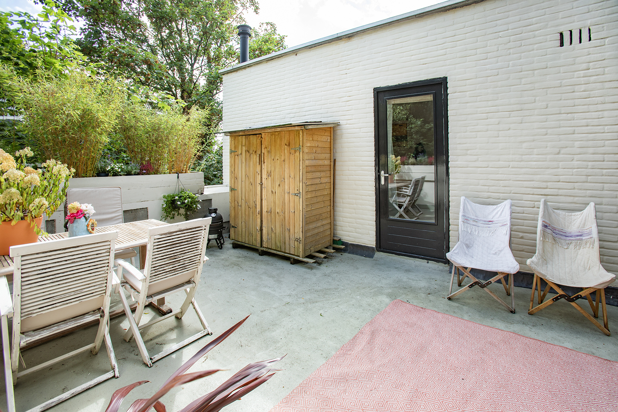 De tuin ligt op het westen en is ruim opgezet. Er zijn meerdere terrassen, een overkapping van oude scheepsvloerdelen, een vuurplaats, elektra en een buitenkraan. Je kunt er zitten, spelen, tuinieren of juist ontspannen. Naast de tuin zijn er ook meerdere balkons en een dakterras — altijd een plek in de zon of juist in de schaduw, afhankelijk van het moment van de dag.