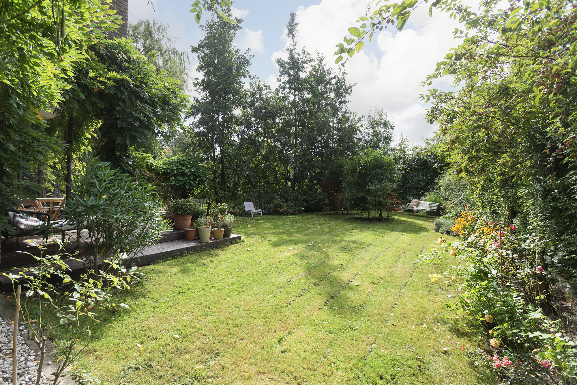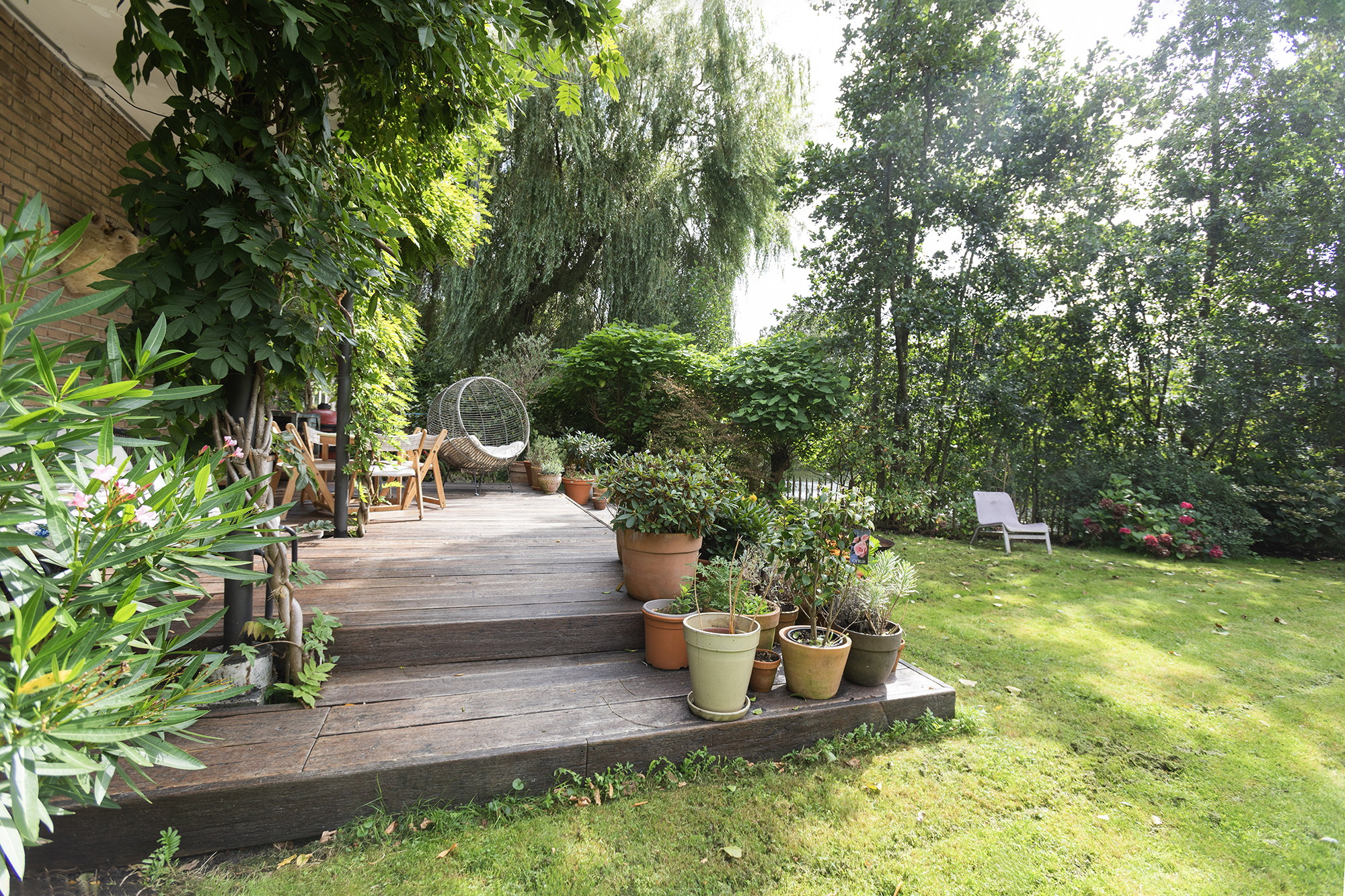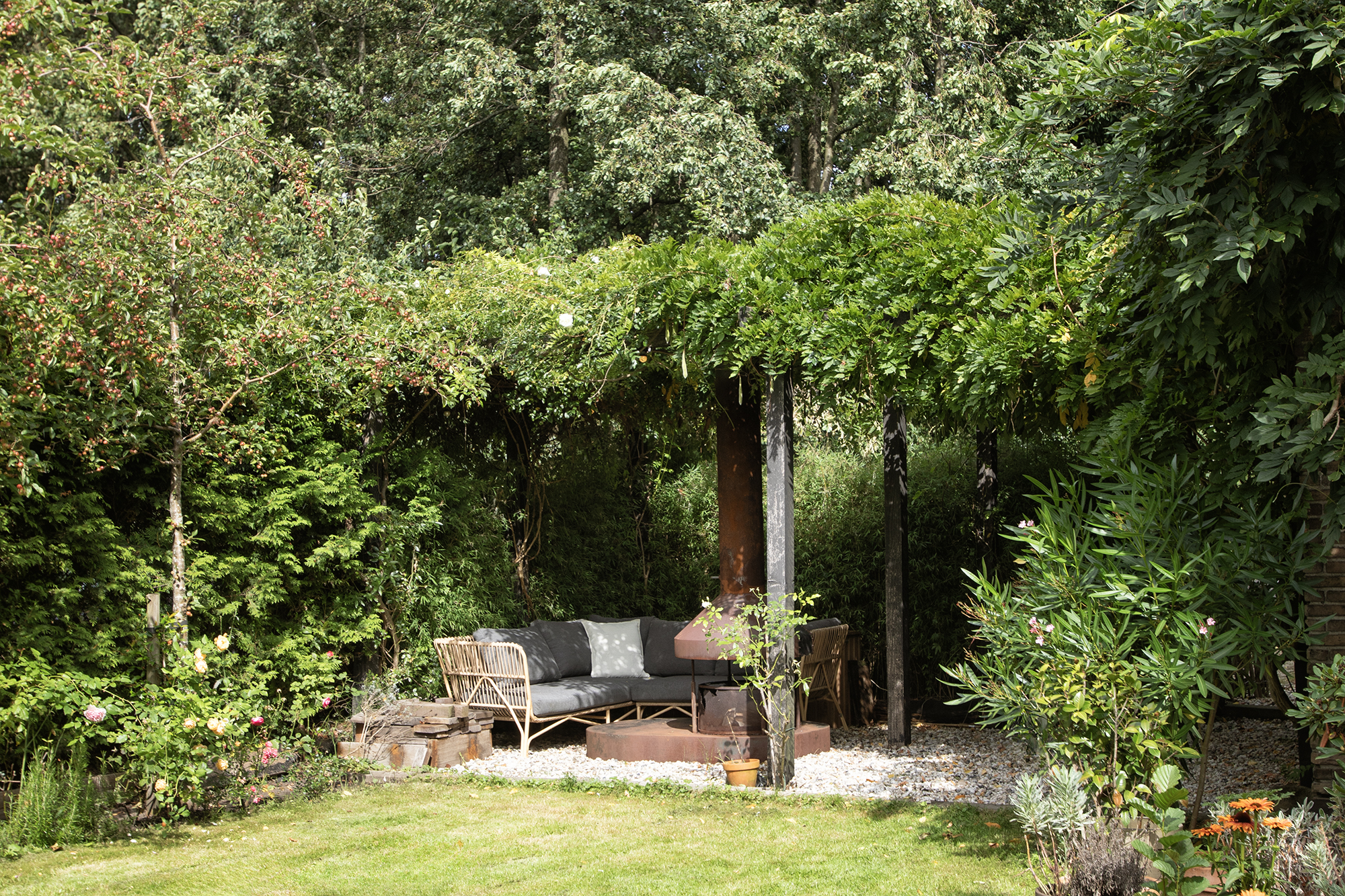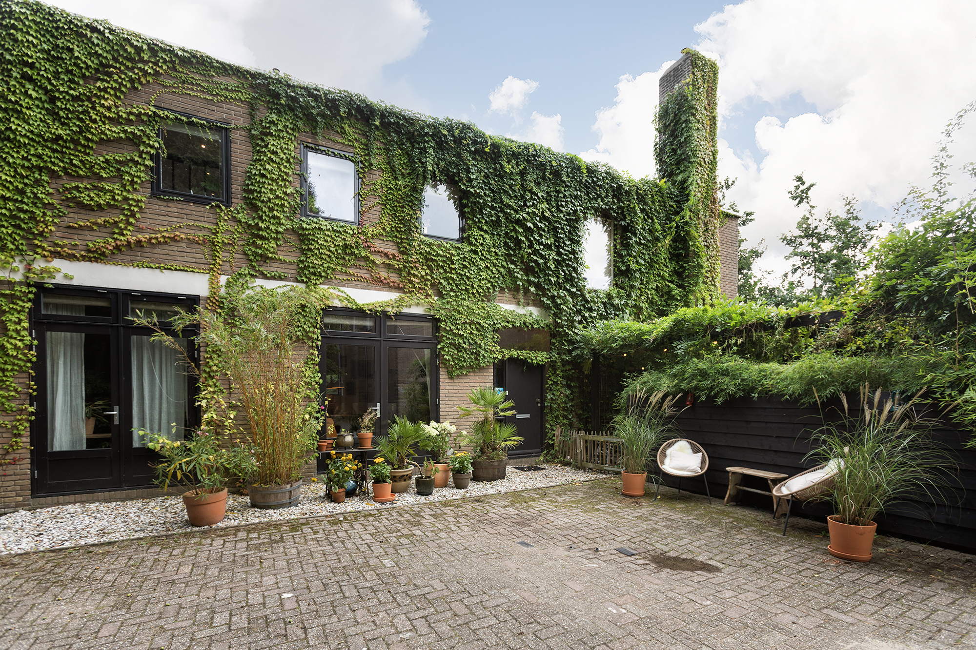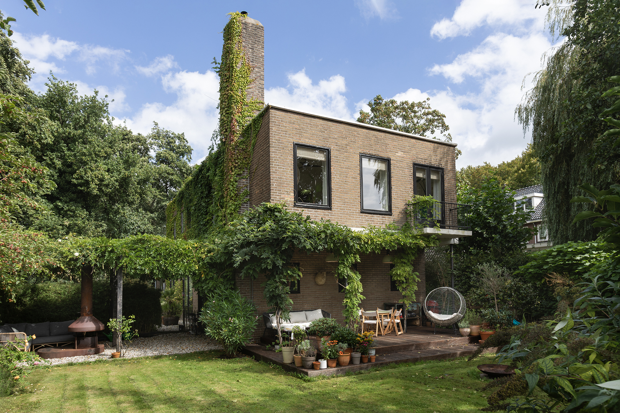 De tuin ligt op het westen en is ruim opgezet. Er zijn meerdere terrassen, een overkapping van oude scheepsvloerdelen, een vuurplaats, elektra en een buitenkraan. Je kunt er zitten, spelen, tuinieren of juist ontspannen. Naast de tuin zijn er ook meerdere balkons en een dakterras — altijd een plek in de zon of juist in de schaduw, afhankelijk van het moment van de dag.