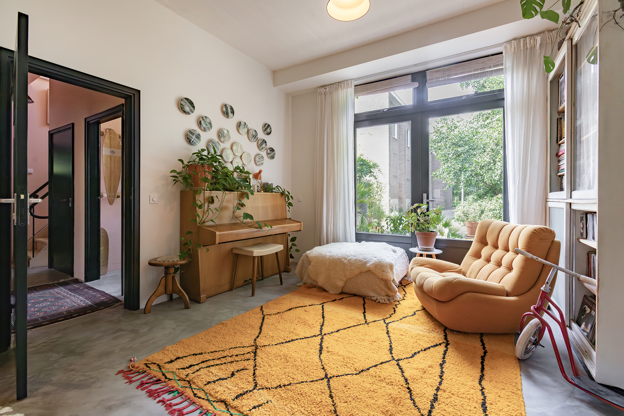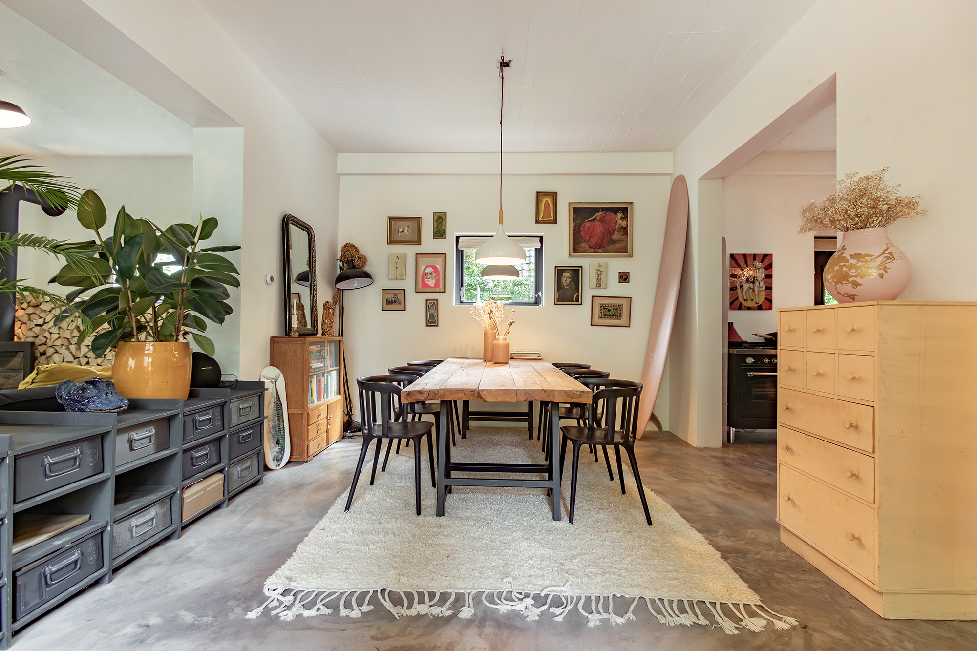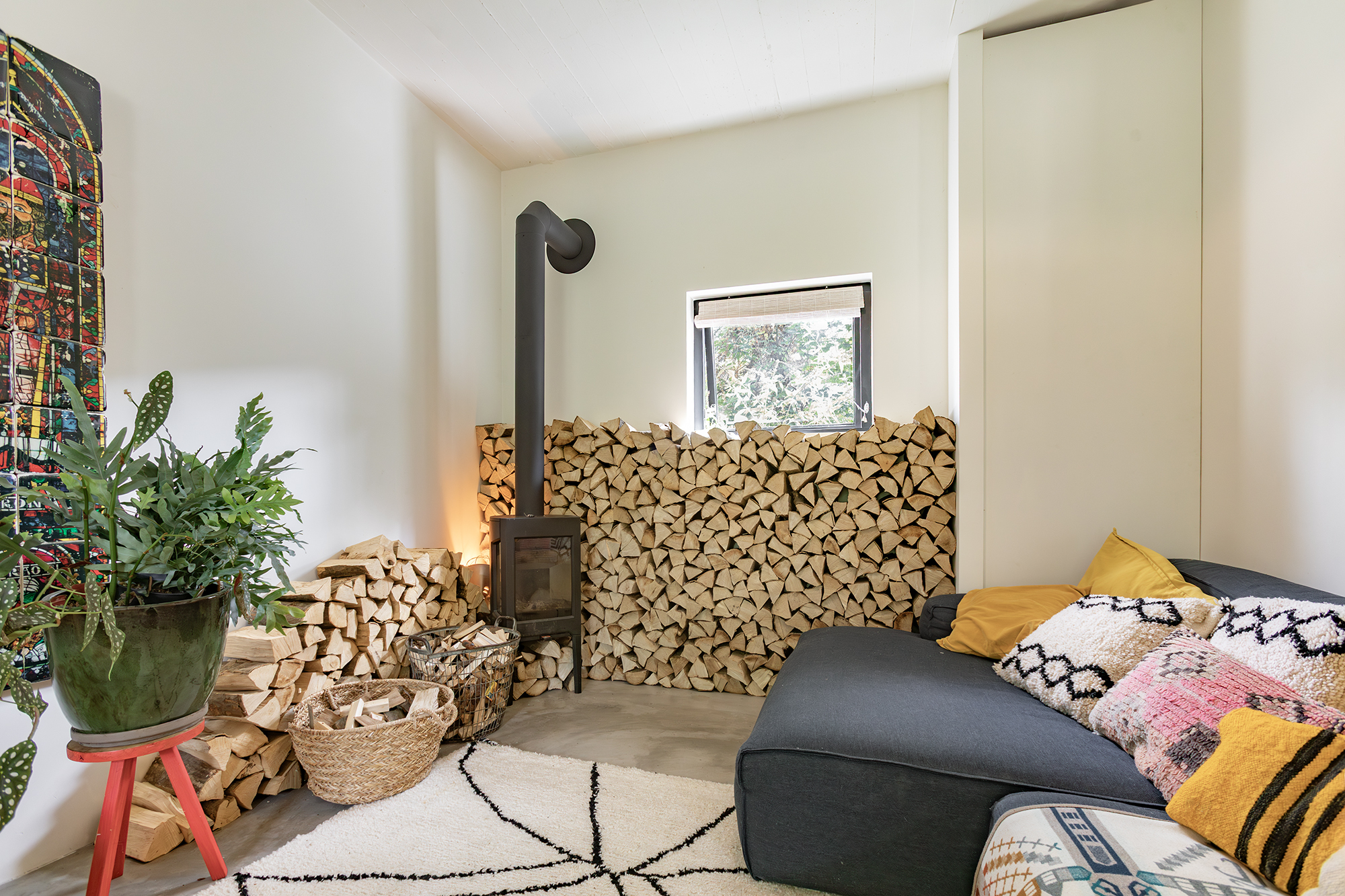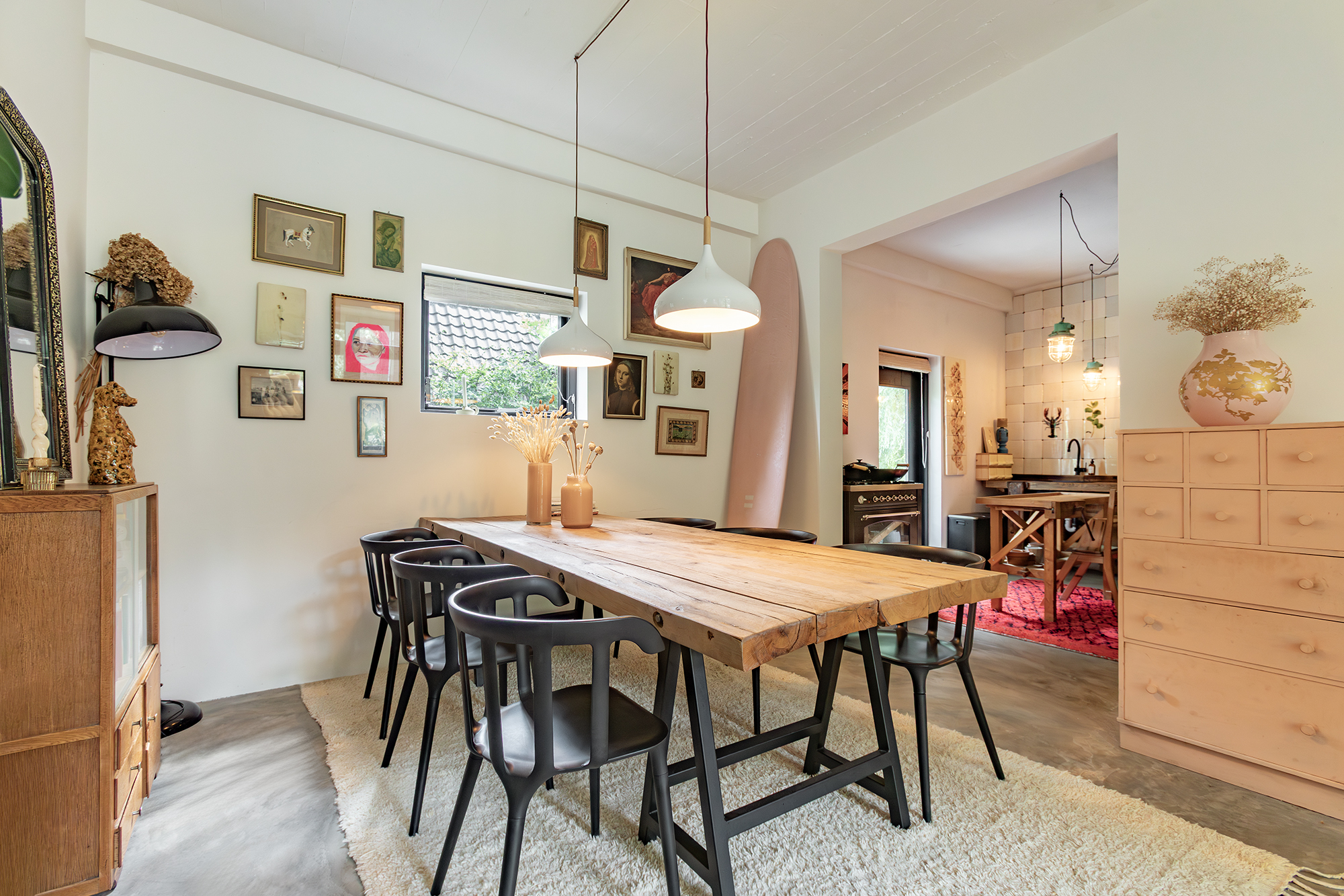 Bij binnenkomst merk je het meteen: dit is geen standaard huis. De hoge plafonds, grote ramen en speelse indeling zorgen voor een eigen sfeer. De begane grond heeft een royale woonkamer met betonvloer, vloerverwarming en openslaande deuren naar de tuin. Een houtkachel zorgt voor warmte en sfeer in de koudere maanden. Op de eerste verdieping is nog een tweede woonkamer. Licht, rustig en met een tweede houtkachel – een fijne plek om je even terug te trekken of juist als extra leefruimte te gebruiken. De sfeer in huis is krachtig en eigenzinnig, maar voelt ook warm en uitnodigend.