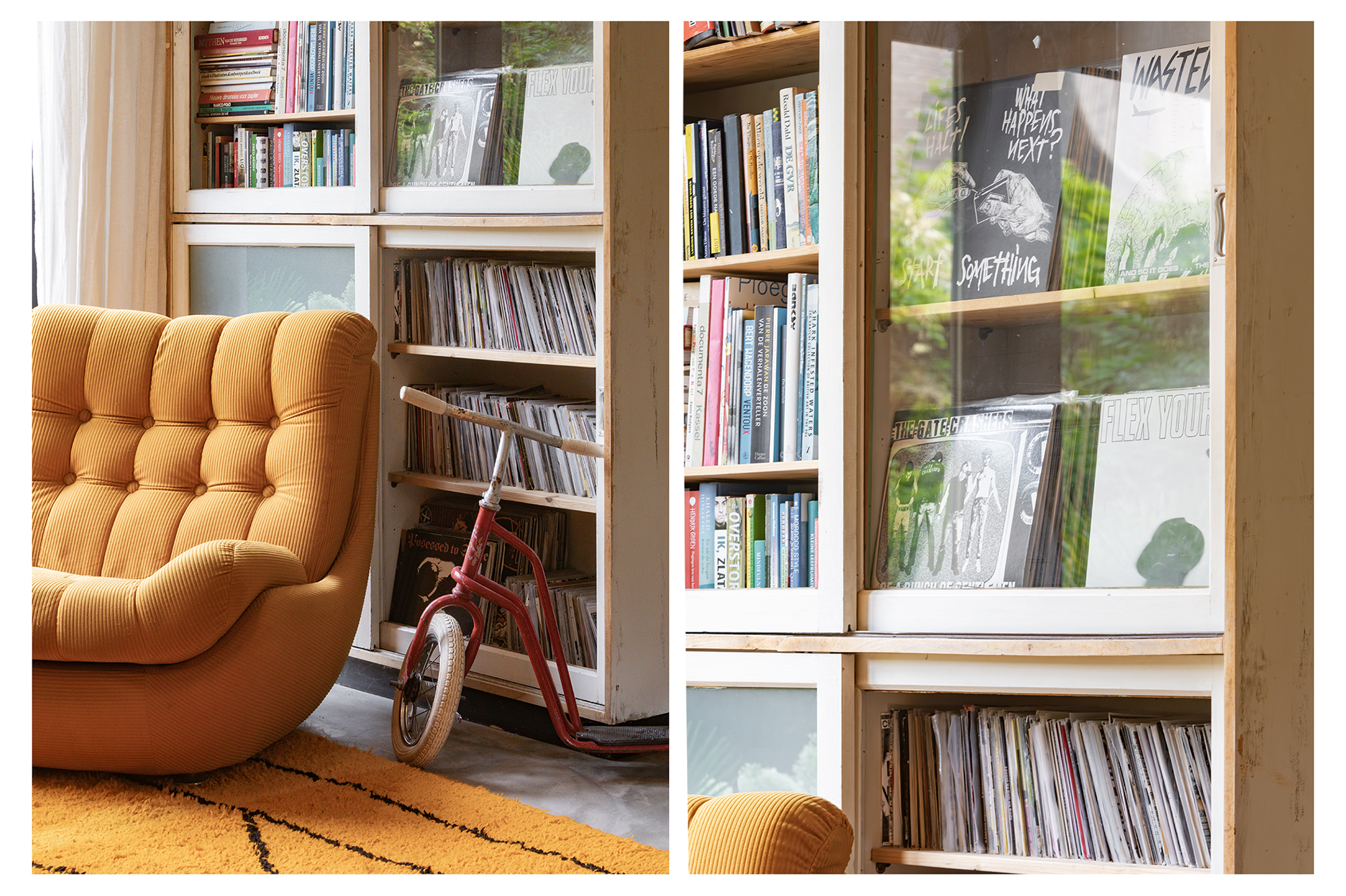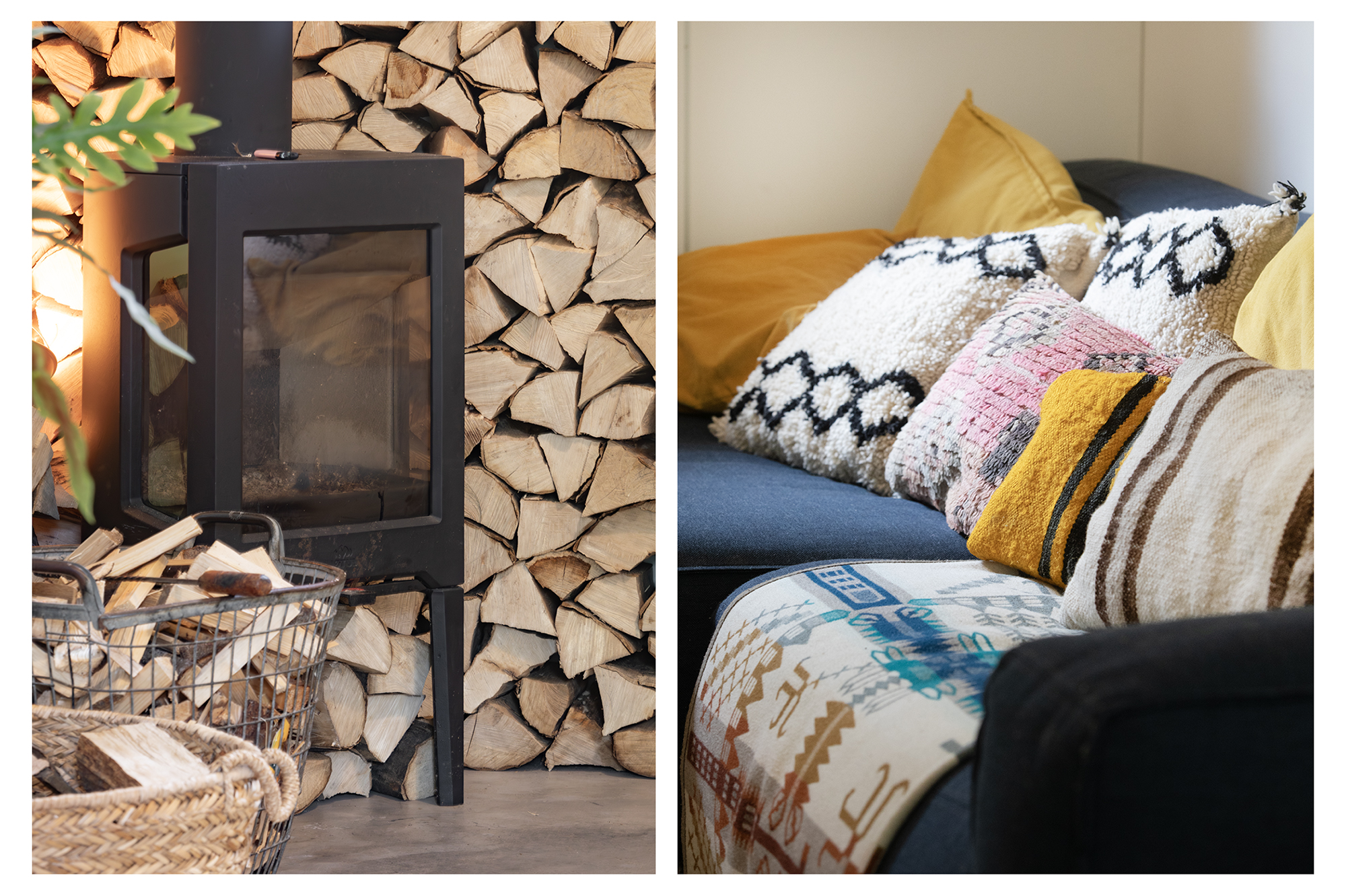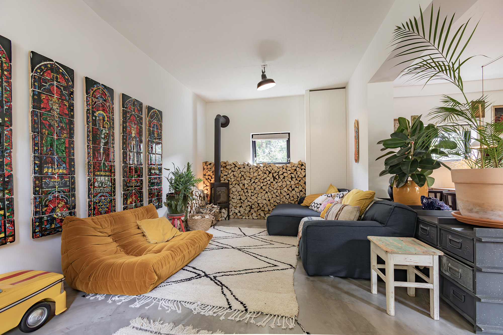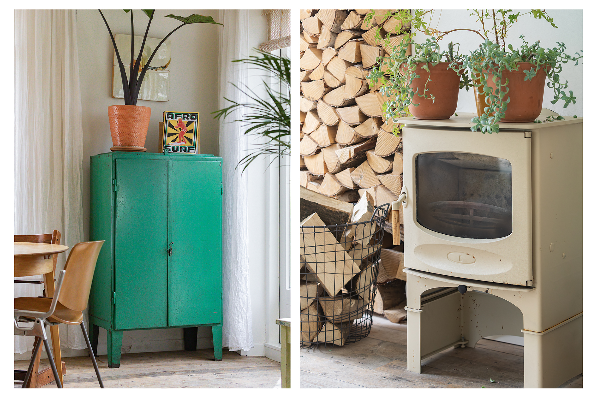 Bij binnenkomst merk je het meteen: dit is geen standaard huis. De hoge plafonds, grote ramen en speelse indeling zorgen voor een eigen sfeer. De begane grond heeft een royale woonkamer met betonvloer, vloerverwarming en openslaande deuren naar de tuin. Een houtkachel zorgt voor warmte en sfeer in de koudere maanden. Op de eerste verdieping is nog een tweede woonkamer. Licht, rustig en met een tweede houtkachel – een fijne plek om je even terug te trekken of juist als extra leefruimte te gebruiken. De sfeer in huis is krachtig en eigenzinnig, maar voelt ook warm en uitnodigend.