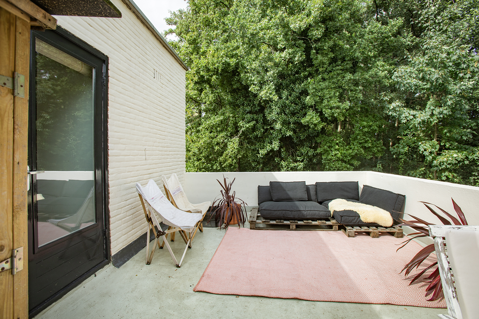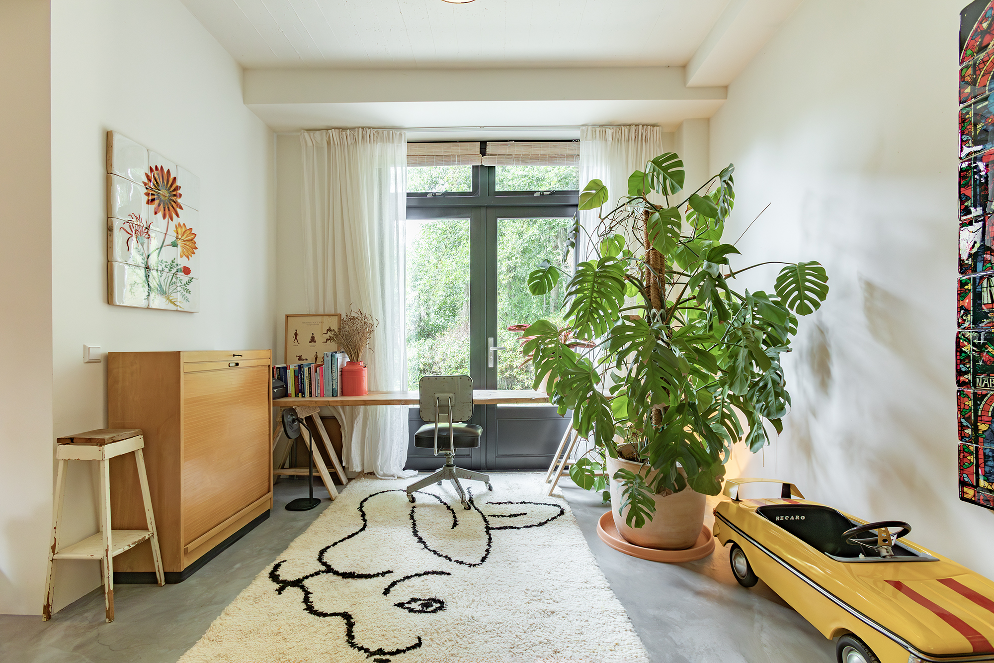 From the moment you step inside, you’ll notice: this is not a standard home. The high ceilings, large windows, and playful layout create a unique atmosphere. The ground floor features a spacious living room with concrete flooring, underfloor heating, and French doors opening onto the garden. A wood stove adds warmth and ambiance during the colder months. On the first floor you’ll find a second living room. Light, calm, and equipped with a second wood stove — a perfect place to retreat or to use as an extra living area. The overall feel of the house is strong and distinctive, yet warm and inviting.