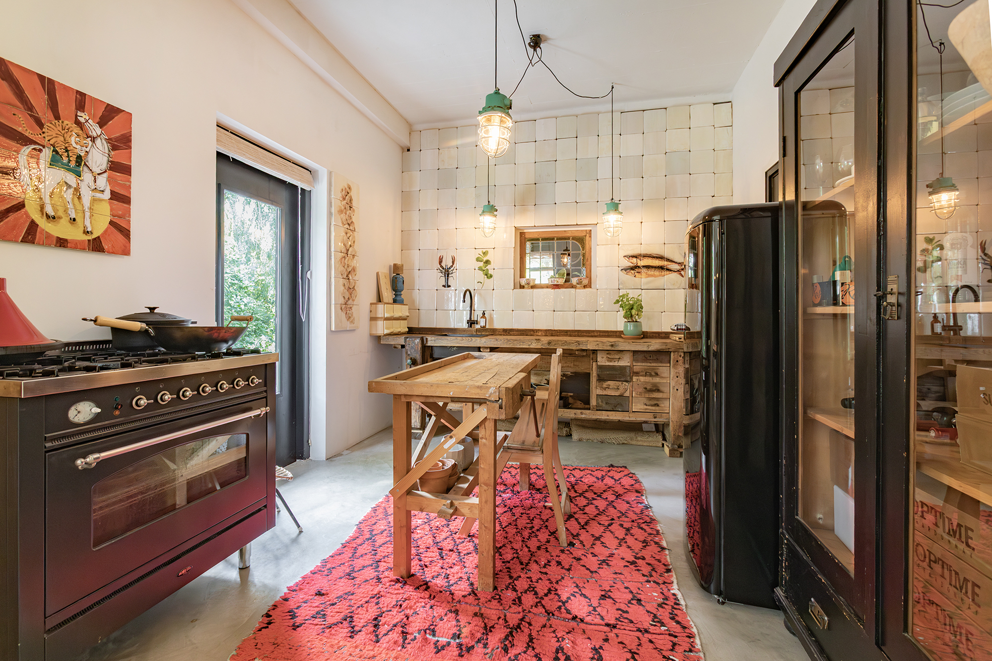 Beneden is een tweede keuken gemaakt, met een houten werkblad, kunstwand en deur naar de tuin. Ideaal bij gebruik van de tuin, voor gasten, voor een praktijk of atelier aan huis, of als zelfstandige verdieping bij dubbele bewoning.