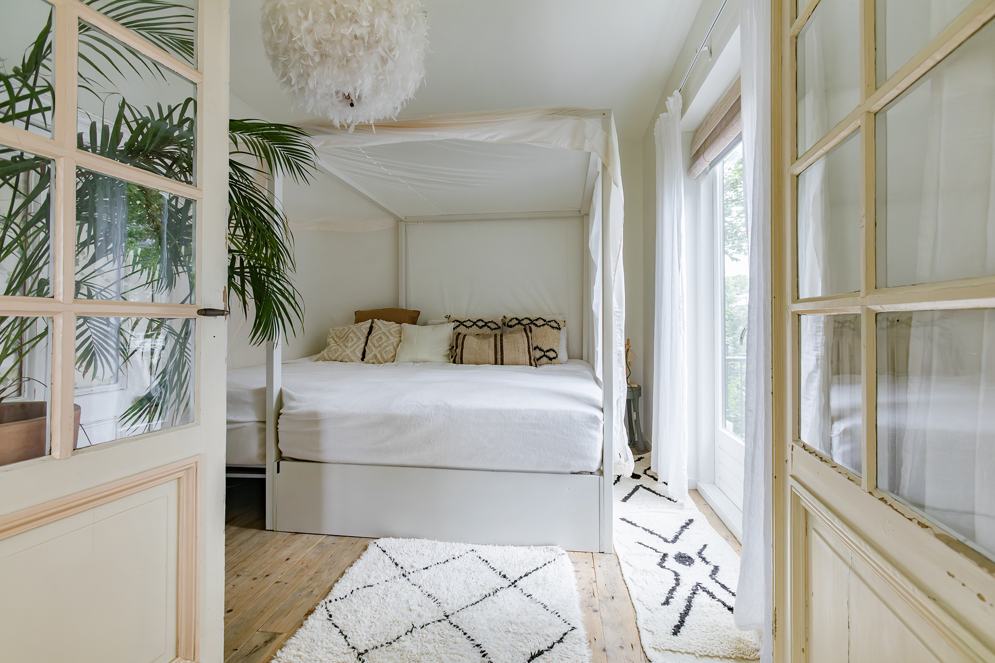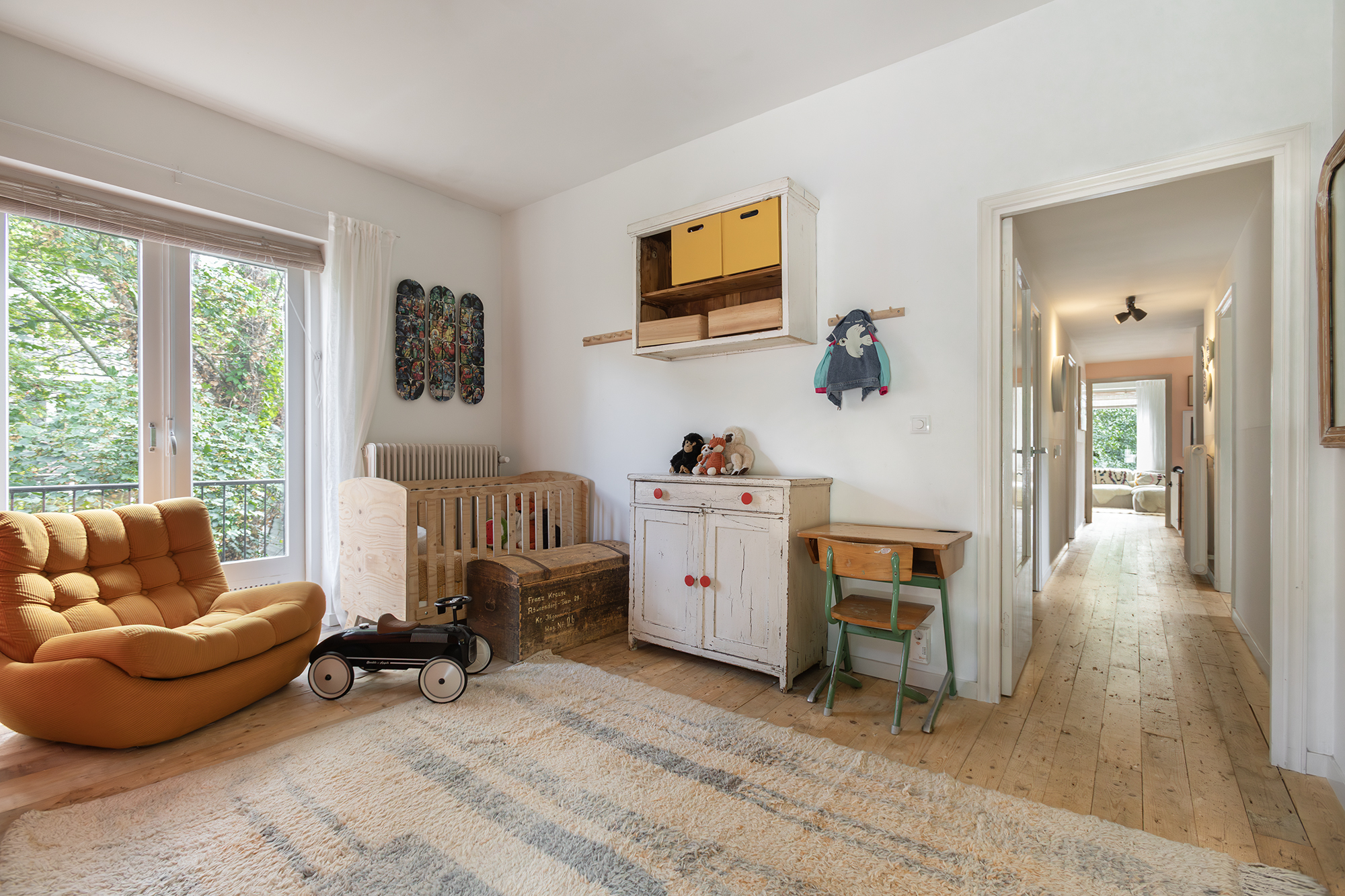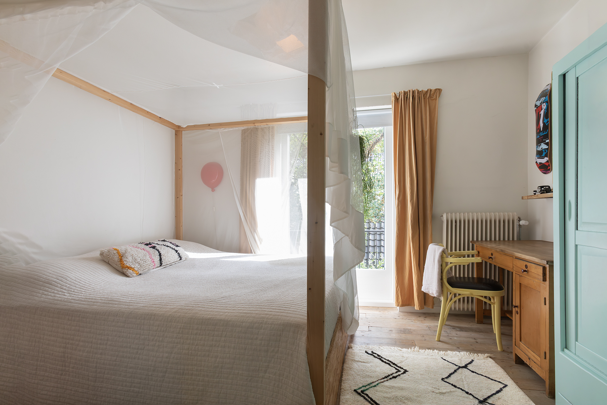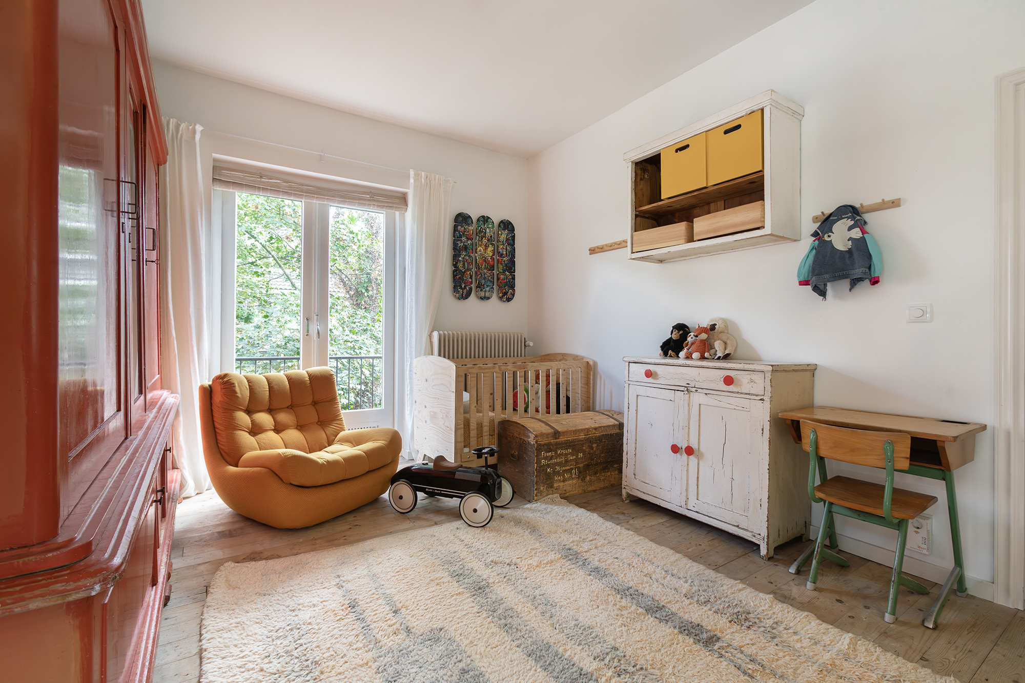 The bathroom was renovated in 2019 and includes a bathtub, walk-in shower, double sink, underfloor heating, and terrazzo flooring. The toilet is separate. On the ground floor, at the rear of the house, is a fourth bedroom. This room also works well as a study or atelier — especially in combination with the second kitchen and its own entrance. This makes the ground floor highly versatile to suit the residents’ needs.