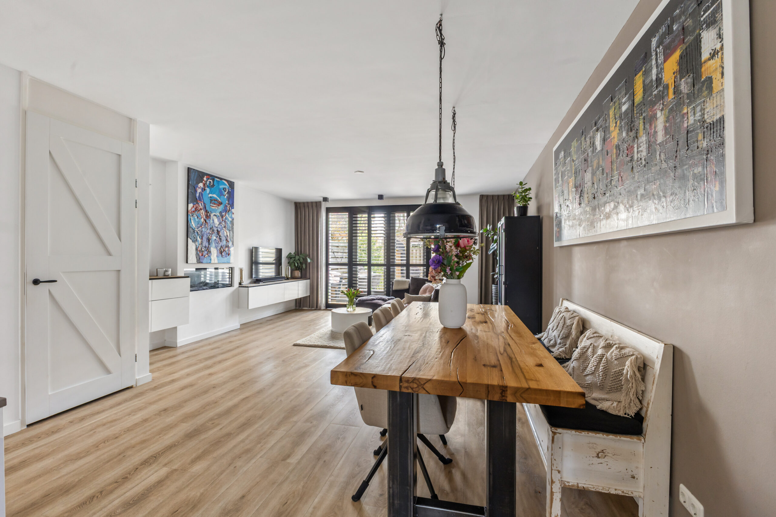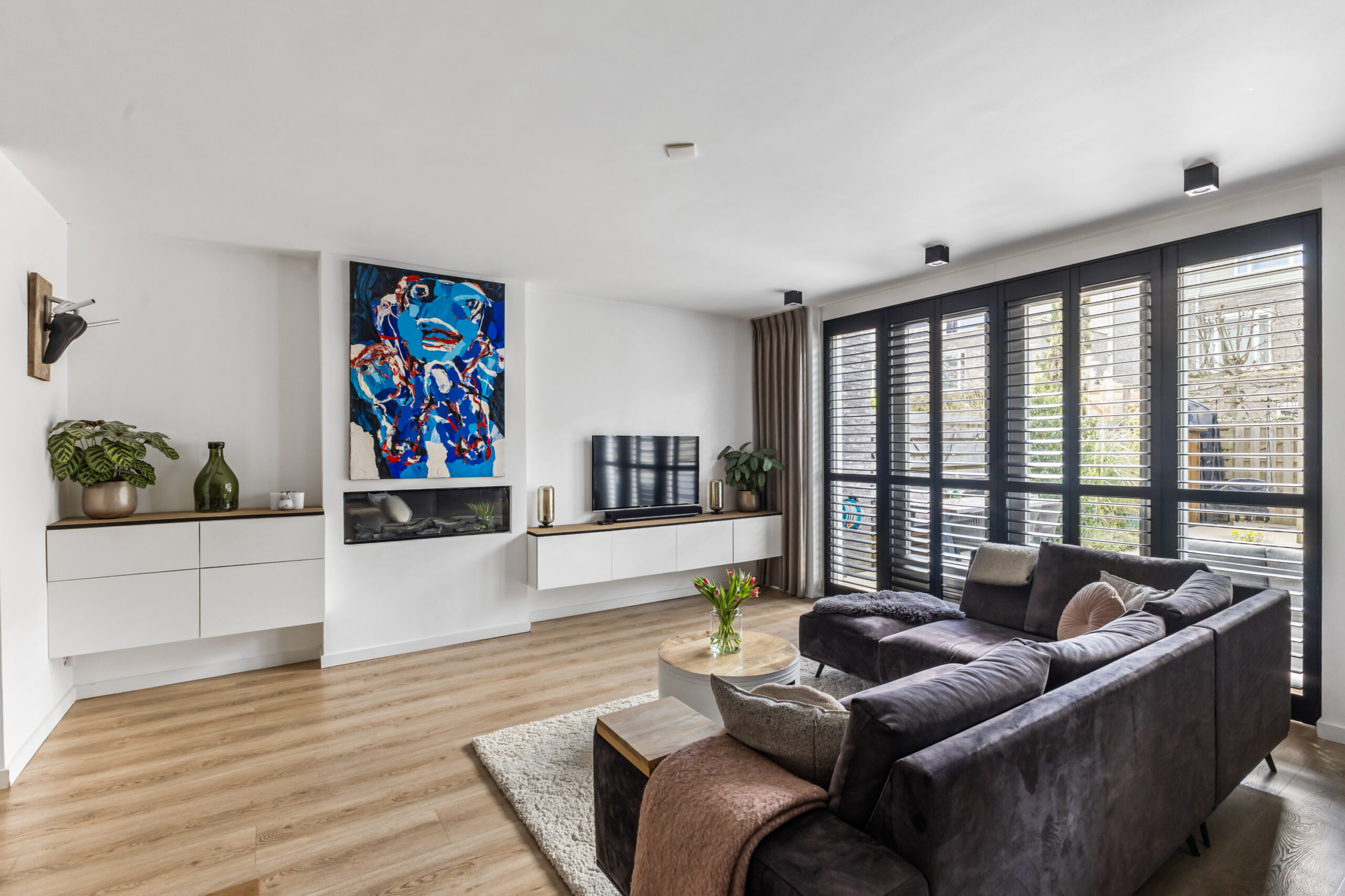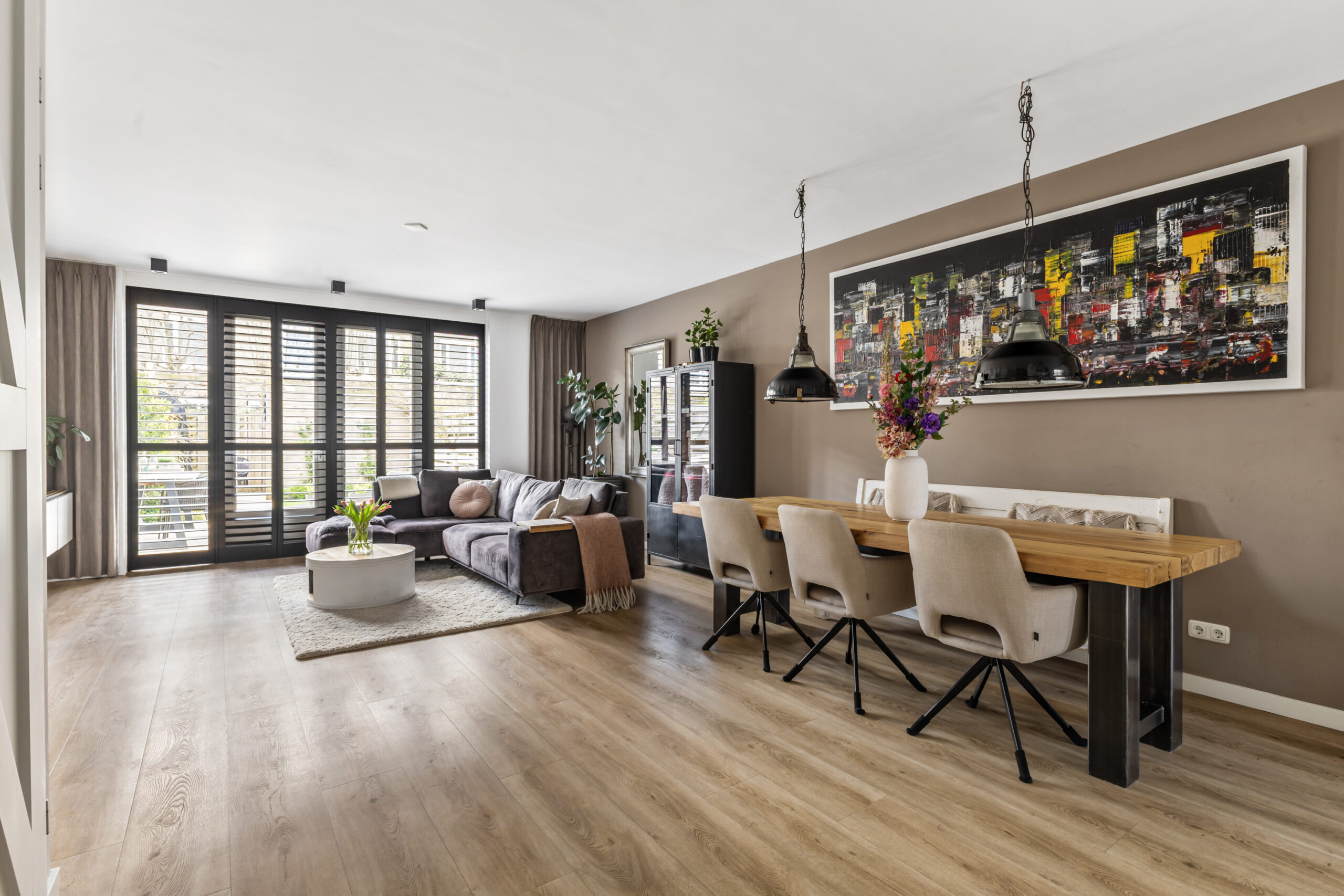 The living room is located at the rear and is wonderfully bright thanks to the large windows. You overlook the garden here, which immediately creates a sense of calm. There is plenty of space for a generous seating area and a large dining table.