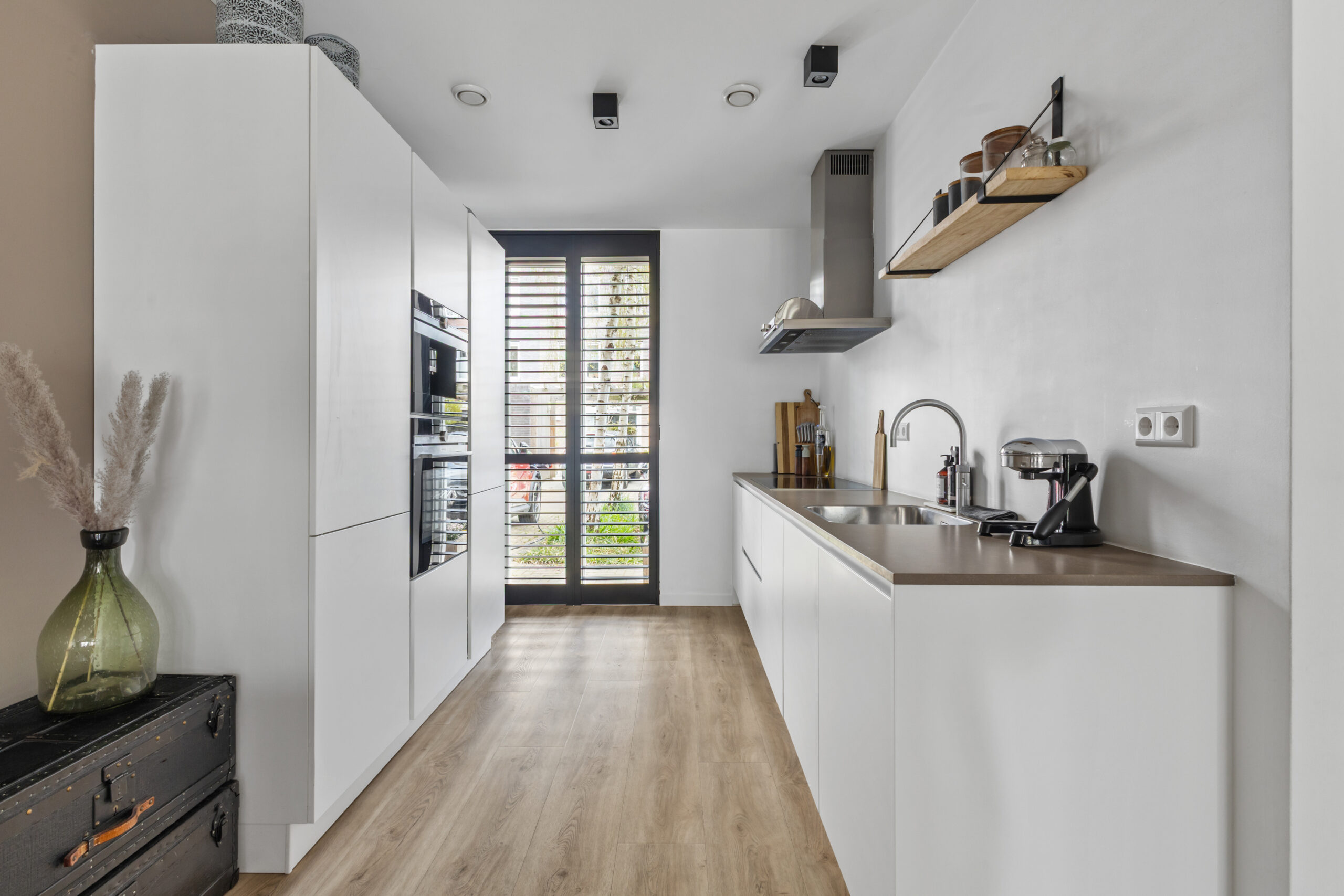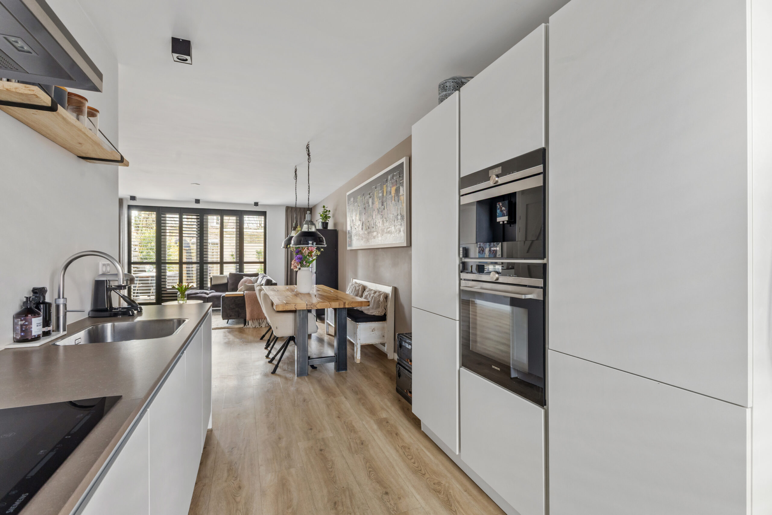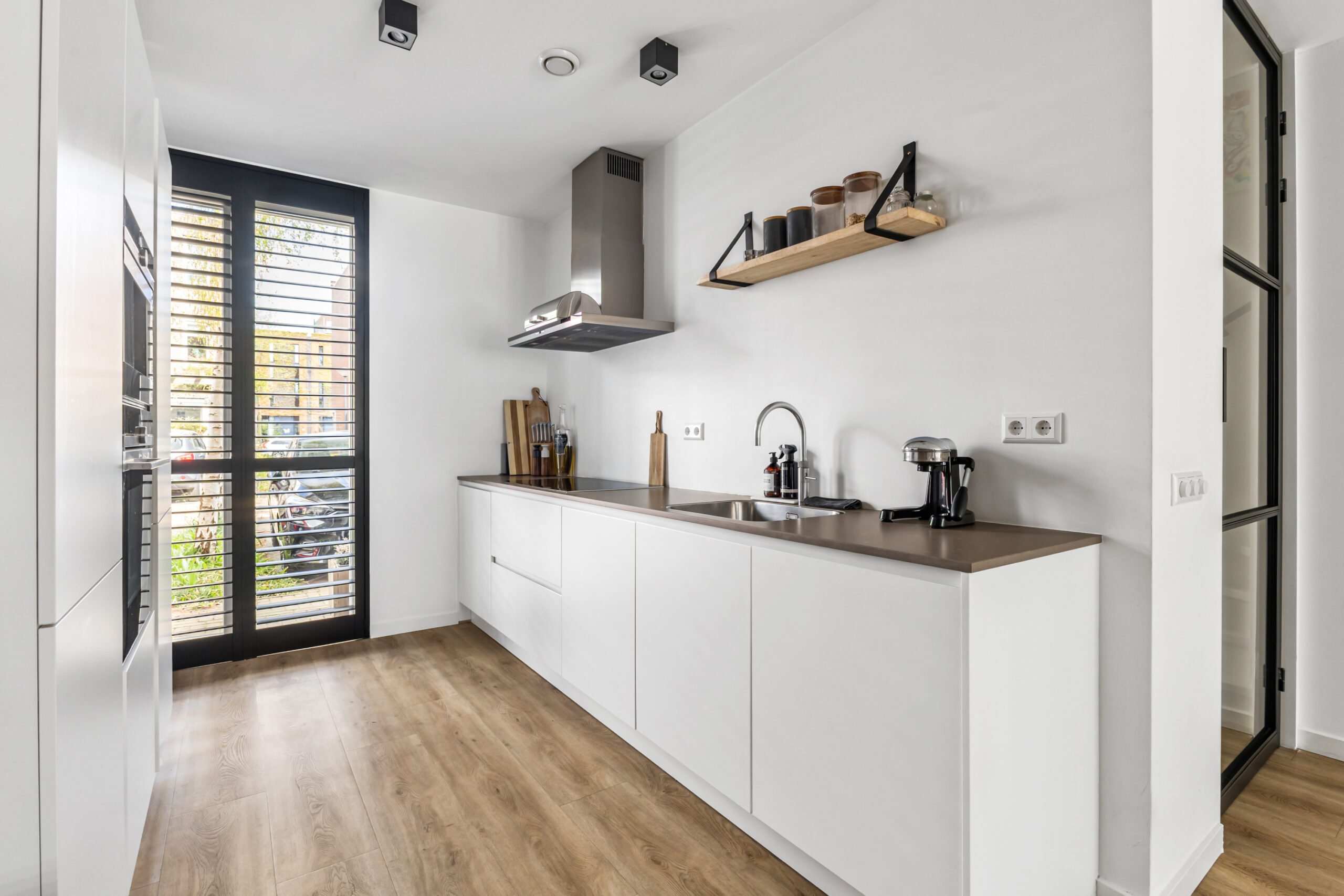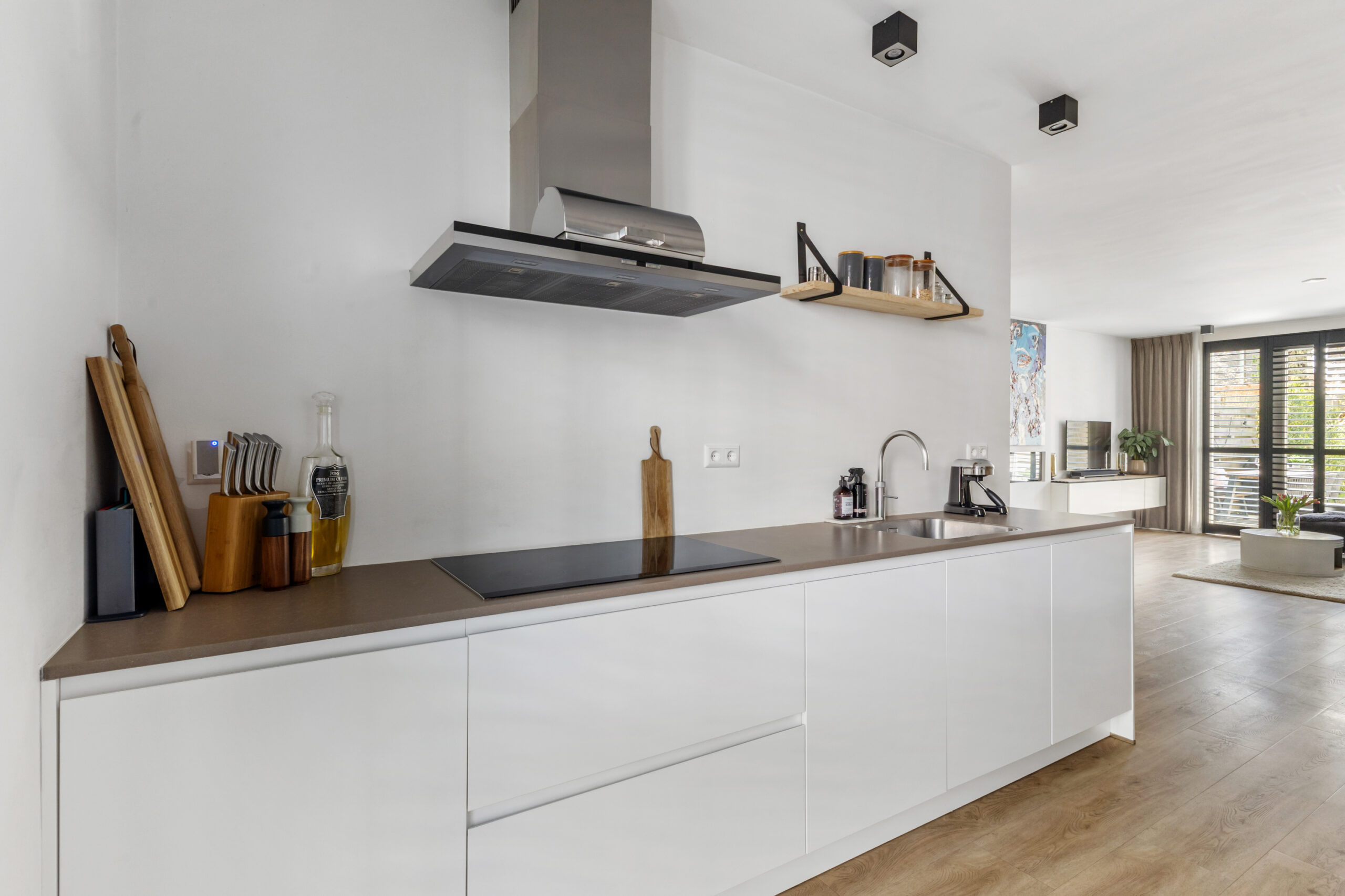 De keuken ligt aan de voorzijde en is praktisch ingericht met voldoende werk- en kastruimte. Je kookt hier met uitzicht op de straat, terwijl je toch verbonden blijft met de rest van de woning.