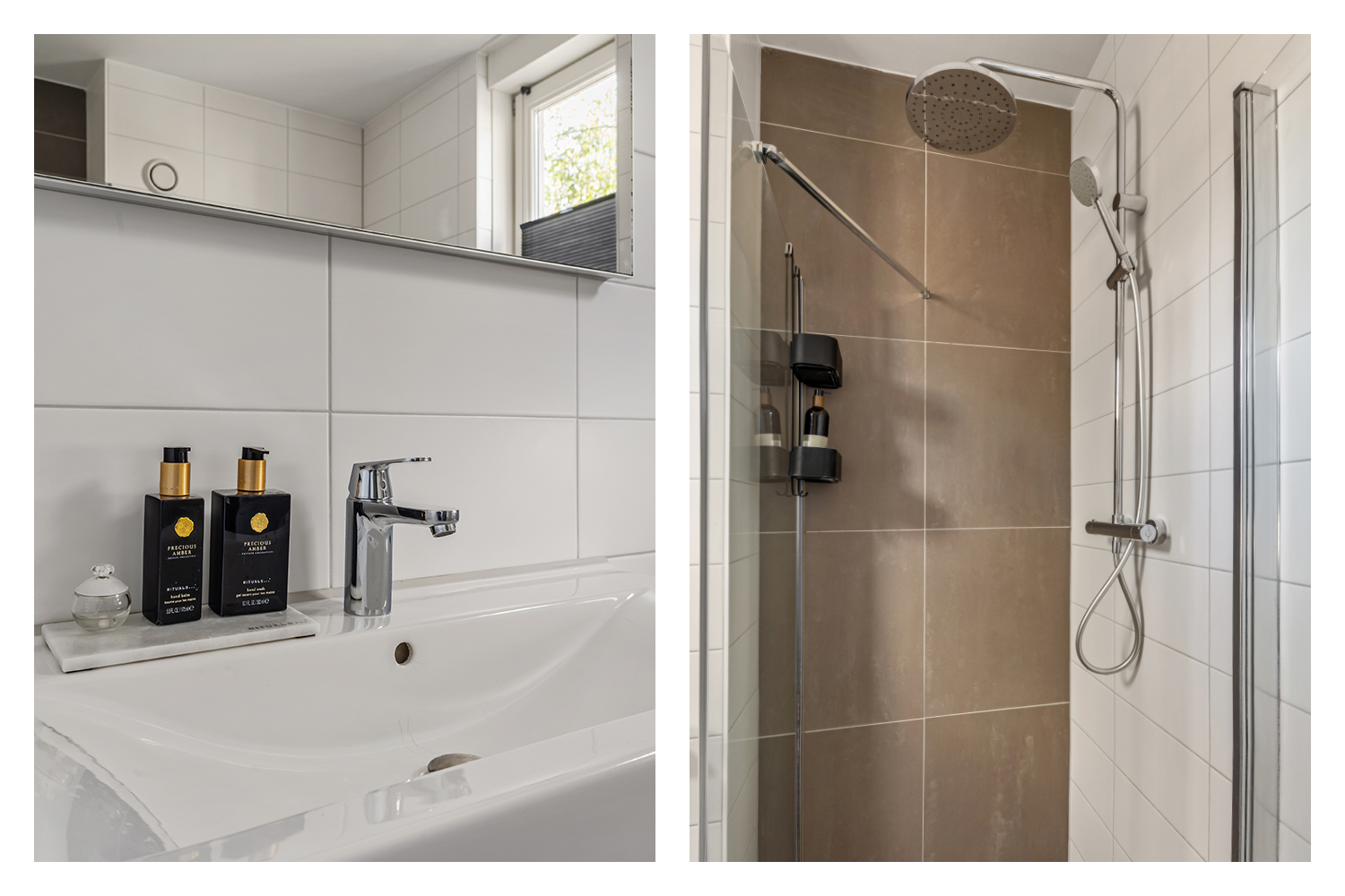The bathroom is fully equipped and neatly finished. A pleasant place to start and end your day.