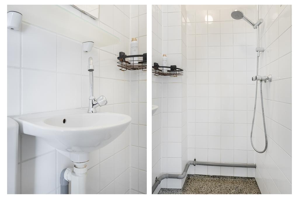 De badkamer is compact maar praktisch, voorzien van een douche, toilet en wastafel.