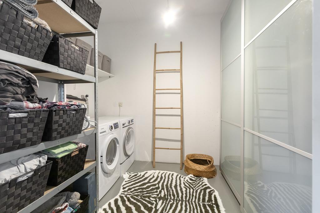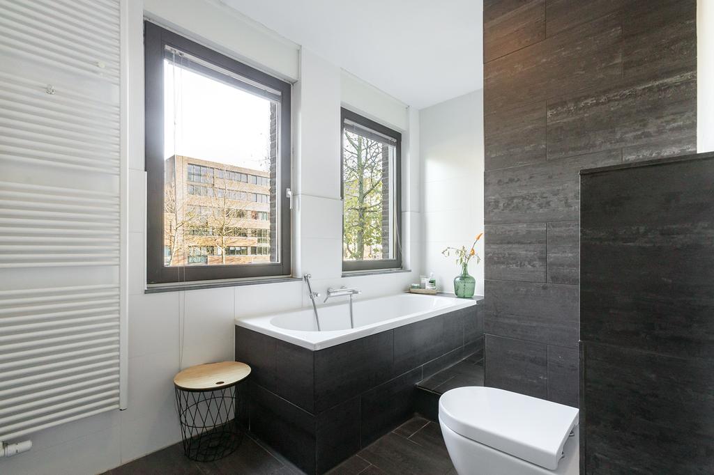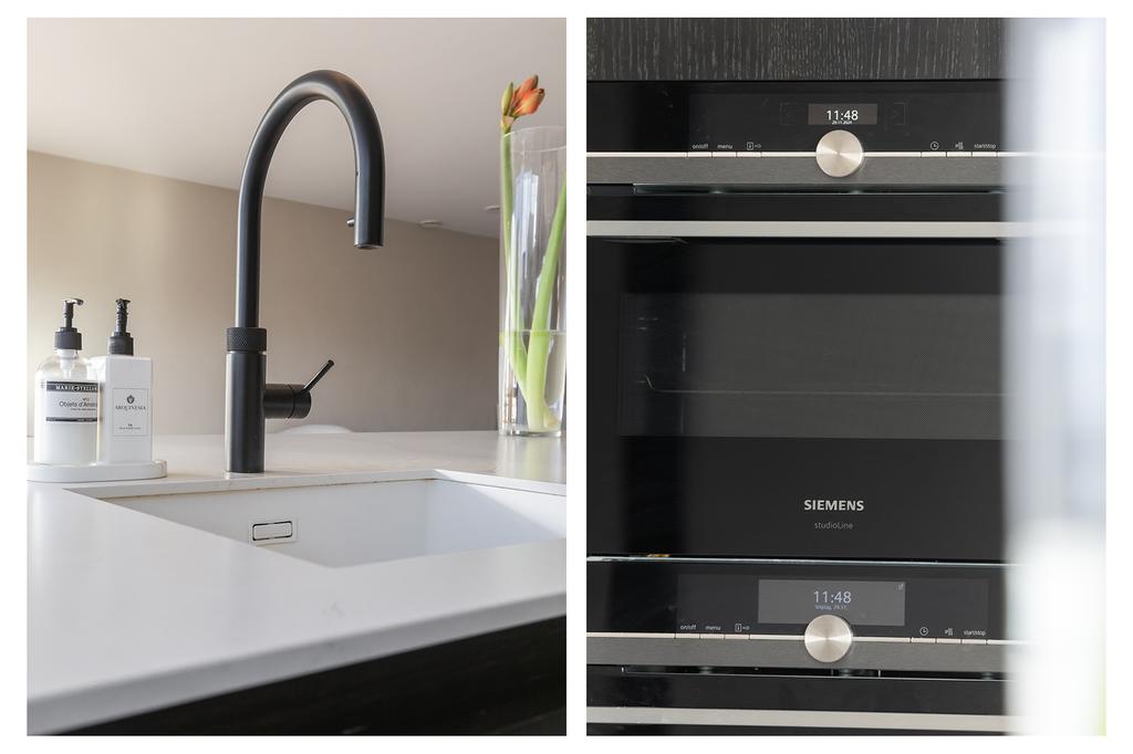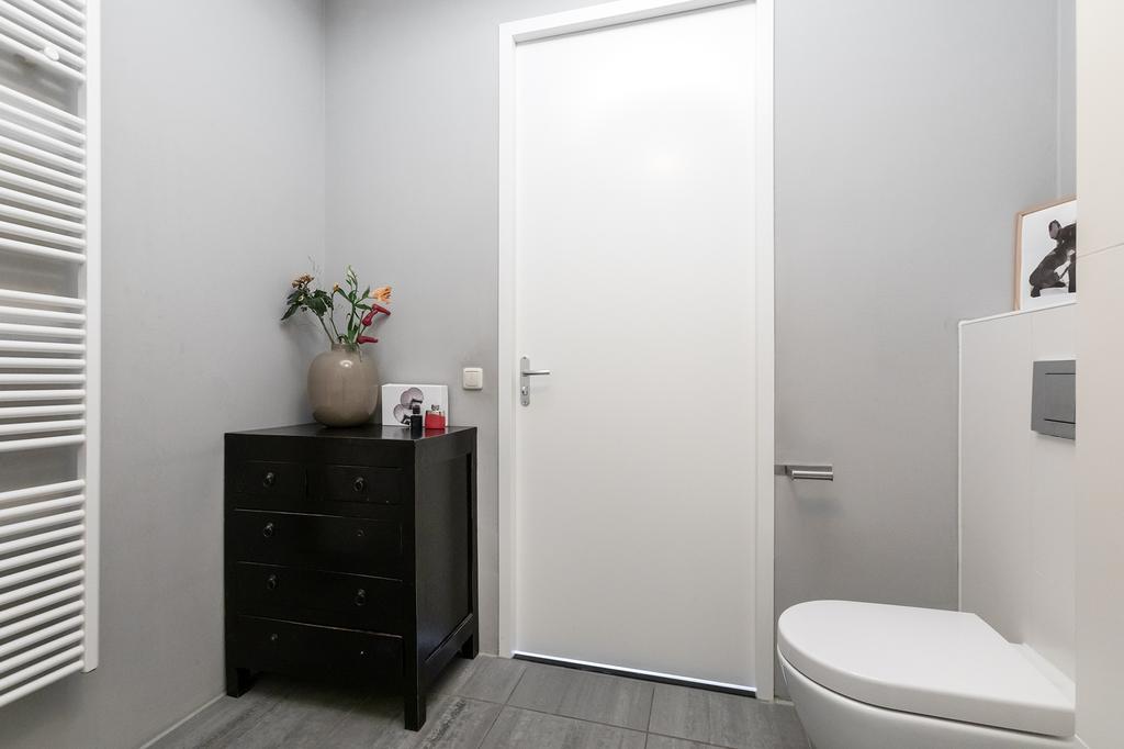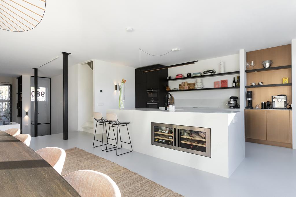 On the ground floor, you will find the recently renovated, open living space with a contemporary cast floor that creates a calm, modern atmosphere. The extra width at the back makes the living area exceptionally spacious and bright. The new kitchen, relocated to the garden side, features a cooking island with high-end appliances. The pictures speak for themselves: with the use of premium materials and an impressive design, the kitchen is a real showstopper. Large glass doors seamlessly connect the kitchen to the sunny garden, blending indoor and outdoor spaces.