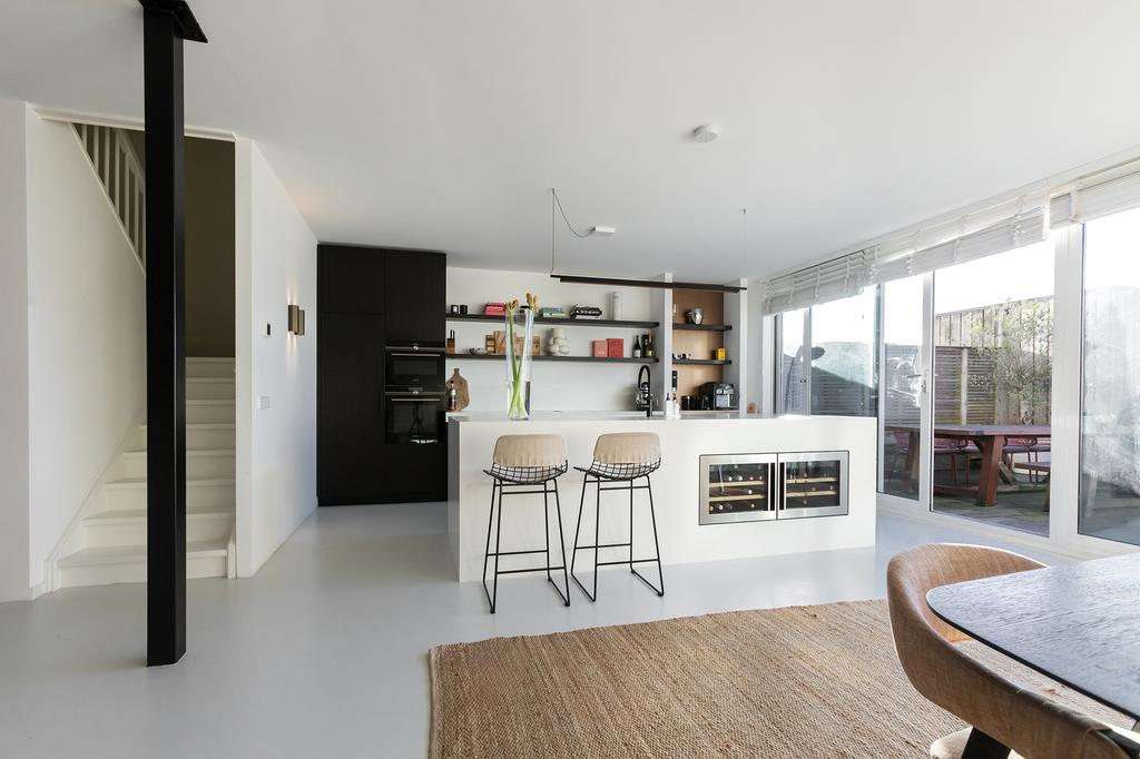 Op de begane grond vind je de recent verbouwde, open woonruimte met een eigentijdse gietvloer die zorgt voor een rustige, moderne sfeer. Dankzij de extra breedte aan de achterzijde is de leefruimte bijzonder ruim en licht. De nieuwe keuken, verplaatst naar de tuinkant, beschikt over een kookeiland met luxe inbouwapparatuur. De foto’s spreken voor zich: met het gebruik van hoogwaardige materialen en een indrukwekkend design, is de keuken een echte eyecatcher. Een grote glazen pui met openslaande deuren verbindt de keuken naadloos met de zonnige tuin, wat binnen en buiten samenbrengt.
