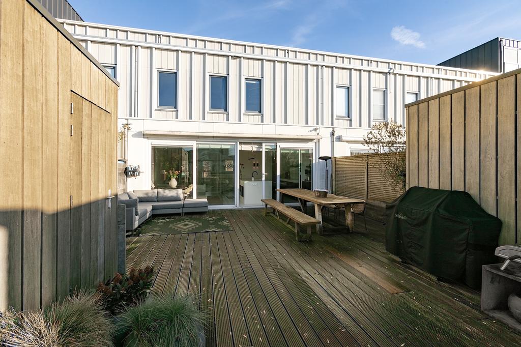 The terrace garden at the back faces the sunny southwest and enjoys sun from spring well into autumn. Here, you can bask in the sun until late evening, perfect for long summer nights with friends or family. An electric awning provides shade on warm days, while the space at the back of the garden offers extra storage in the shed and access to the private dock.