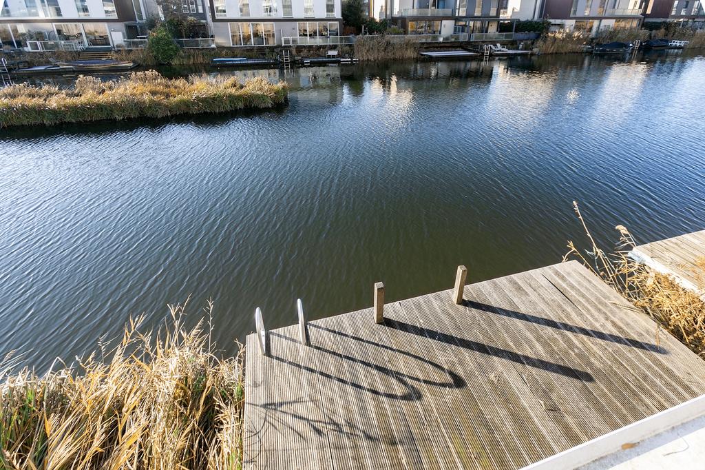 Unieke en extra brede woning aan het water met werkelijk prachtige luxe afwerking, eigen aanlegsteiger en 2 parkeerplaatsen.
