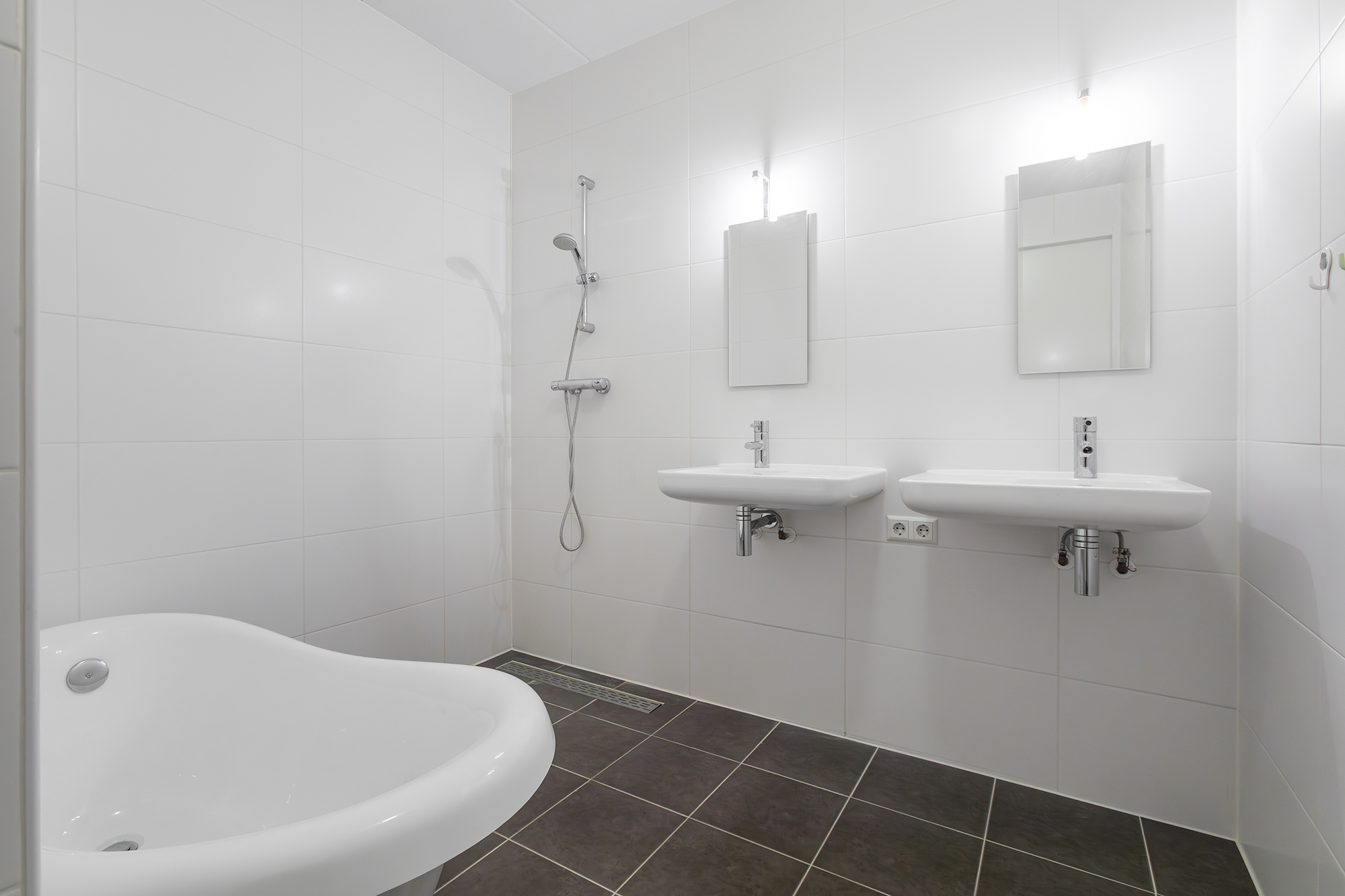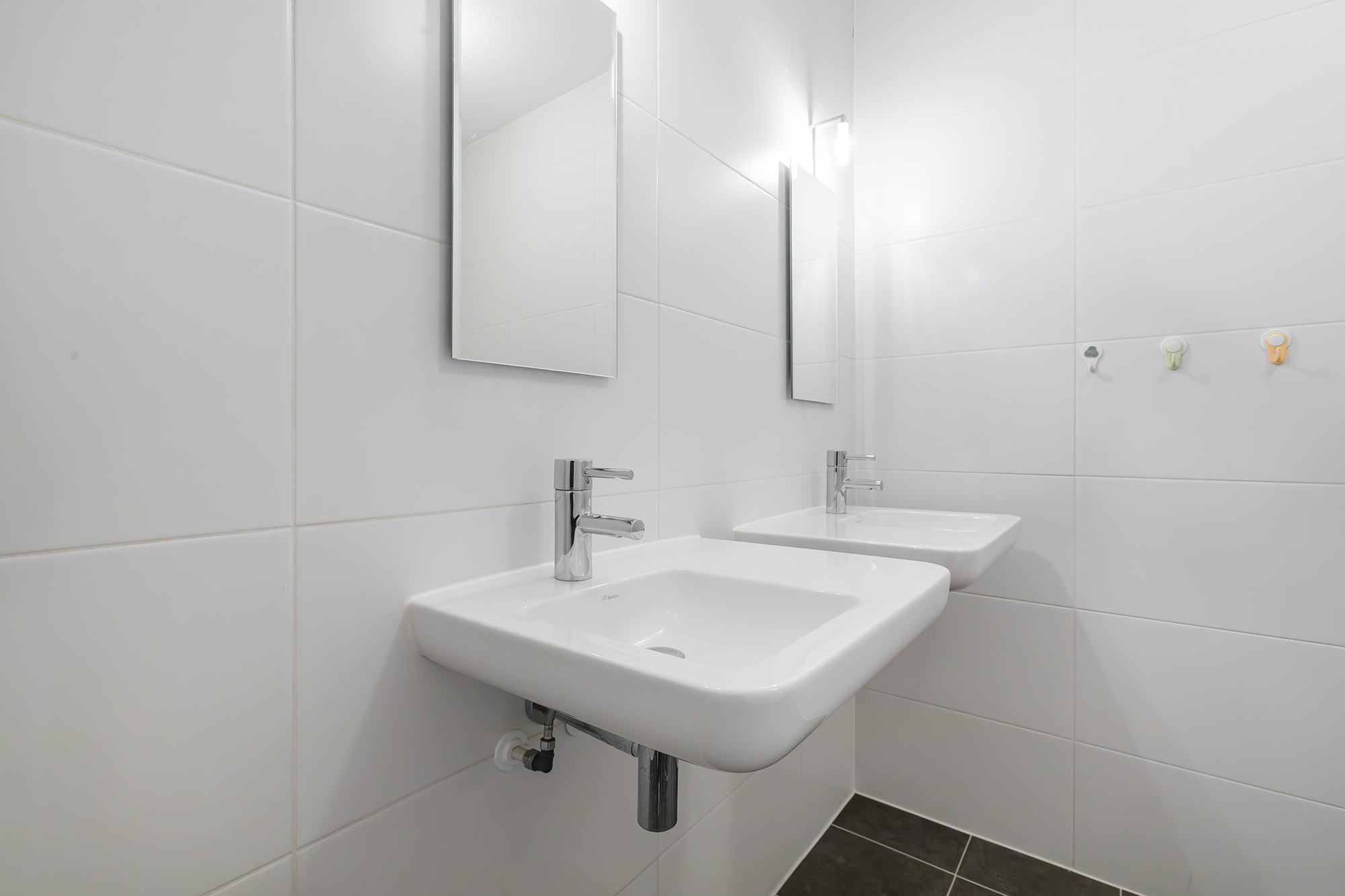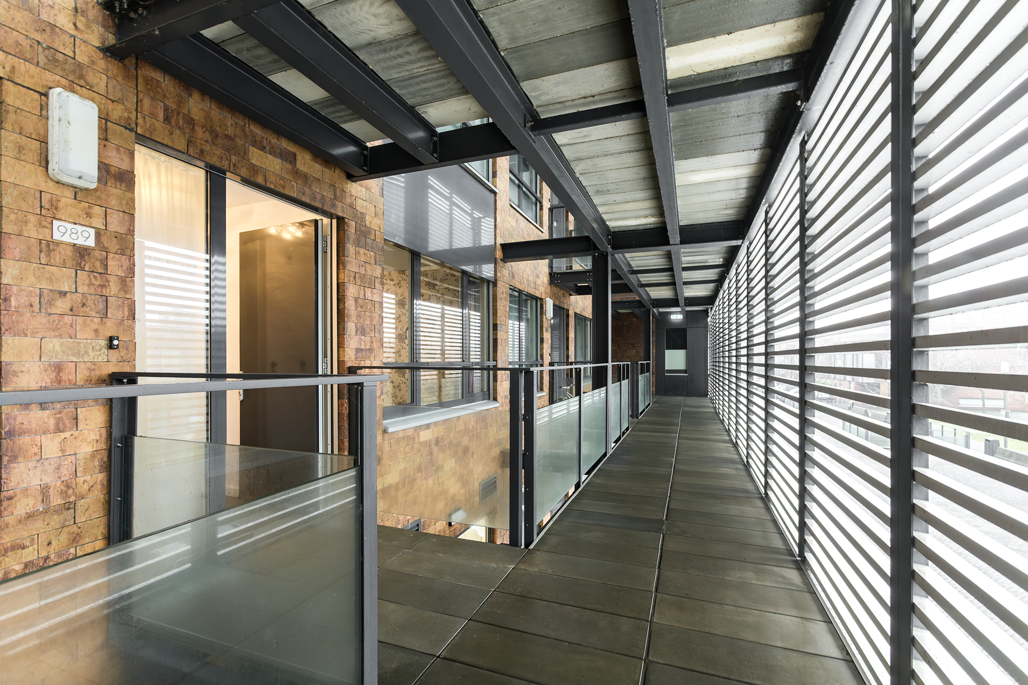 Aan de galerijzijde liggen twee slaapkamers. De badkamer is uitgerust met een dubbele wastafel en een ruime douche. Het toilet is separaat en er is een handige bergkast met de wasmachineaansluiting.