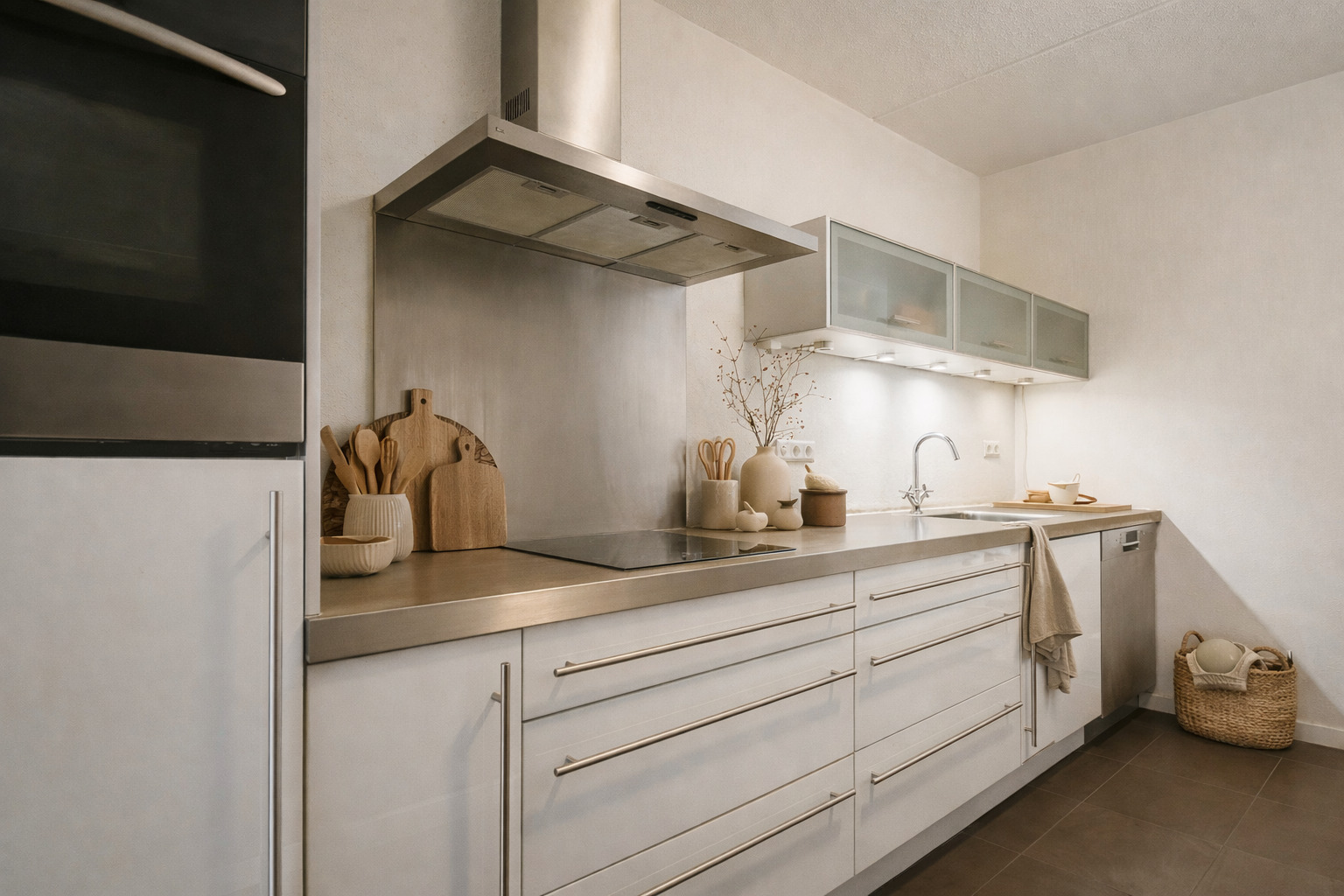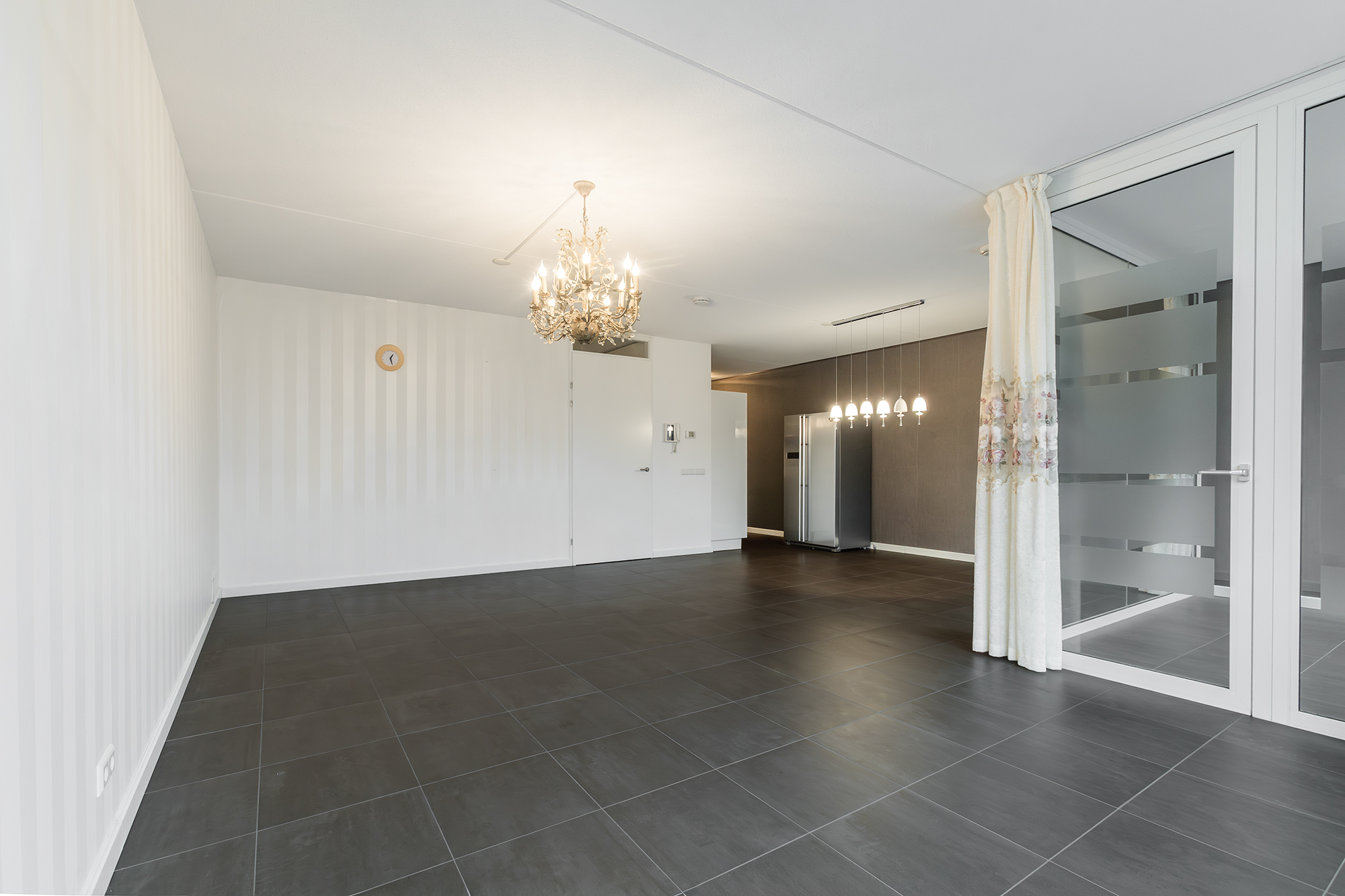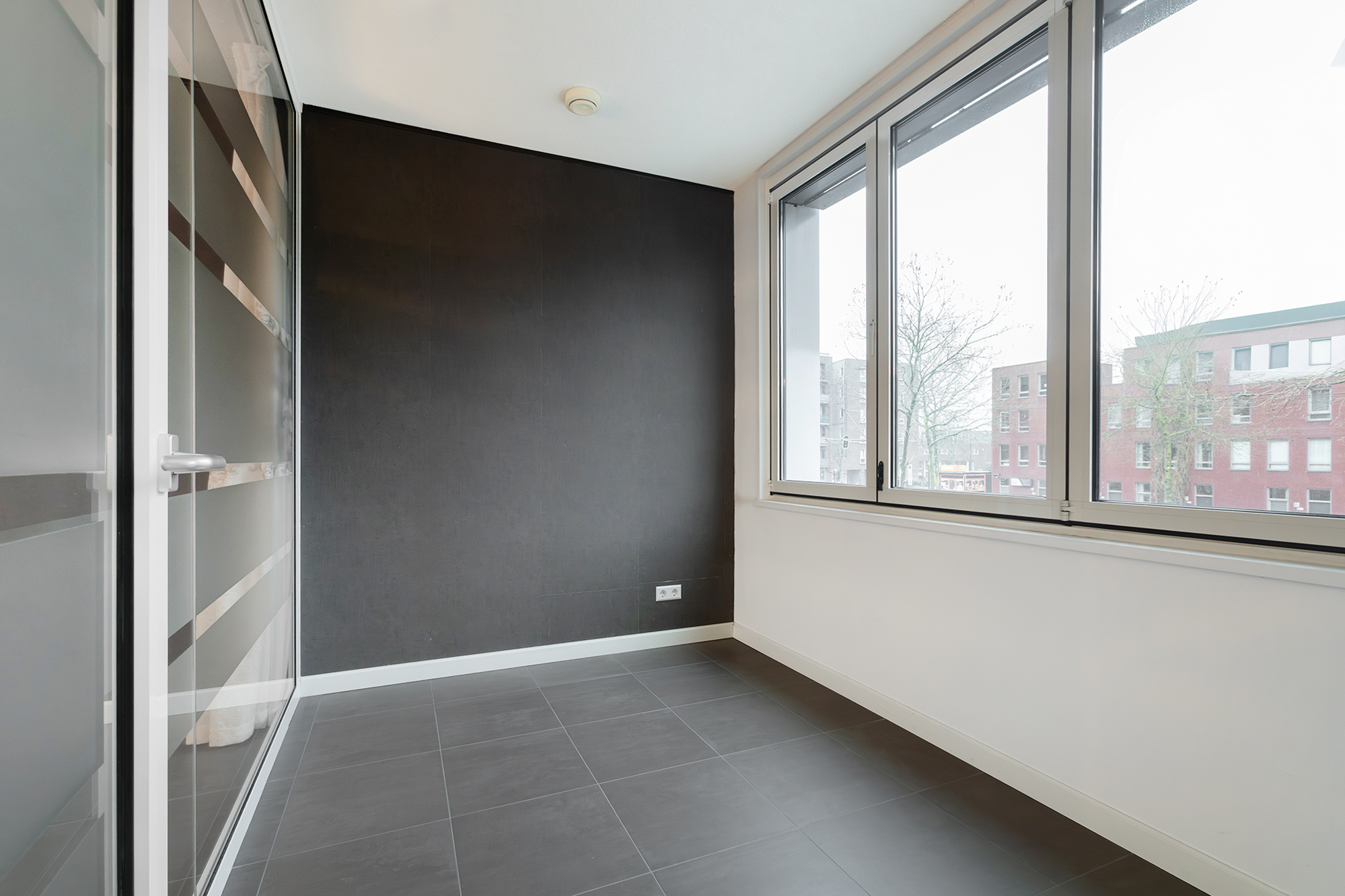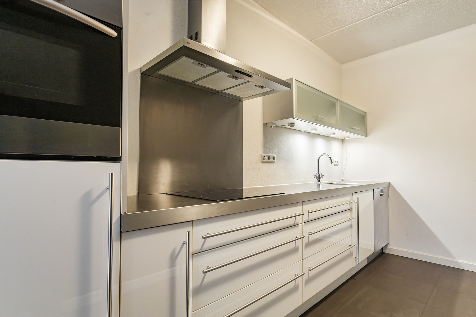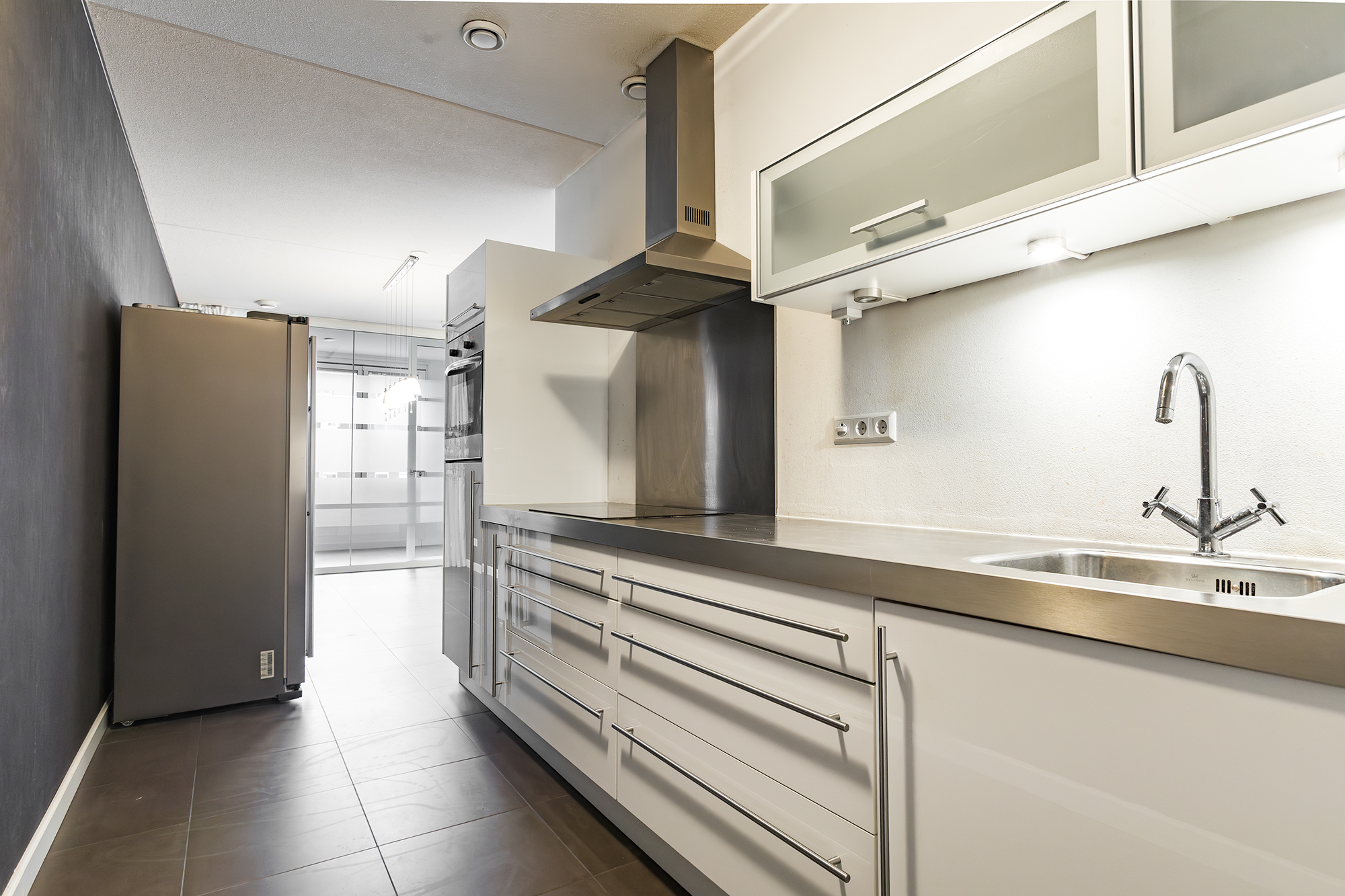 De woonkamer ligt aan de achterzijde en is heerlijk licht. De donkere tegelvloer in combinatie met de vloerverwarming geeft de ruimte een moderne en comfortabele uitstraling. Via de schuifdeur stap je zo de loggia op, gelegen op het zonnige zuiden. De halfopen keuken is voorzien van een koelruimte, keramische kookplaat, oven en een Bosch-vaatwasser. De ingebouwde koelkast heeft alleen een koelgedeelte; de losse Amerikaanse koelkast met vriezer is eventueel ter overname.
