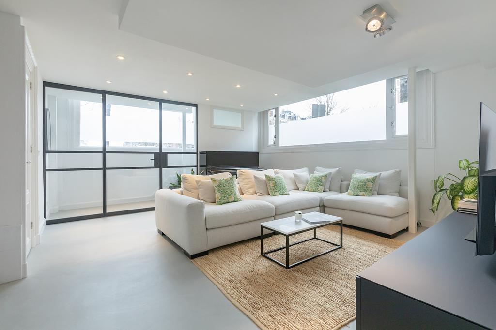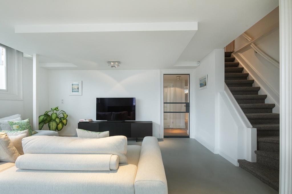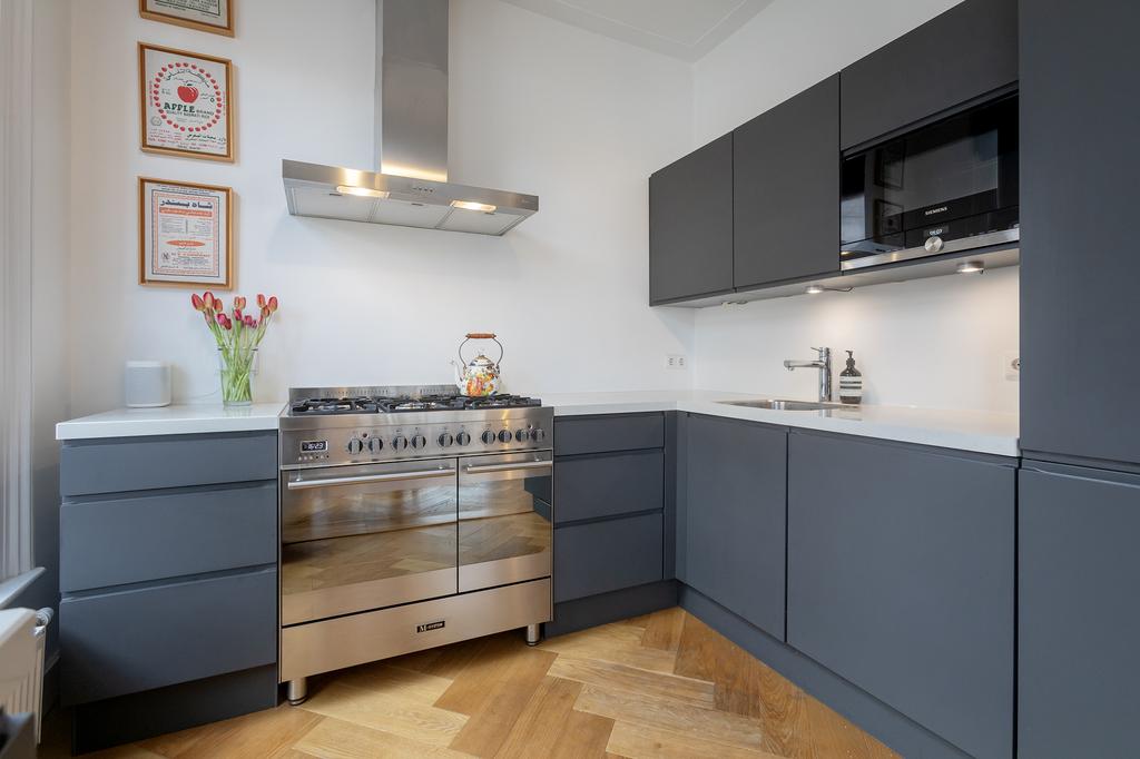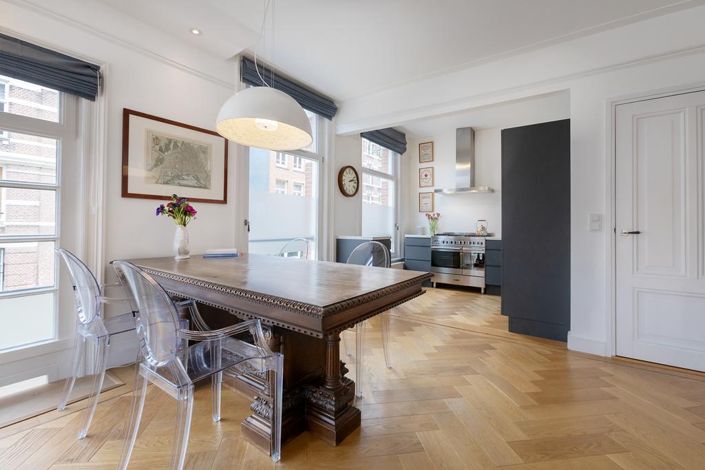 De woonkamer op de eerste verdieping vormt het hart van de woning en biedt een adembenemend uitzicht over de Da Costakade en Jacob van Lennepkade. De diepe, lichte ruimte heeft grote ramen met uitzicht op het water en een deur met Frans balkon. De woonkamer beschikt over een prachtige eiken visgraatvloer, hoge plafonds met ingebouwde verlichting en stijlvolle stalen deuren die het karakter van het huis versterken. De open hoekkeuken in matgrijs is uitgerust met hoogwaardige apparatuur en sluit naadloos aan op de woonruimte.