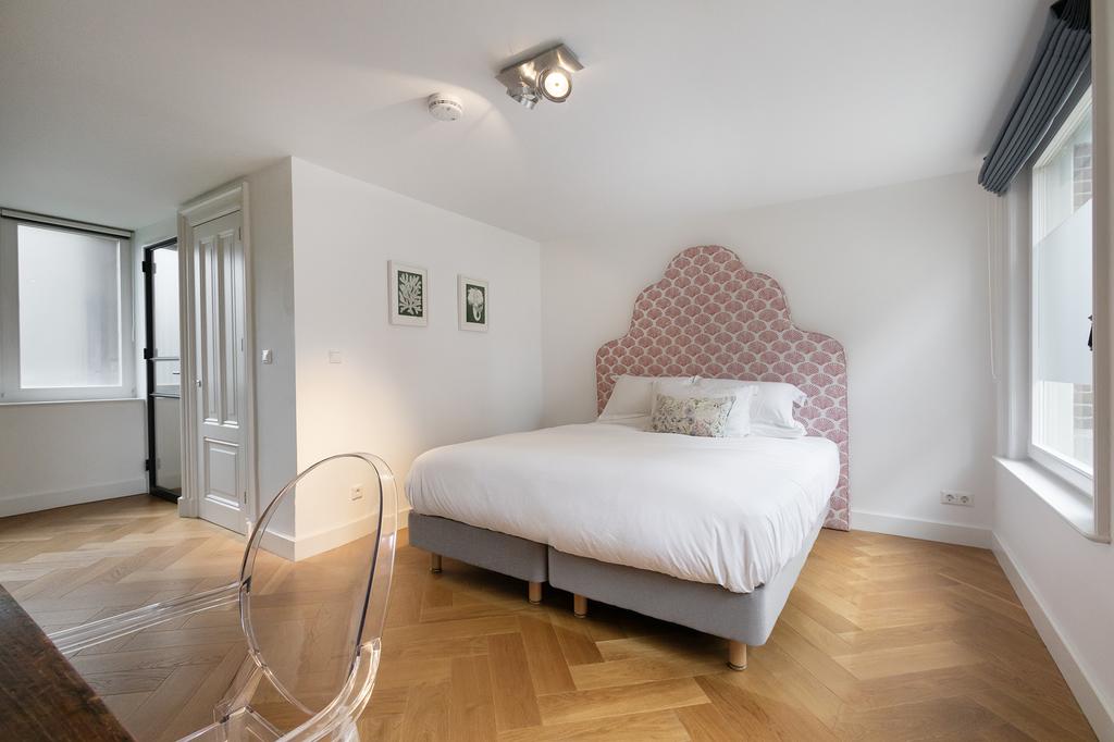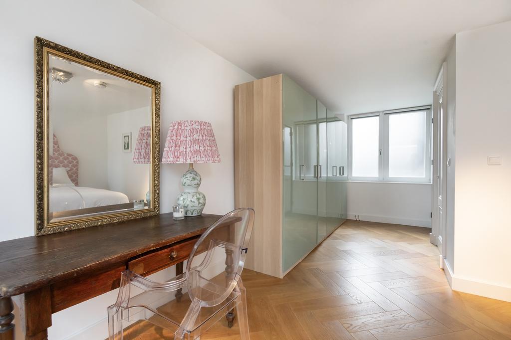The living room on the first floor forms the heart of the home and offers breathtaking views over Da Costakade and Jacob van Lennepkade. The deep, bright space has large windows overlooking the water and a door with a French balcony. The living room features beautiful oak herringbone flooring, high ceilings with built-in lighting, and stylish steel doors that enhance the character of the house. The open corner kitchen in matte gray is equipped with high-quality appliances and seamlessly integrates with the living space.