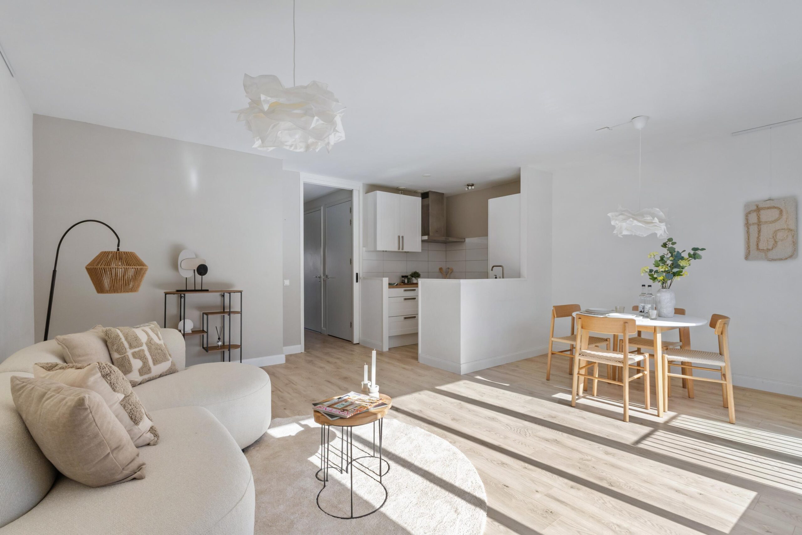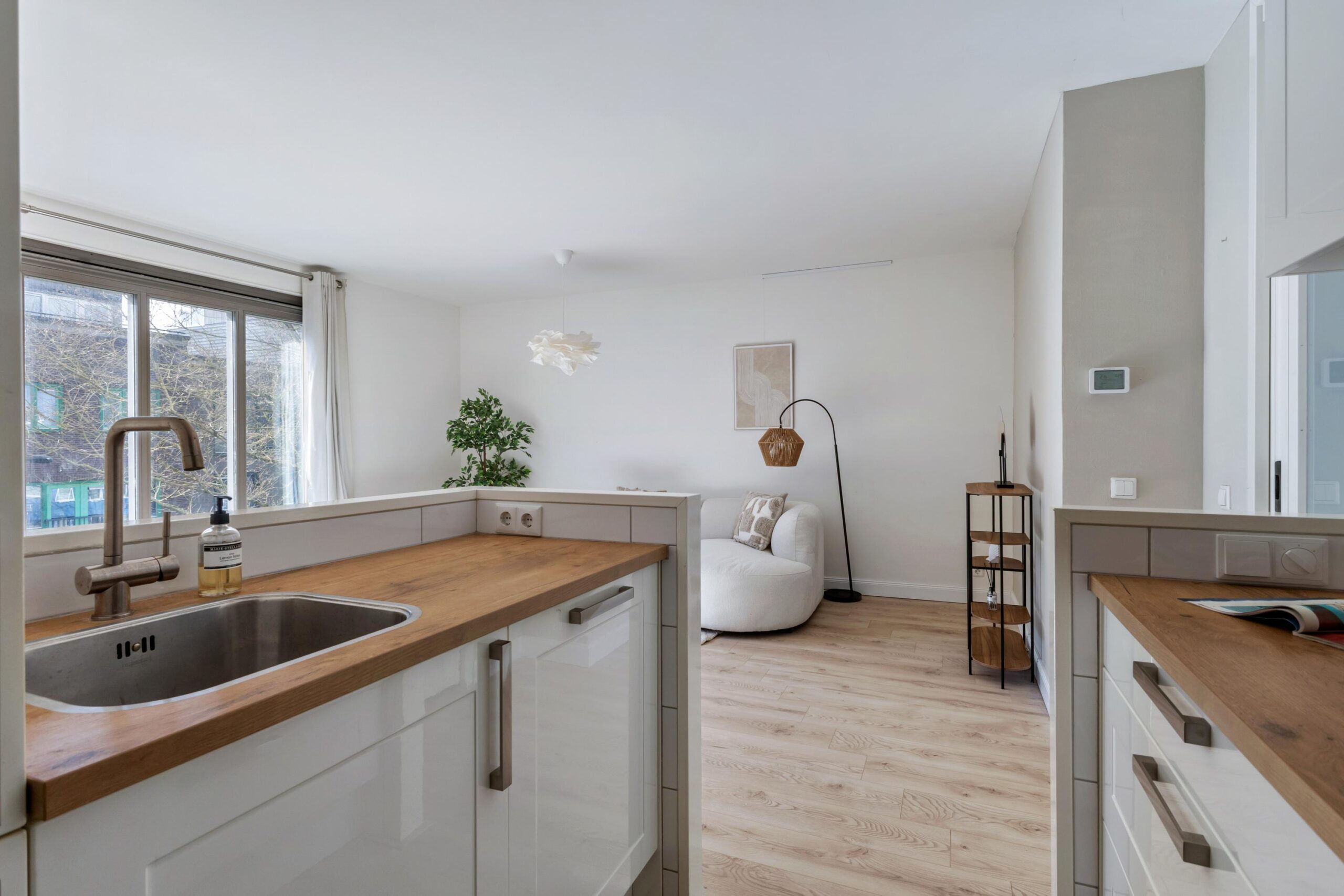 Aan de voorzijde ligt de woonkamer met open keuken. Dankzij de grote raampartijen over bijna de gehele breedte van de woning is dit een fijne, lichte ruimte. Er is voldoende plek voor een comfortabele zithoek en een eettafel.